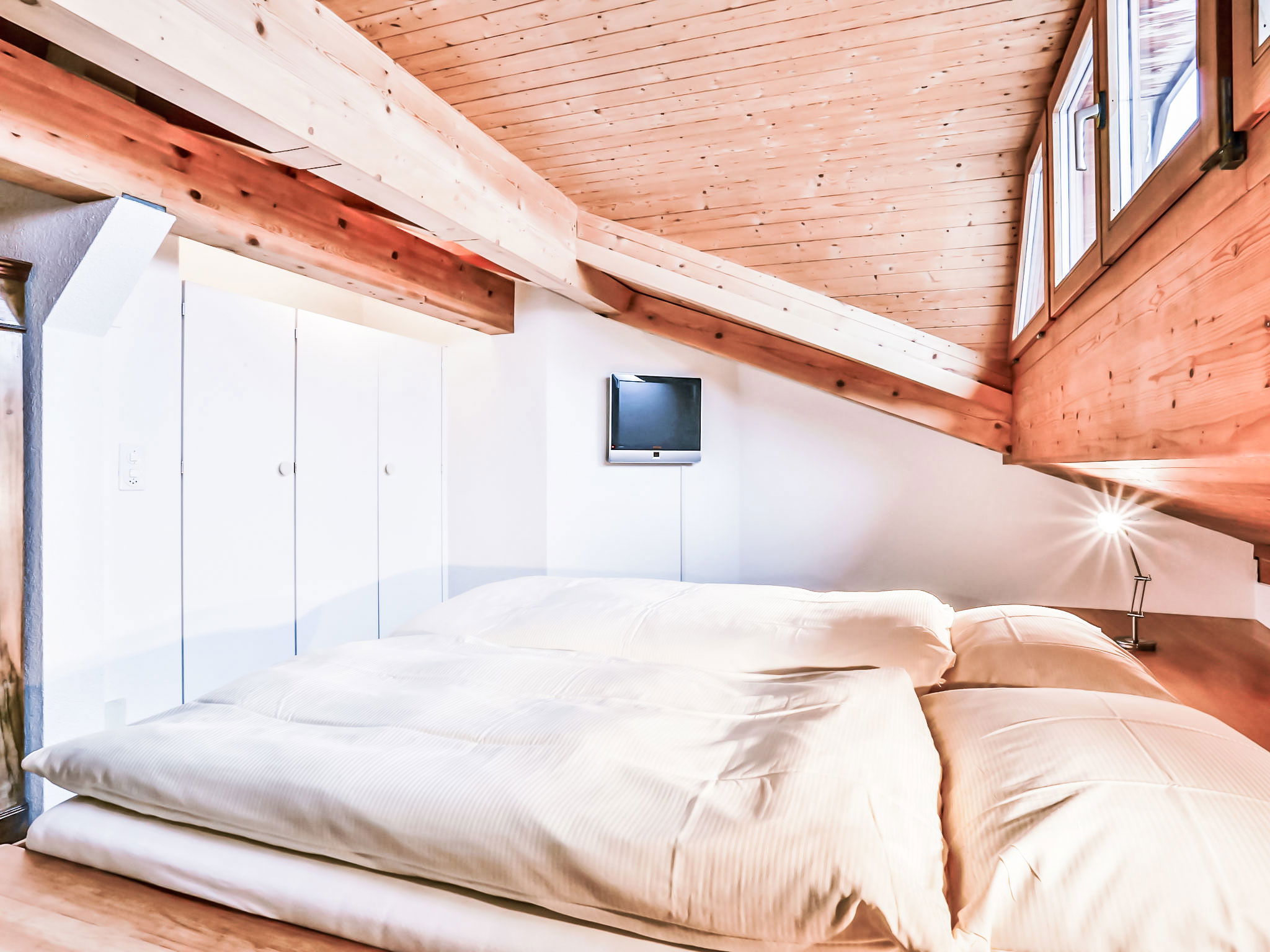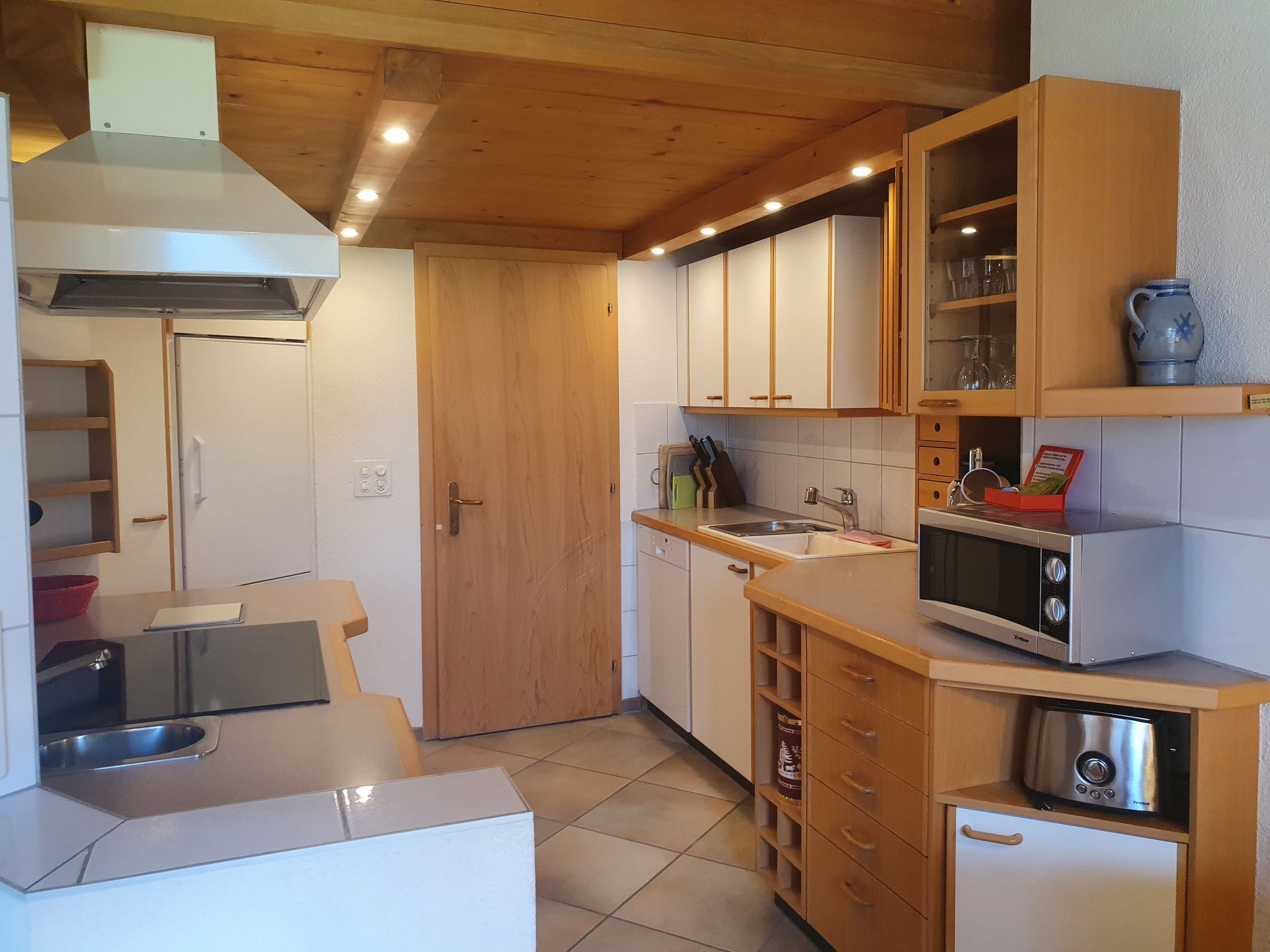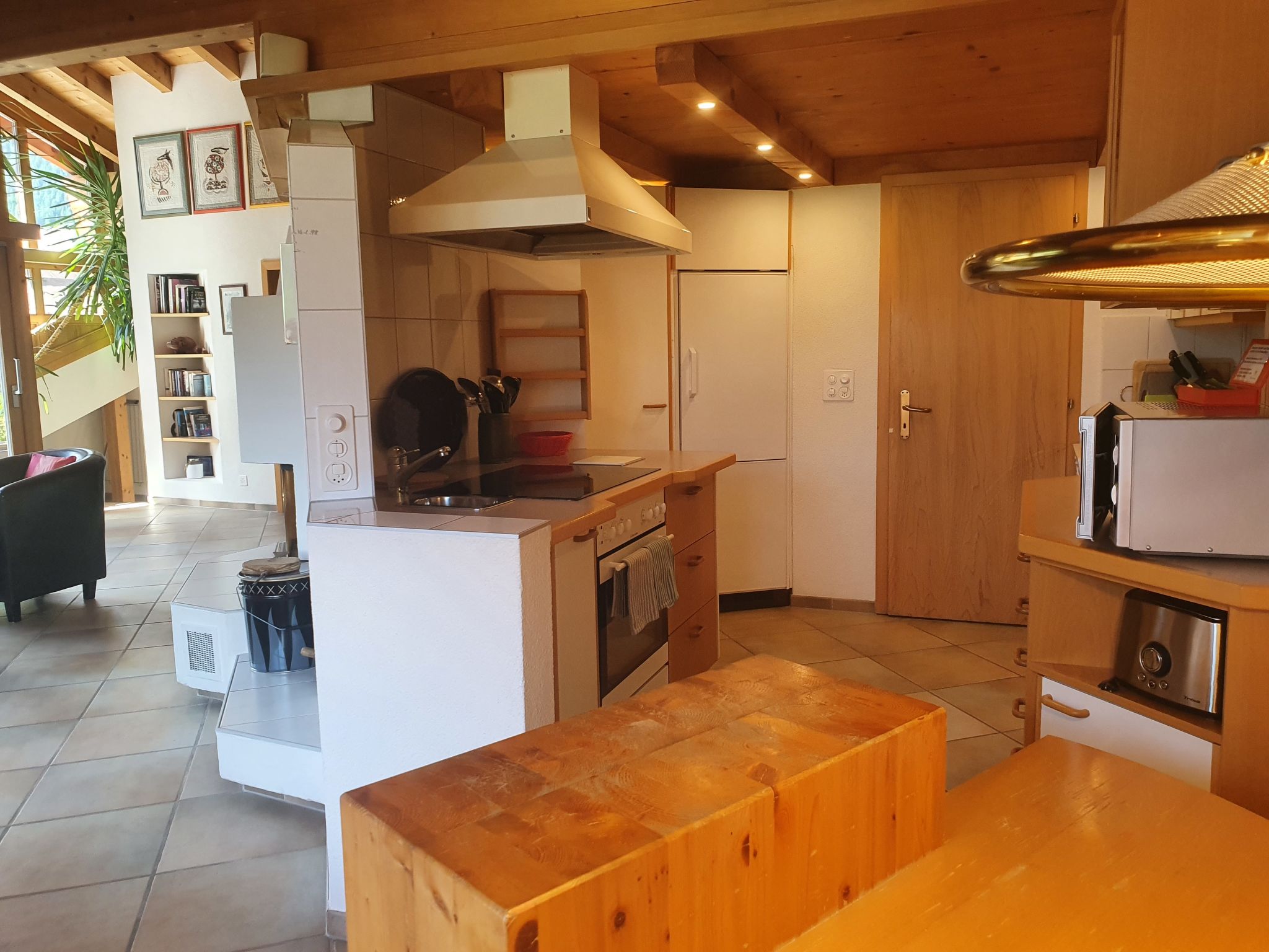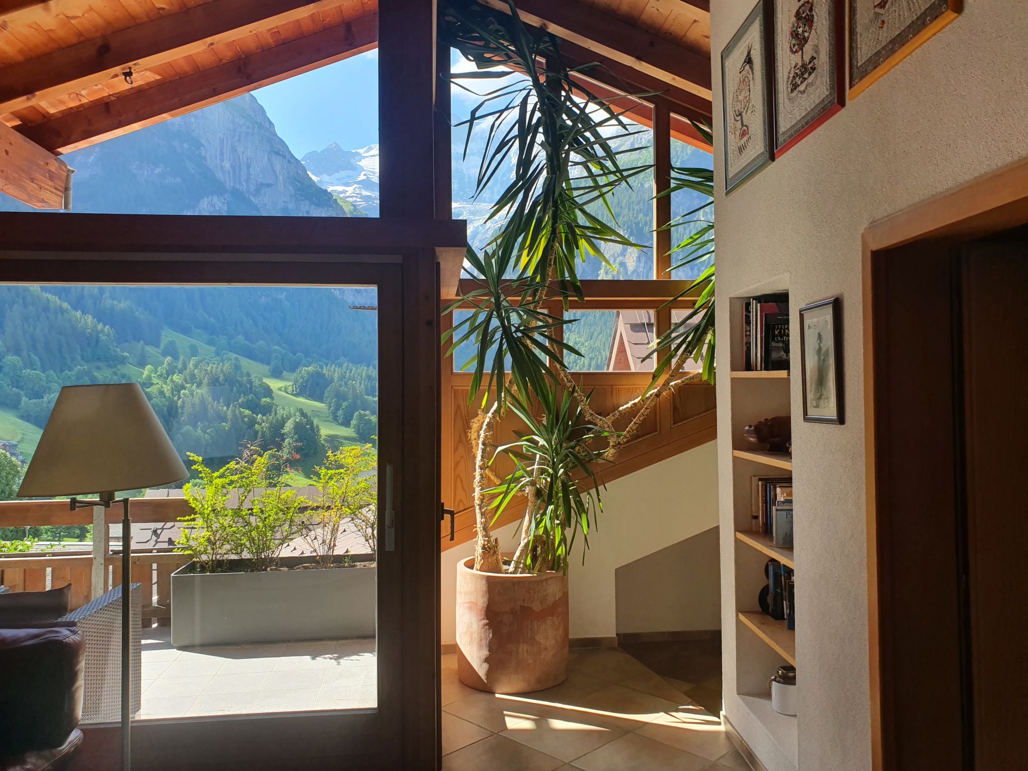 4-room apartment 124 m2, on the top floor. Partly with sloping ceilings, comfortable and cosy furnishings: living/dining room with open-hearth fireplace and cable TV (flat screen). Exit to the balcony, south facing position. 1 room with 1 french bed (180 cm, length 200 cm). 1 room with 1 french bed (140 cm, length 200 cm). 1 double bedroom with 2 beds (90 cm, length 190 cm), bath/shower/WC and cable TV. Open kitchen (oven, dishwasher, 4 ceramic glass hob hotplates, toaster, kettle, microwave, electric coffee machine, Capsules for coffee machine (Nespresso) extra). Bath/WC, sep. WC. Balcony 16 m2, south facing position. Terrace furniture. Marvellous view of the mountains and Eiger. Facilities: hair dryer. Internet (WiFi, free). Please note: non-smokers only. Maximum 1 pet/ dog allowed. A fondue set (meat or cheese) and a raclette oven can be borrowed from reception. Access to the apartment by elevator and stairs.