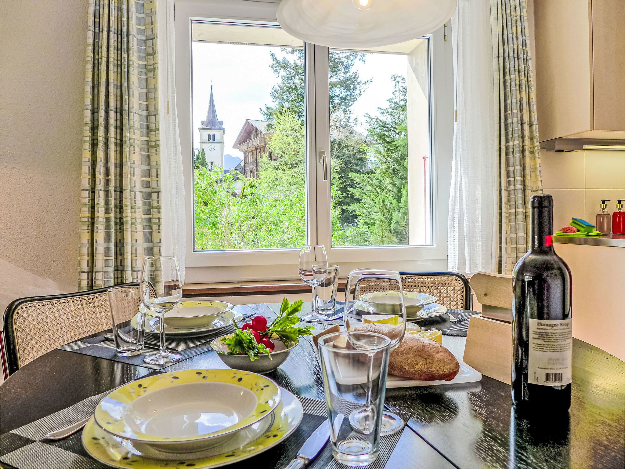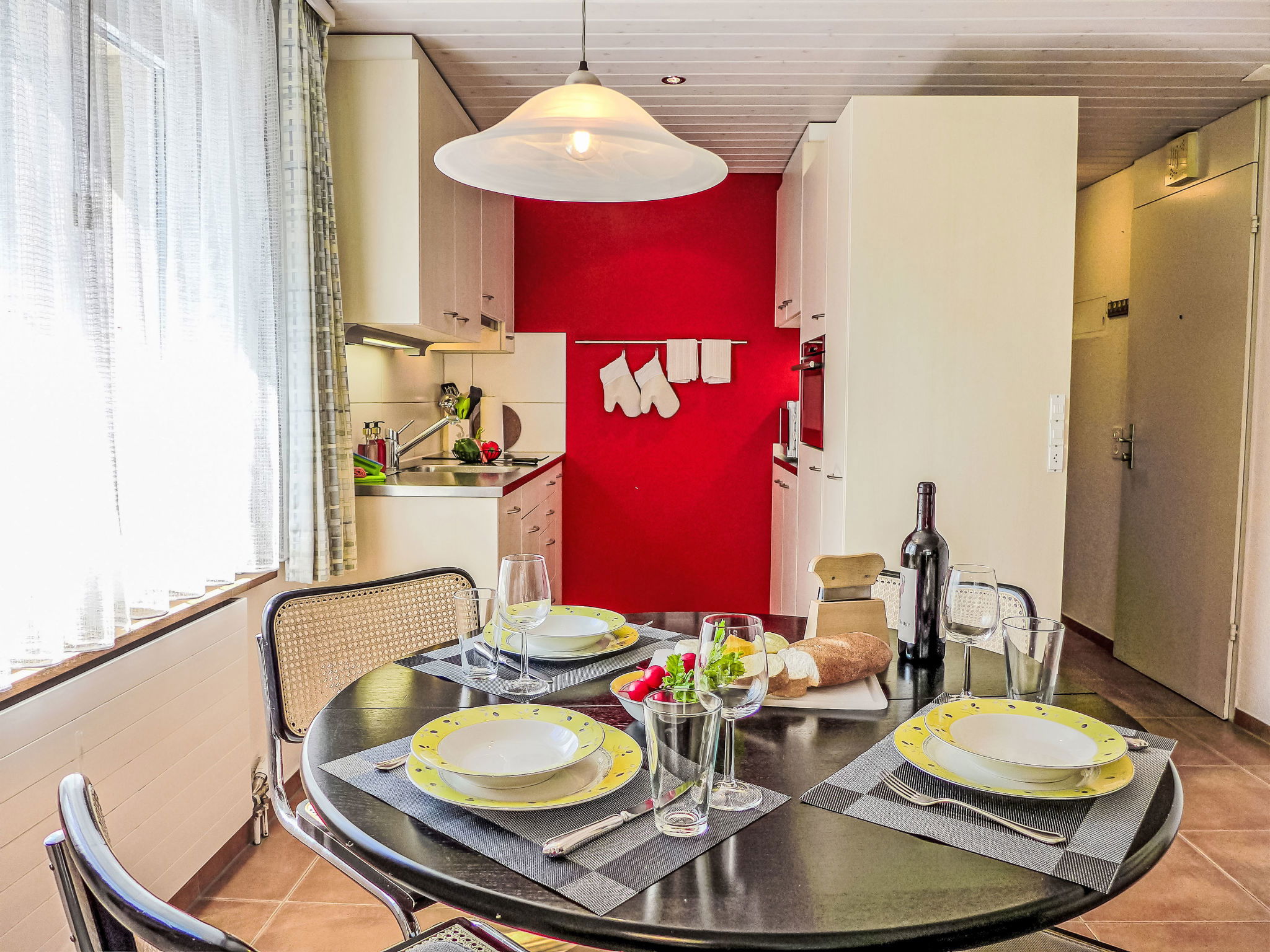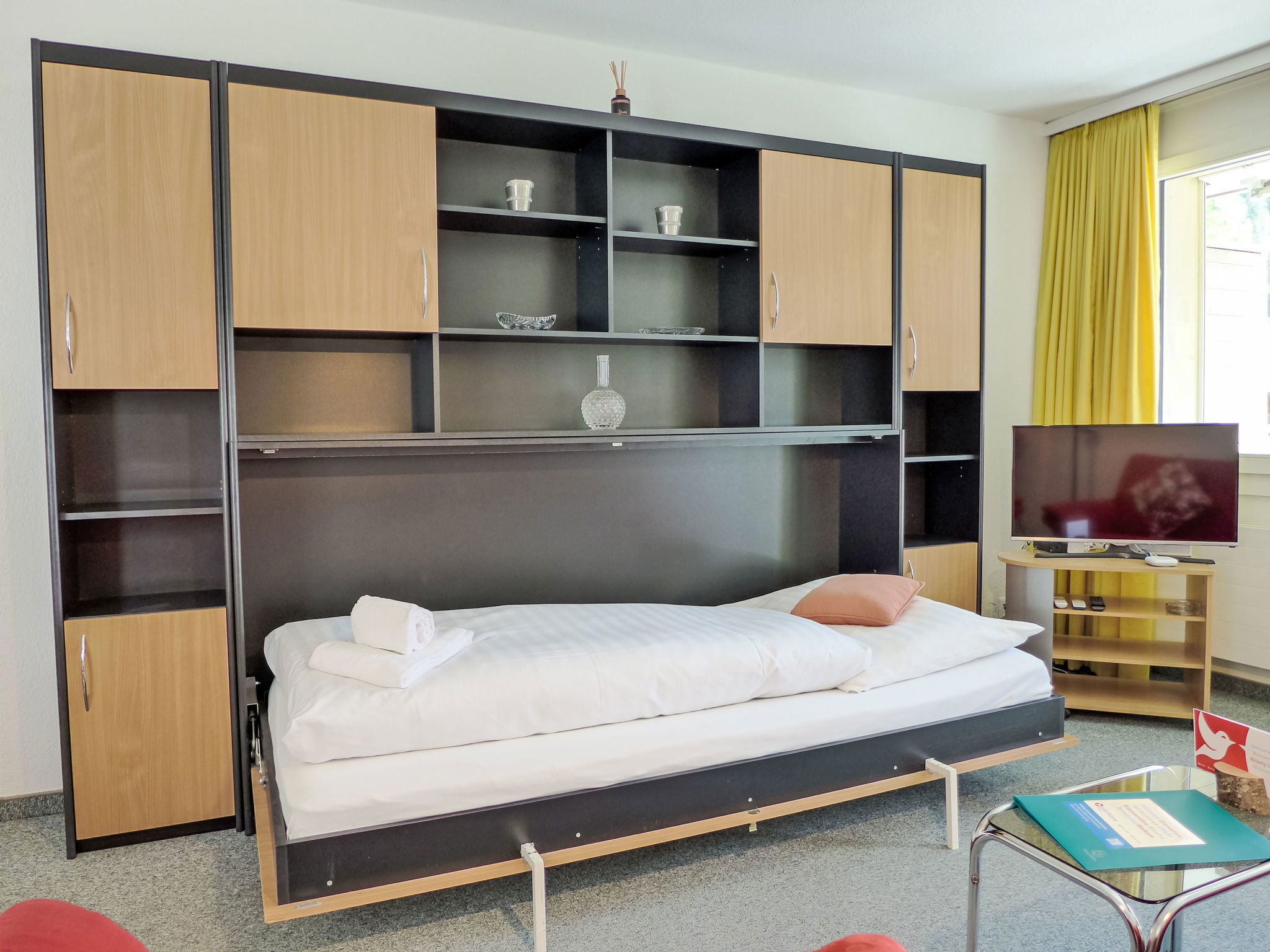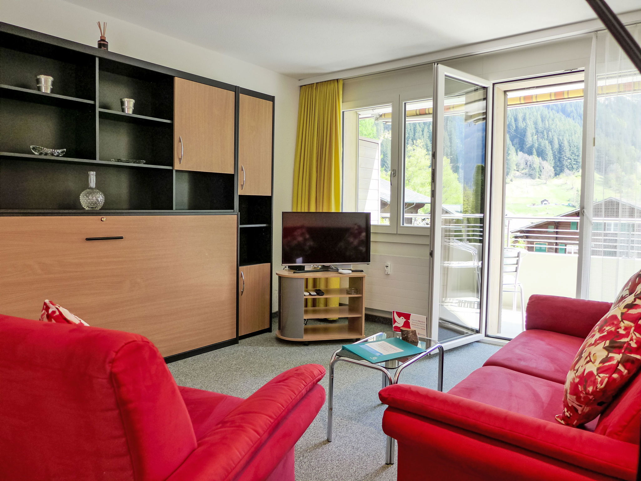 2-room apartment 40 m2 on 1st floor, south facing position. Bright, practical and cosy furnishings: open living/sleeping room with 1 wall-trunk bed (90 cm, length 200 cm), dining table and satellite TV. Exit to the balcony. 1 room with 1 double bed (2 x 90 cm, length 200 cm). Open kitchen (oven, dishwasher, 2 ceramic glass hob hotplates, toaster, kettle, microwave, electric coffee machine, raclette grill, fondue Set (cheese)). Bath/WC. Carpet. Balcony, south facing position. Balcony furniture. Marvellous view of the mountains and the countryside. Facilities: hair dryer. Internet (WiFi, free). Parking at the house. Maximum 1 pet/ dog allowed.