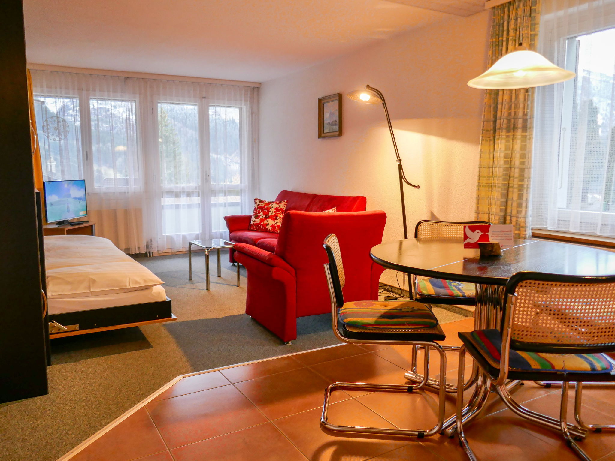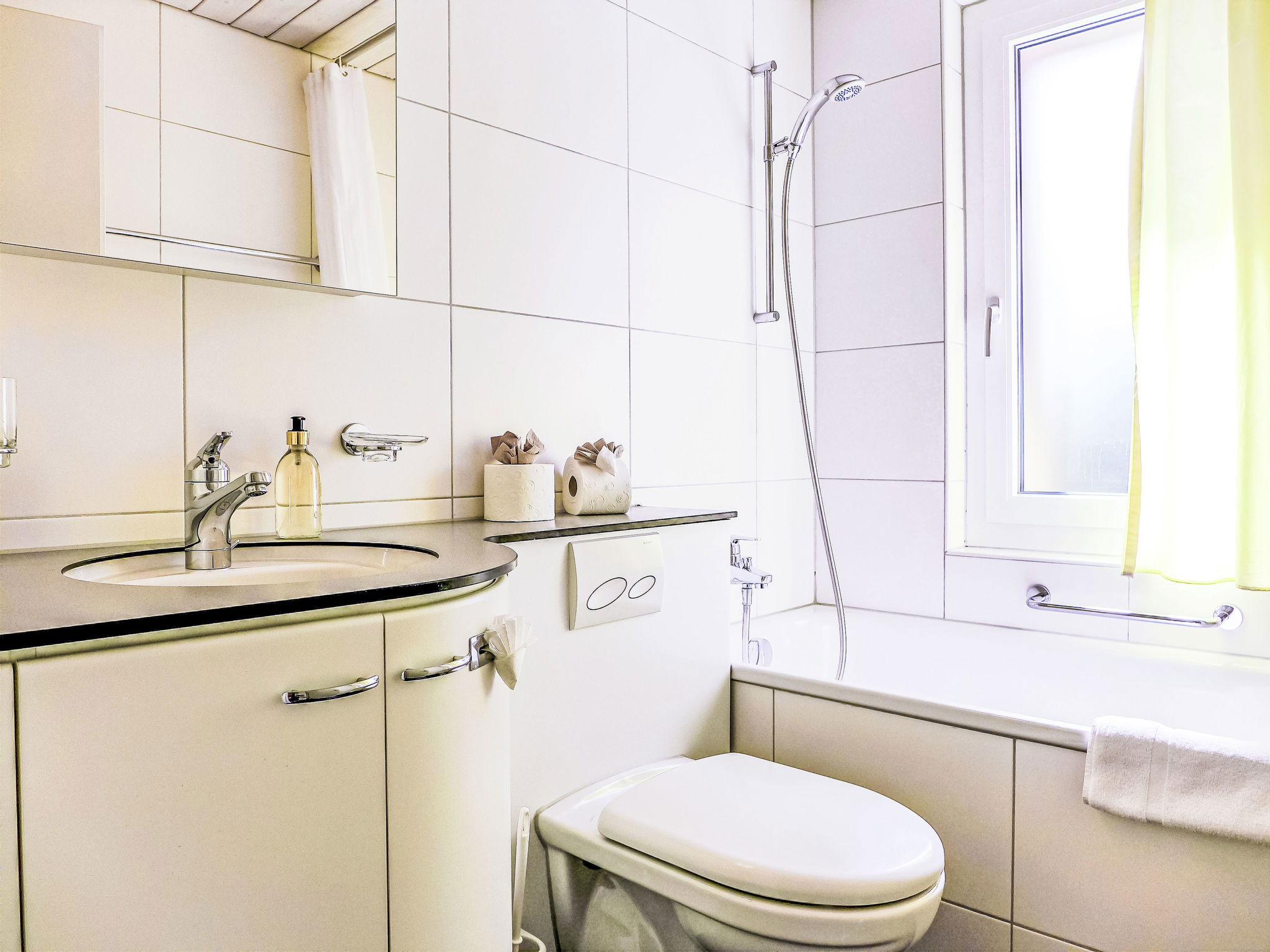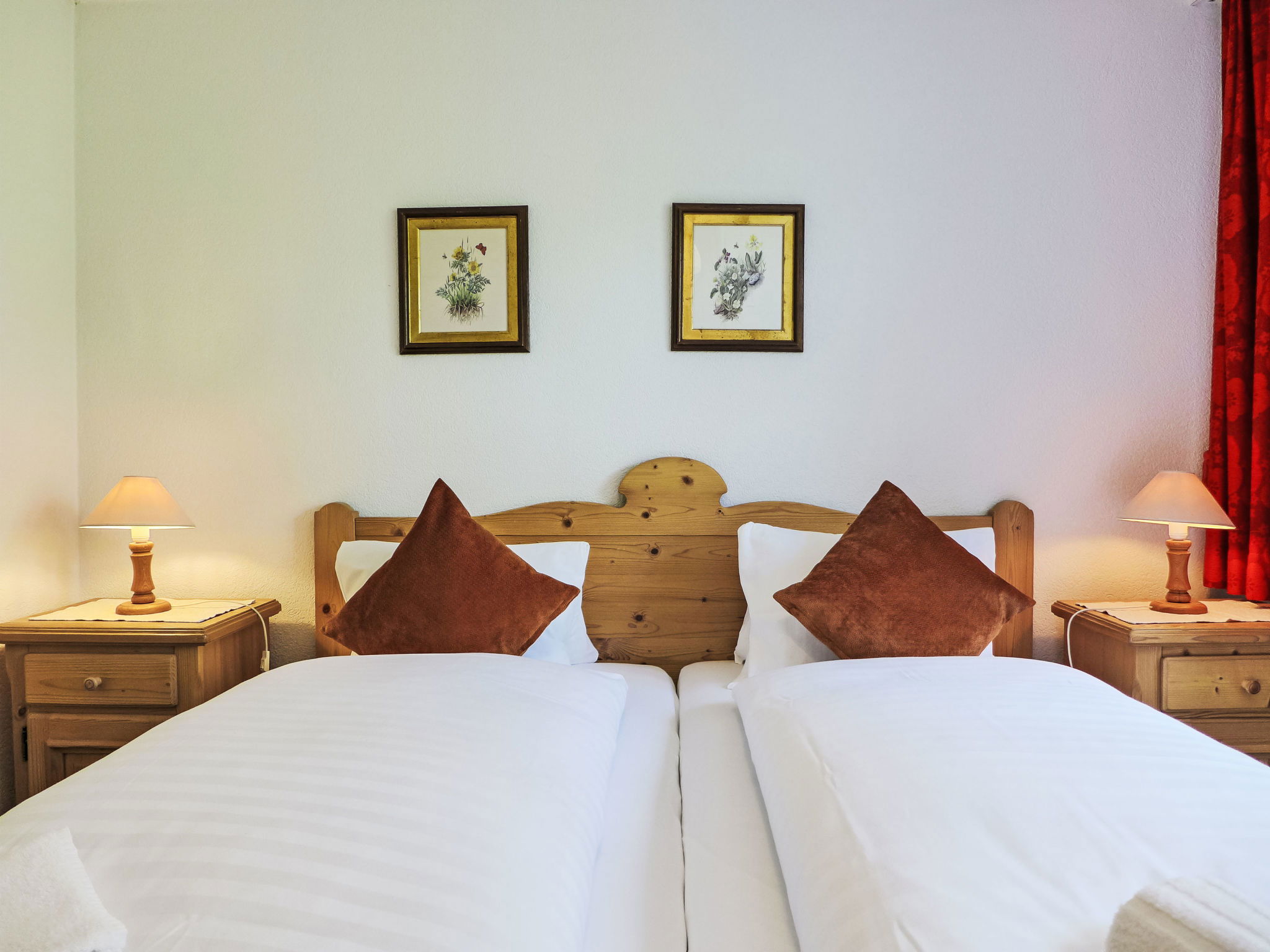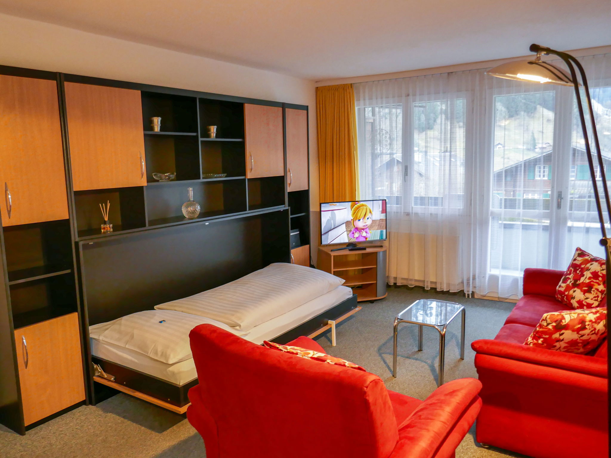 2-room apartment 40 m2 on 1st floor, south facing position. Bright, practical and cosy furnishings: open living/sleeping room with 1 wall-trunk bed (90 cm, length 200 cm), dining table and satellite TV. Exit to the balcony. 1 room with 1 double bed (2 x 90 cm, length 200 cm). Open kitchen (oven, dishwasher, 2 ceramic glass hob hotplates, toaster, kettle, microwave, electric coffee machine, raclette grill, fondue Set (cheese)). Bath/WC. Carpet. Balcony, south facing position. Balcony furniture. Marvellous view of the mountains and the countryside. Facilities: hair dryer. Internet (WiFi, free). Parking at the house. Maximum 1 pet/ dog allowed.