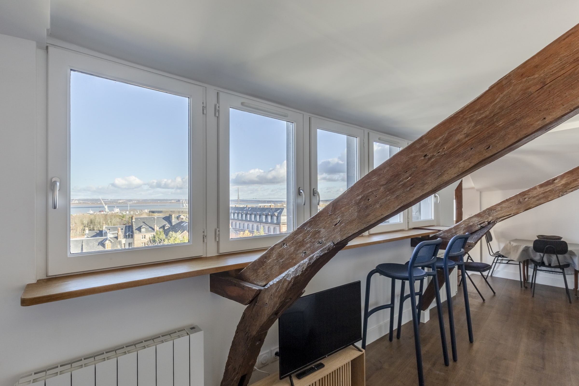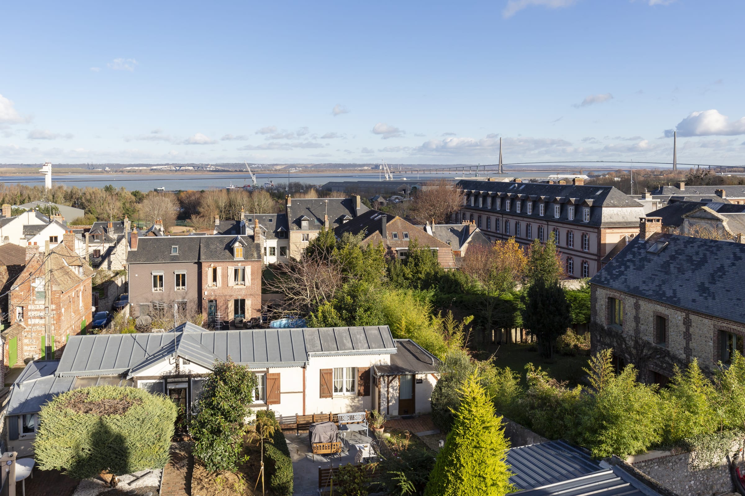 Admire the sublime panorama of the Seine and the Pont de Normandie, from the comfortable, open living room, with the charm of Norman beams and bathed in light.