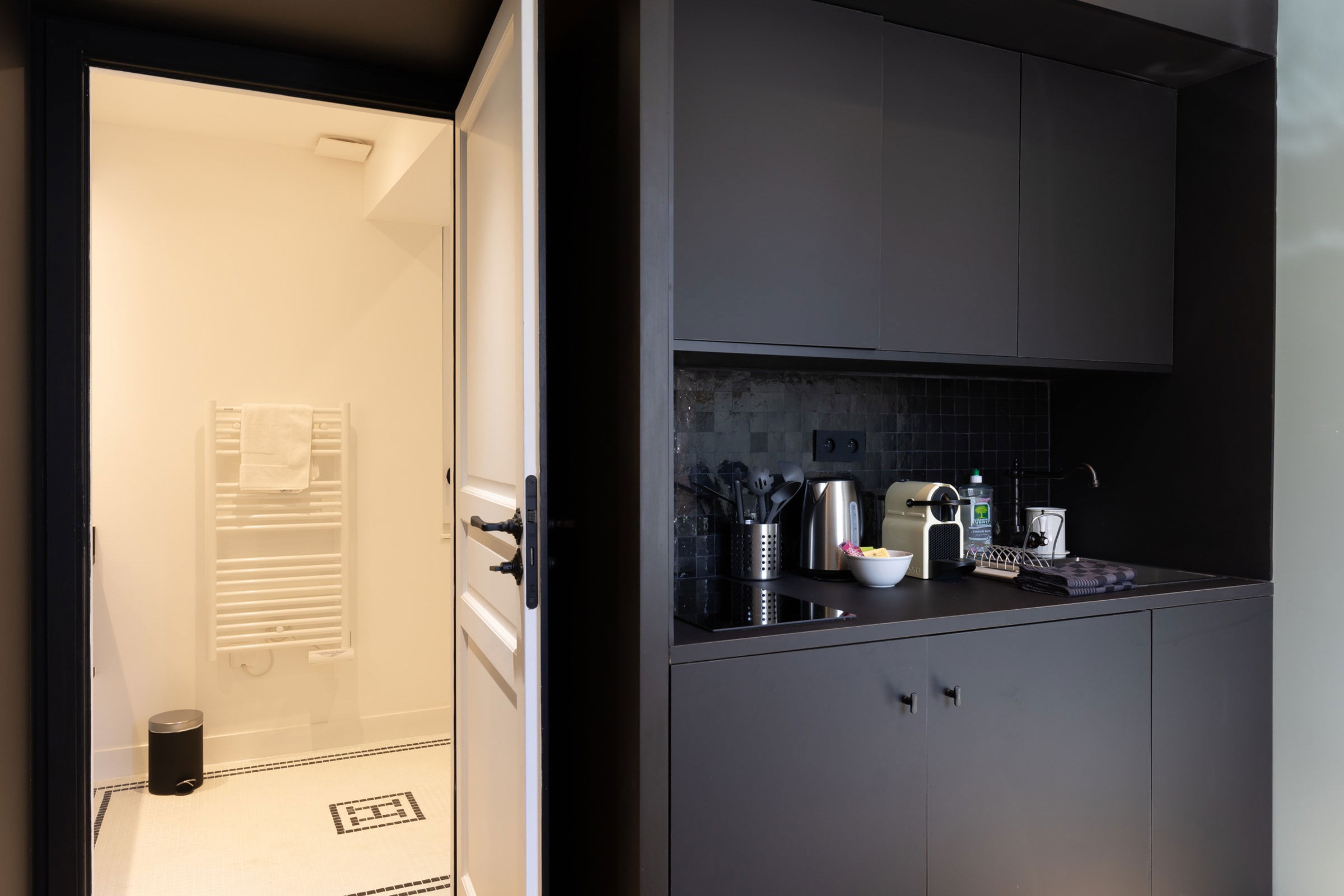 * 1 small kitchen & its well-equipped modern dining area (Nespresso coffee machine, toaster, hob, microwave, fridge).