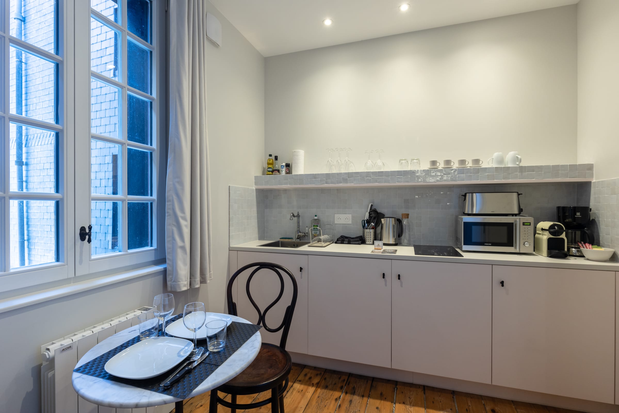 * 1 small kitchen & its well-equipped modern dining area (Nespresso coffee machine, toaster, hob, microwave, fridge).