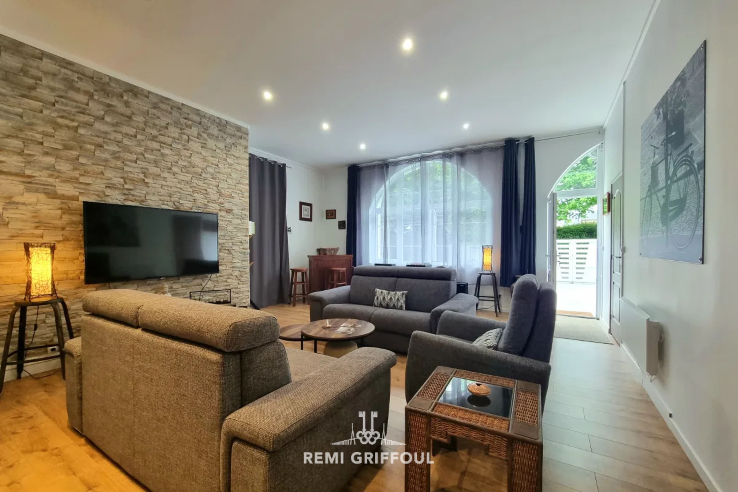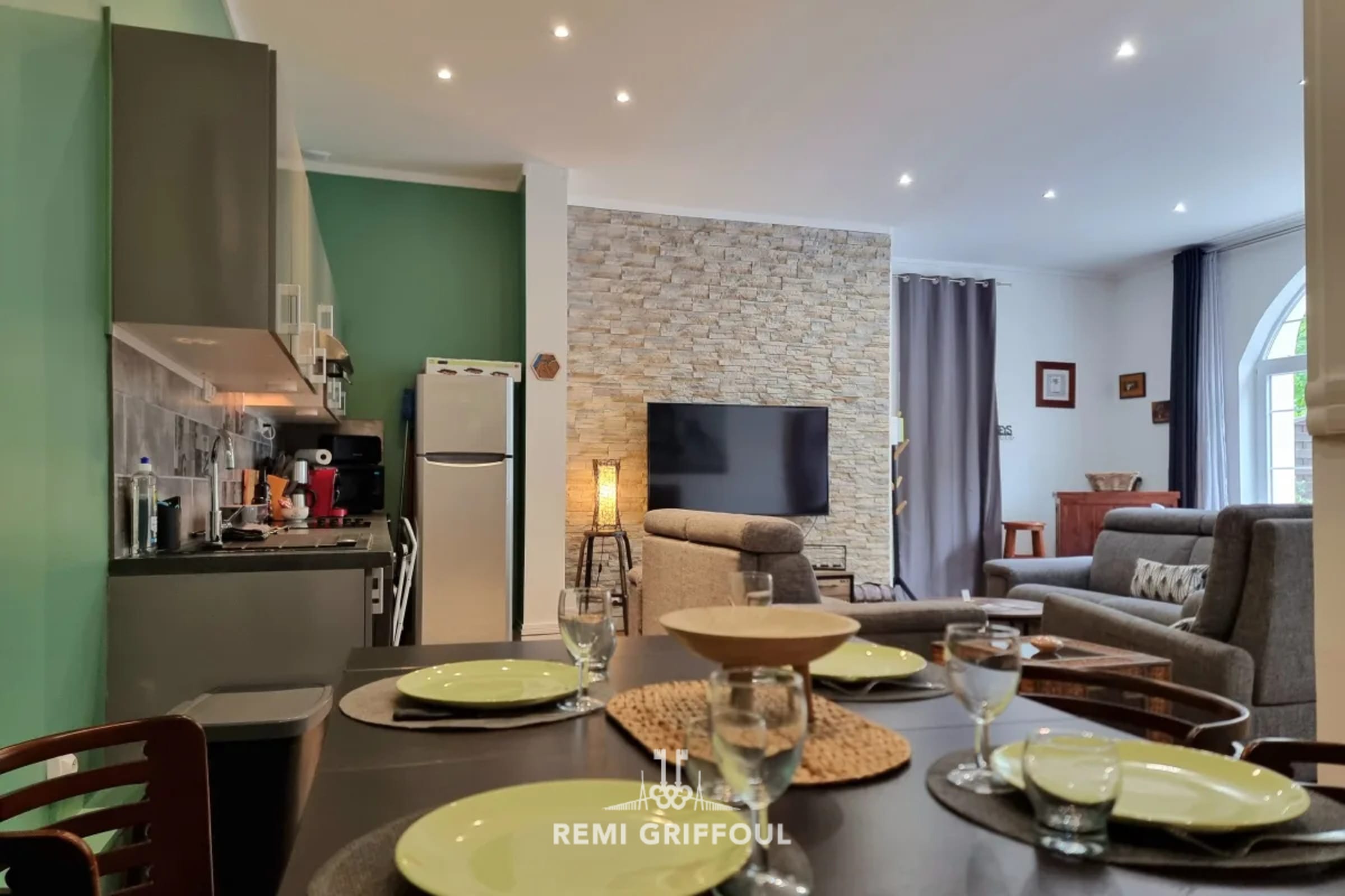 It has a very spacious double living room, with very high ceilings, its fully equipped American kitchen (fridge, microwave, oven, hotplates, Nespresso, and filter coffee maker, kettle, toaster, plancha, etc.). ...), is open to a dining area and a lounge/TV area