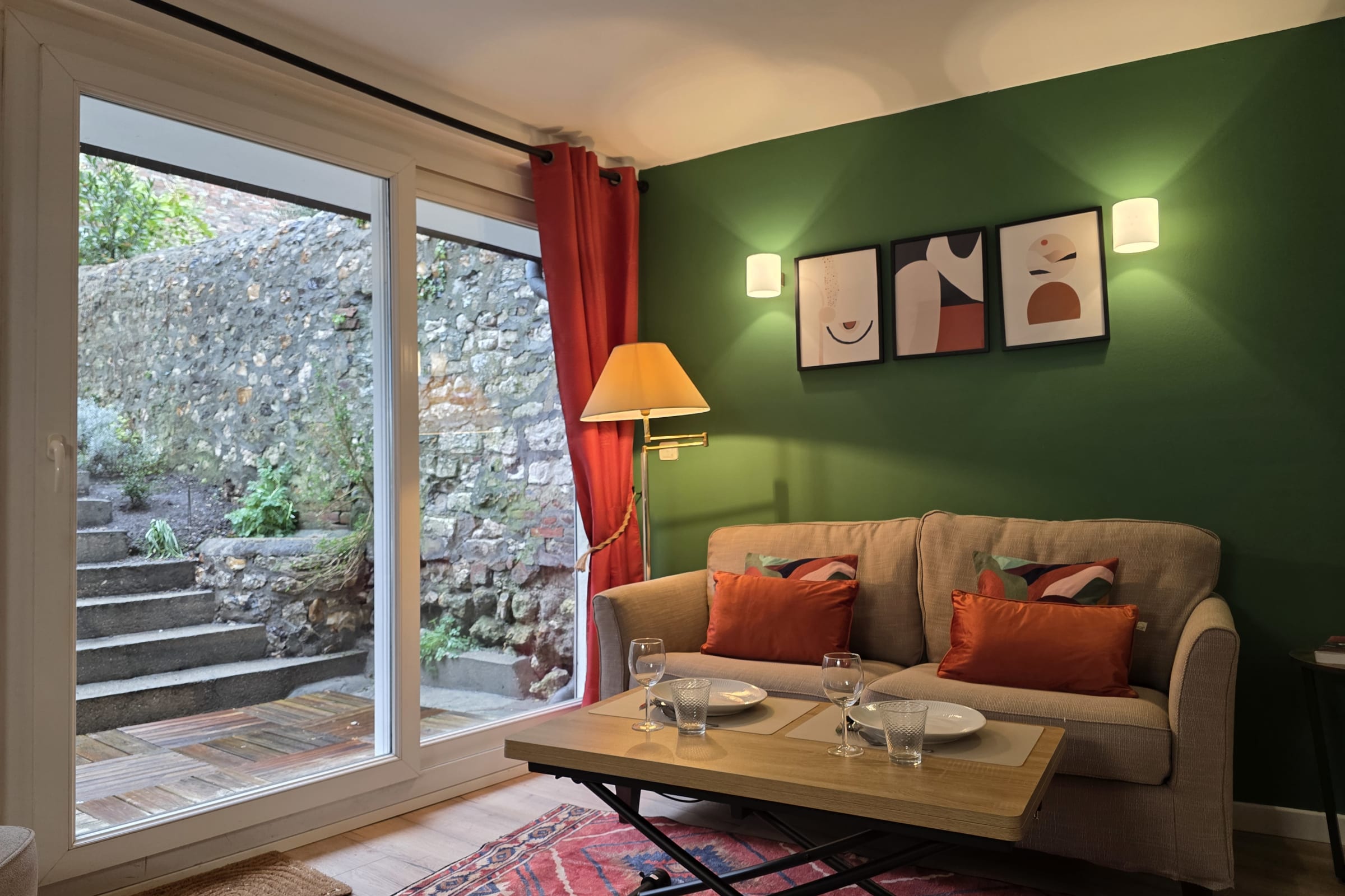 The height adjustable coffee table serves as a dining table and is ideal for both convivial meals and relaxed TV tray style dining. This cocooning setup is particularly appreciated by guests and perfectly suits the spirit of the apartment, as shown in the listing photos.