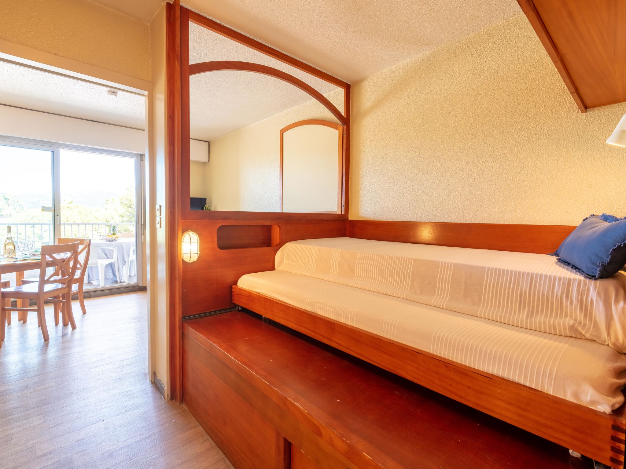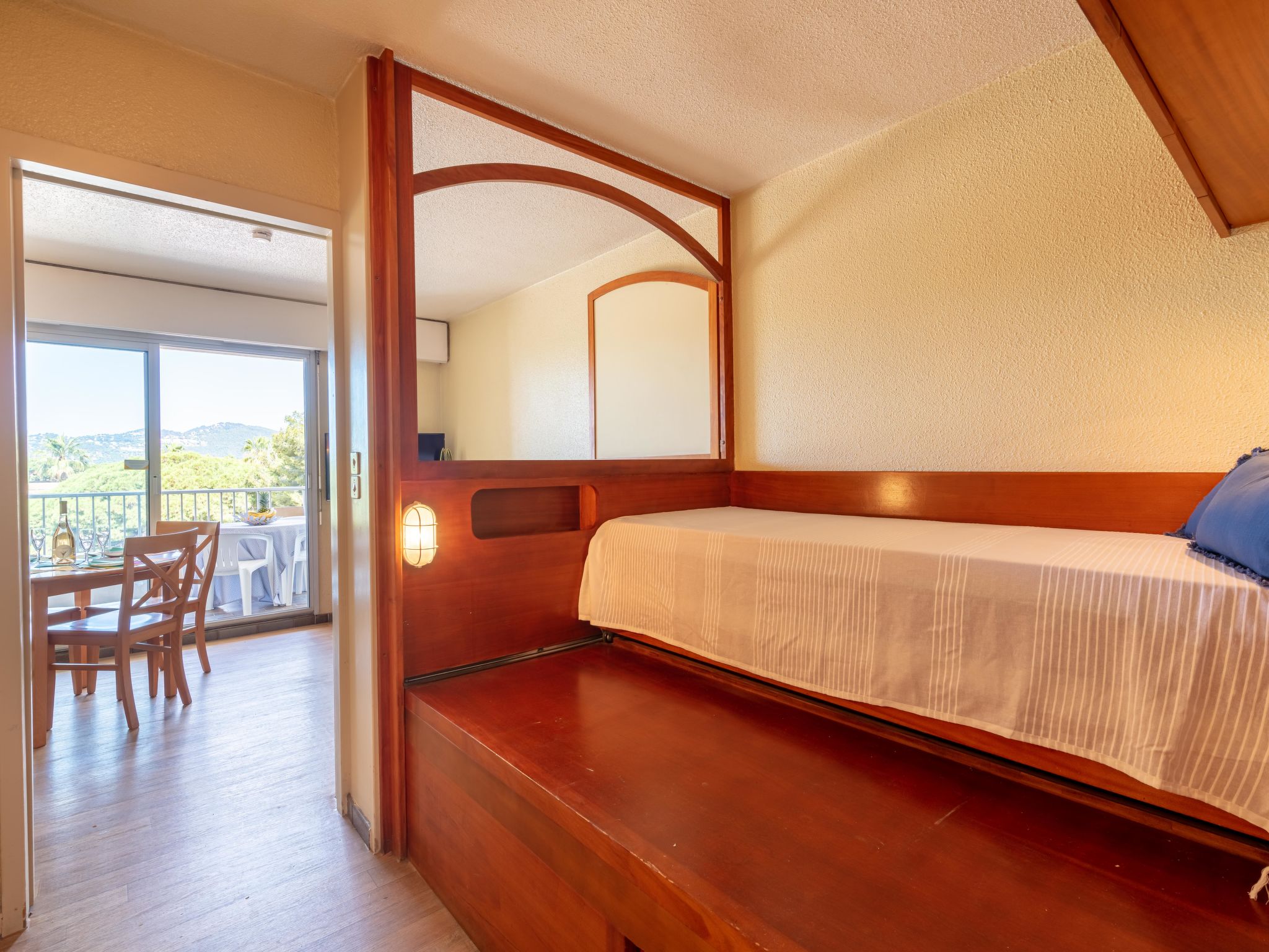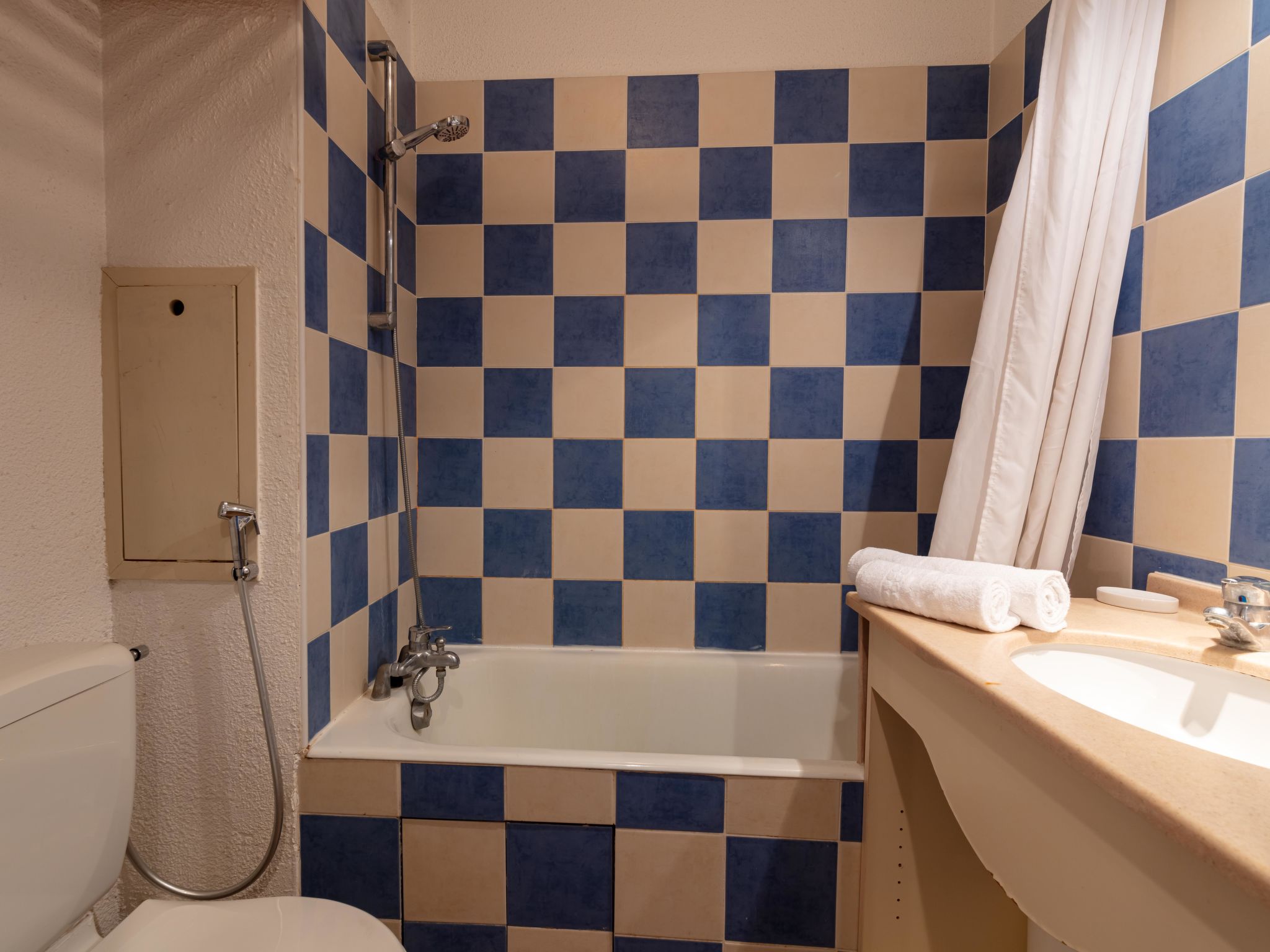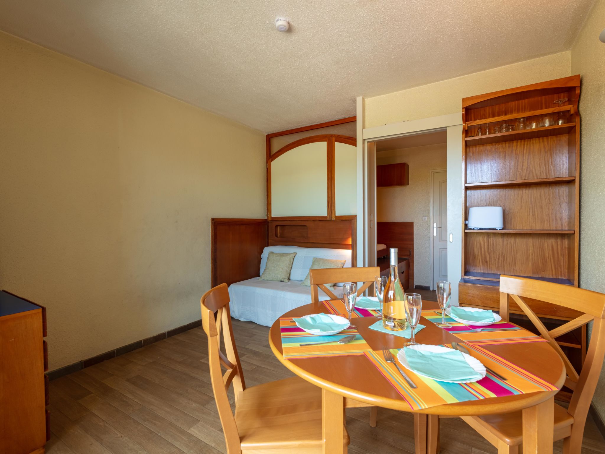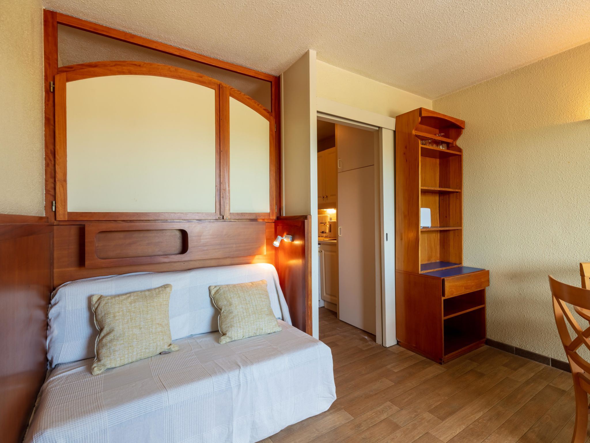 1-room studio 23 m2 on 3rd floor. Bright, comfortable furnishings: living/dining room with 1 double sofabed (140 cm, length 190 cm), dining table and TV (flat screen). Exit to the terrace. Sleeping alcove with curtain with 1 pull-out bed (2 pers. 2 x 80 cm, length 190 cm). Kitchen in the entrance (dishwasher, 2 ceramic glass hob hotplates, toaster, kettle, microwave, electric coffee machine). Bath/WC. Electric heating, air-conditioning. Terrace 6 m2. Terrace furniture. Beautiful view of the countryside. Facilities: washing machine. Internet (WiFi, extra). Parking space n 2 sous-sol. Please note: fridge without freezer, parking space for small car only. 1 small pet/ dog allowed. TV only FR. Smoke alarm. Instead of an enclosed bedroom, some sleeping areas are located in an open-plan area (gallery, alcove, etc.). Offer by a commercial proprietor according to Art. 155, IV, CGI