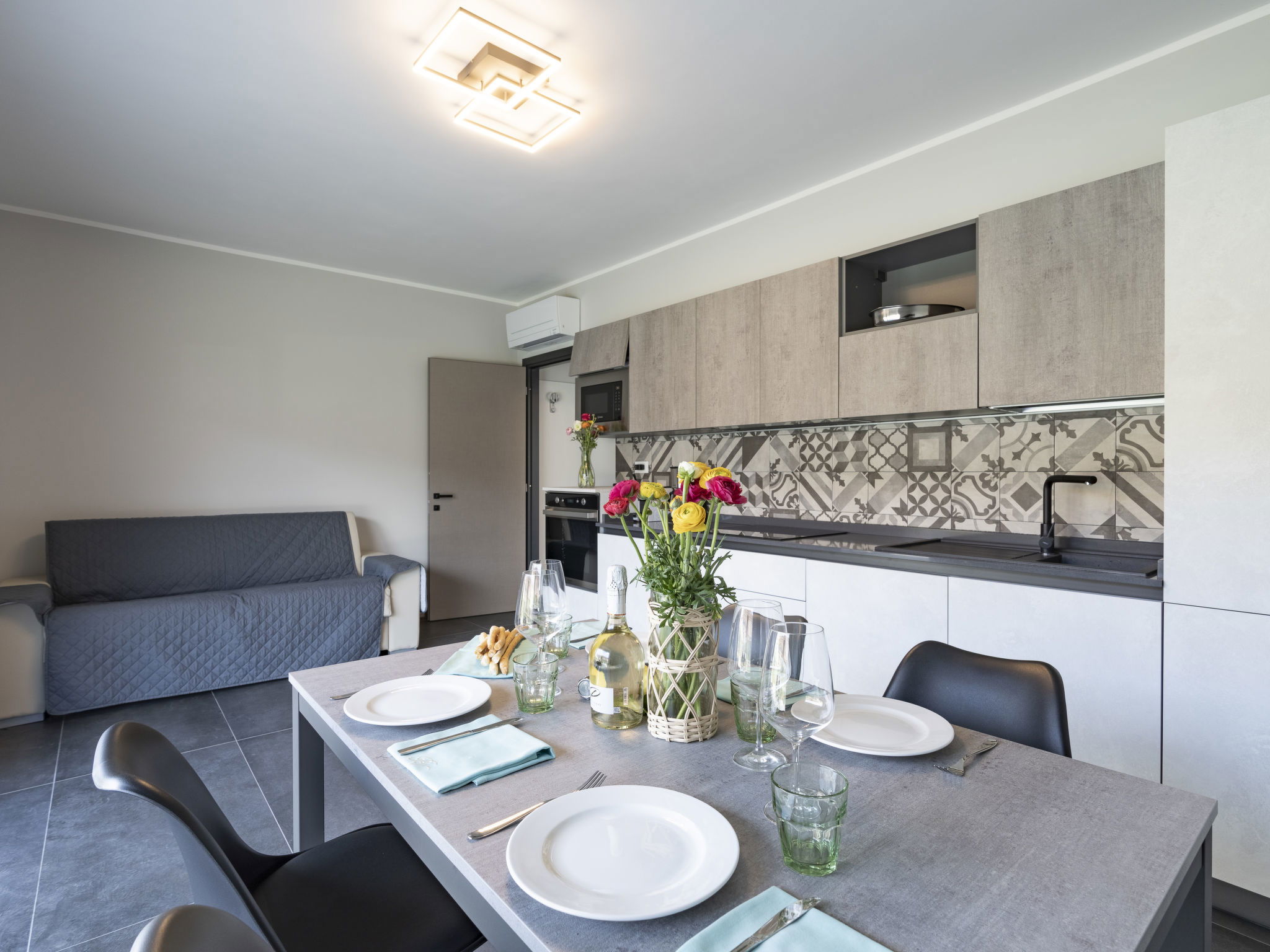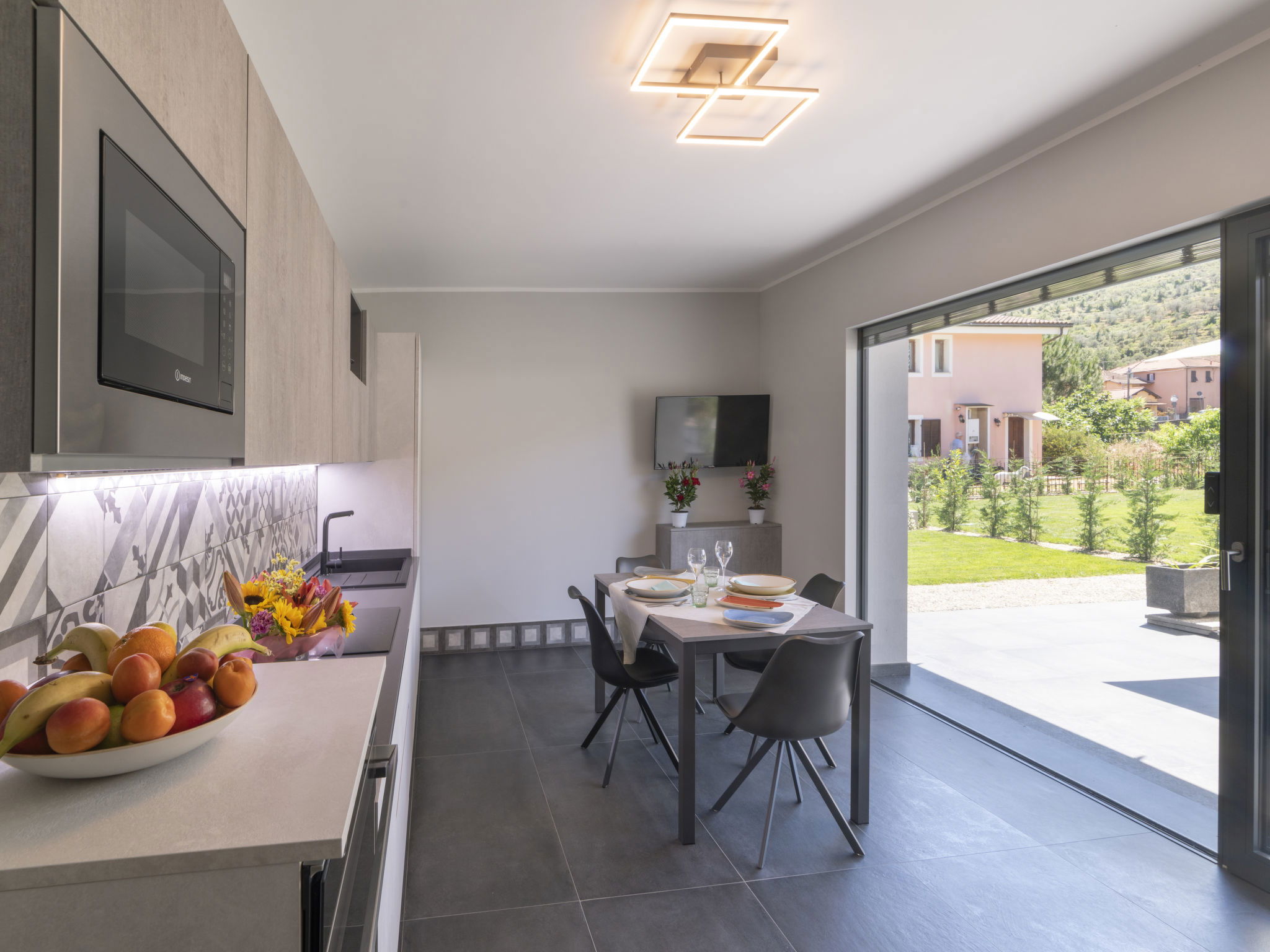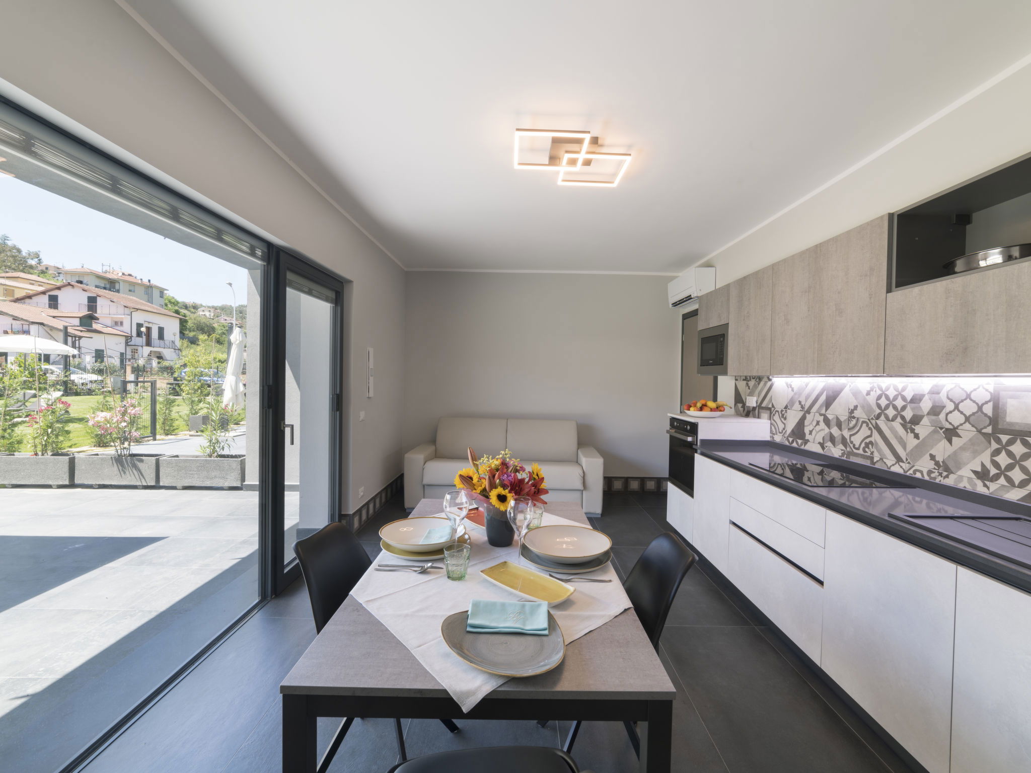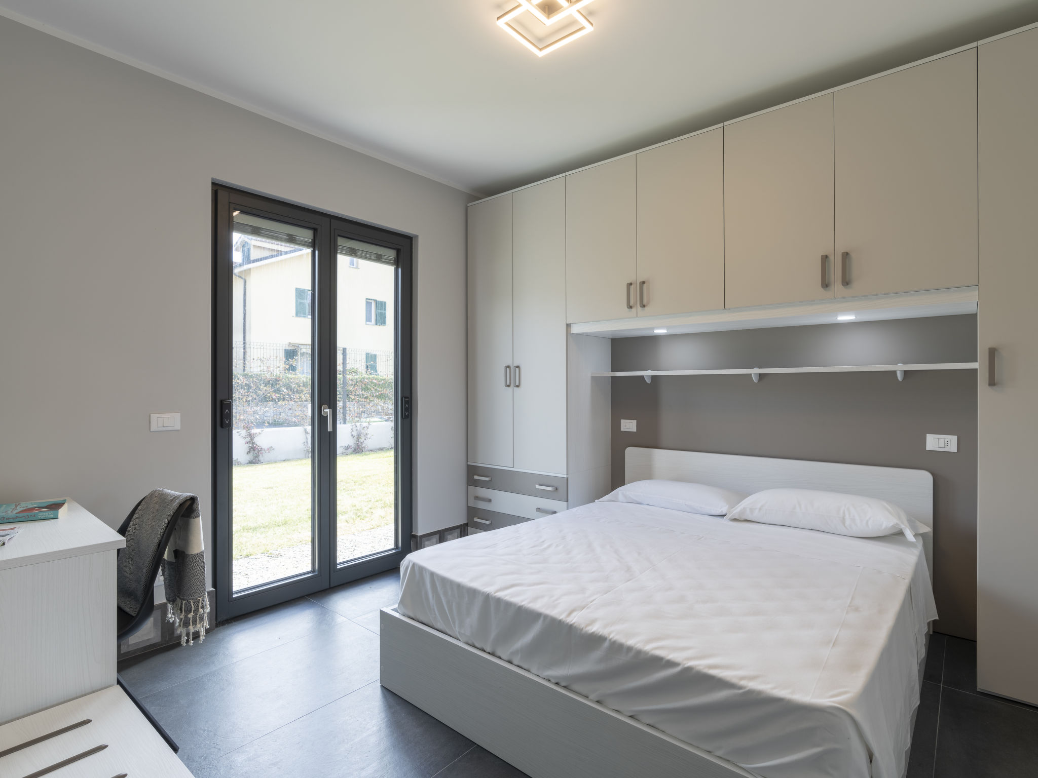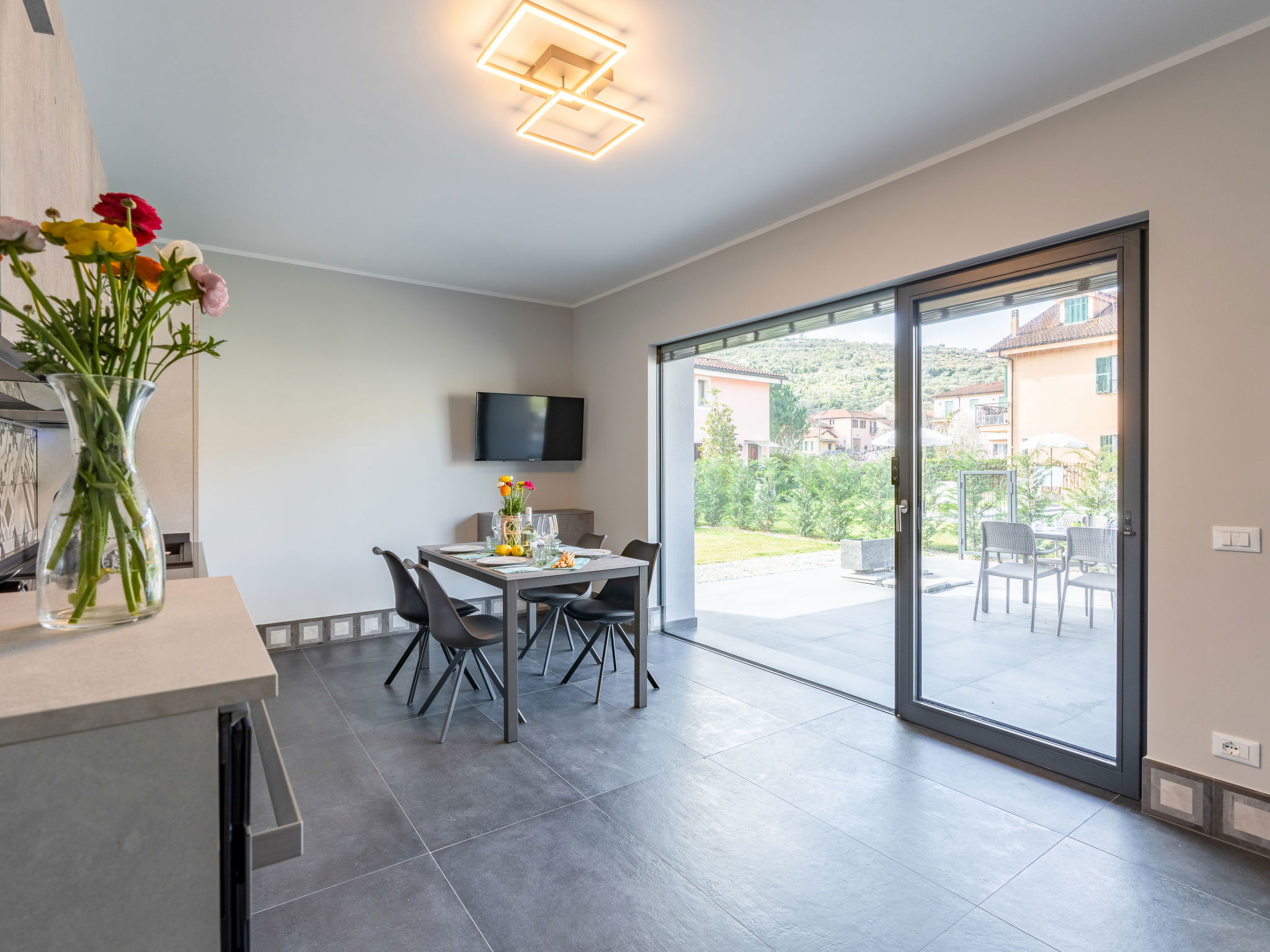 Modern, very comfortable residence "Al Bistrot dei Vinai", 2 storeys, built in 2022. 6 apartments in the residence. In the district of Caramagna 1.5 km from the centre of Imperia, 25 km from the centre of San Remo, 90 km from the centre of Nizza, in a sunny position in the residential district, 1.5 km from the sea. For shared use: large, well-kept garden 1'000 m2 (fenced) with lawn and flowers, lawn for sunbathing, swimming pool (5 x 15 m, depth 140 cm, seasonal availability: 12.Apr. - 30.Oct.). Outdoor shower, terrace, garden furniture, barbecue, children's playground (slide), pool maintenance by the owner/gardener. In the house: lift, storage room for bicycles, air conditioning, washing machine, tumble dryer (for shared use). Room cleaning on request (extra). Storeroom available. Motor access to the house. Parking (for 6 cars) on the premises, communal covered parking. Shop, grocery 600 m, supermarket 1 km, shopping centre 1 km, restaurant 2 km, bar 1 km, bakery 600 m, café 2 km, bicycle rental 2 km, bus stop 100 m, railway station "Imperia Oneglia" 6 km, sandy beach "Borgo Marina" 3 km pebble beach "Borgo Prino" 2 km, rocky beach "Borgo Foce" 3 km, outdoor swimming pool 6 km, swimming bay 6 km, bathing lake "Laghetti di Lecchiore" 7 km. Cycle lane 2 km. Nearby attractions: Dolcedo Mountainbiken am Monte Faudo 7 km, Küstenradweg von Imperia bis Ospedaletti 2 km, Valloria das Dorf mit 150 bemalten Türen 8 km, Triora Hexendorf 45 km, Monte Carlo 75 km, San Remo 25 km. Hiking paths: Monte Faudo (1149 m) Mountainbike Trails. Please note: car recommended. Baby equipment (included). Additional accommodations can be booked.