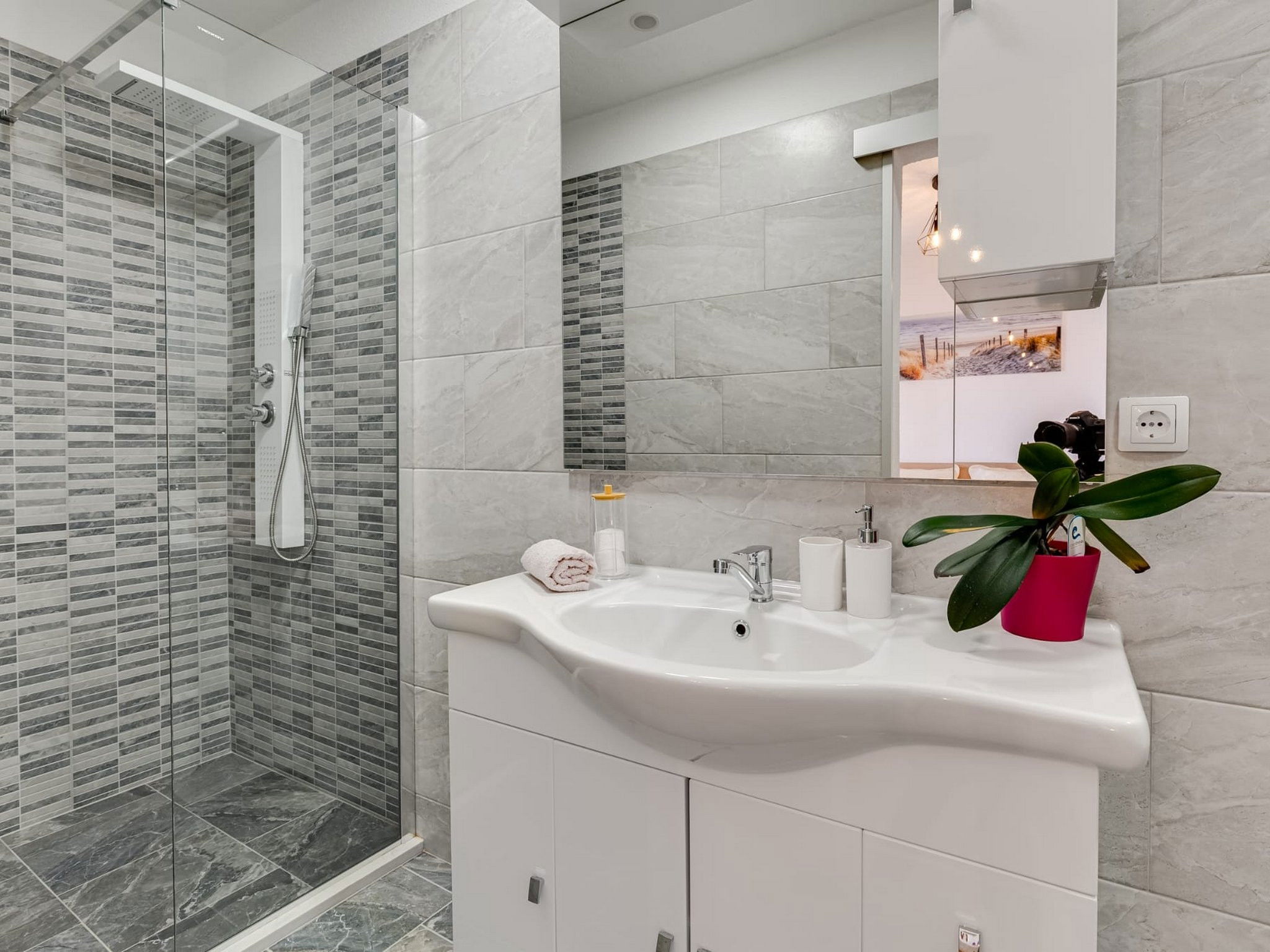 The bedroom offers a restful sleeping experience, with a double bed and a king-size bed, providing ample space for up to 4 guests. The apartment also features a modern bathroom with a shower, ensuring your comfort and convenience.