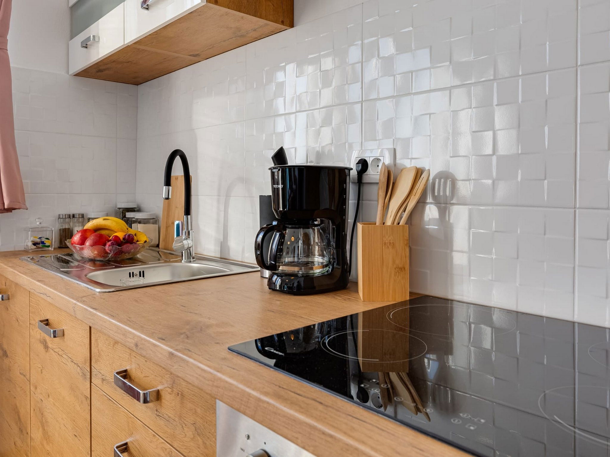 The apartment features a well-equipped kitchen, complete with modern appliances such as a fridge, freezer, oven, dishwasher, and coffee machine, allowing you to prepare delicious meals during your stay. The living area is furnished with comfortable seating and a TV with satellite channels, ensuring you can unwind after a day of exploring.