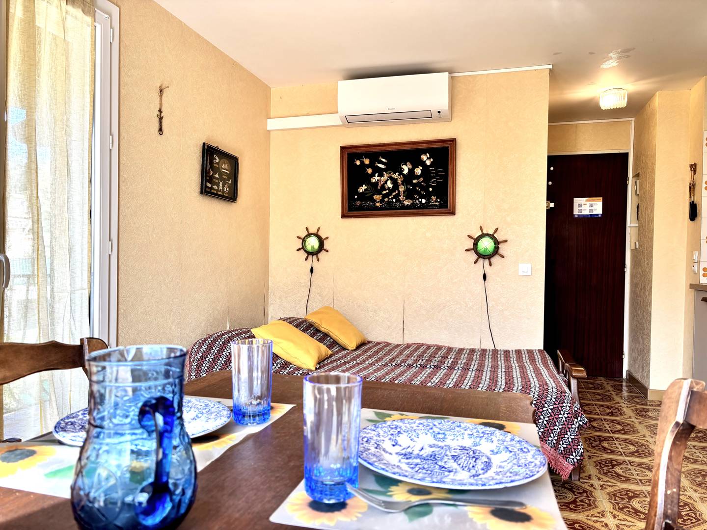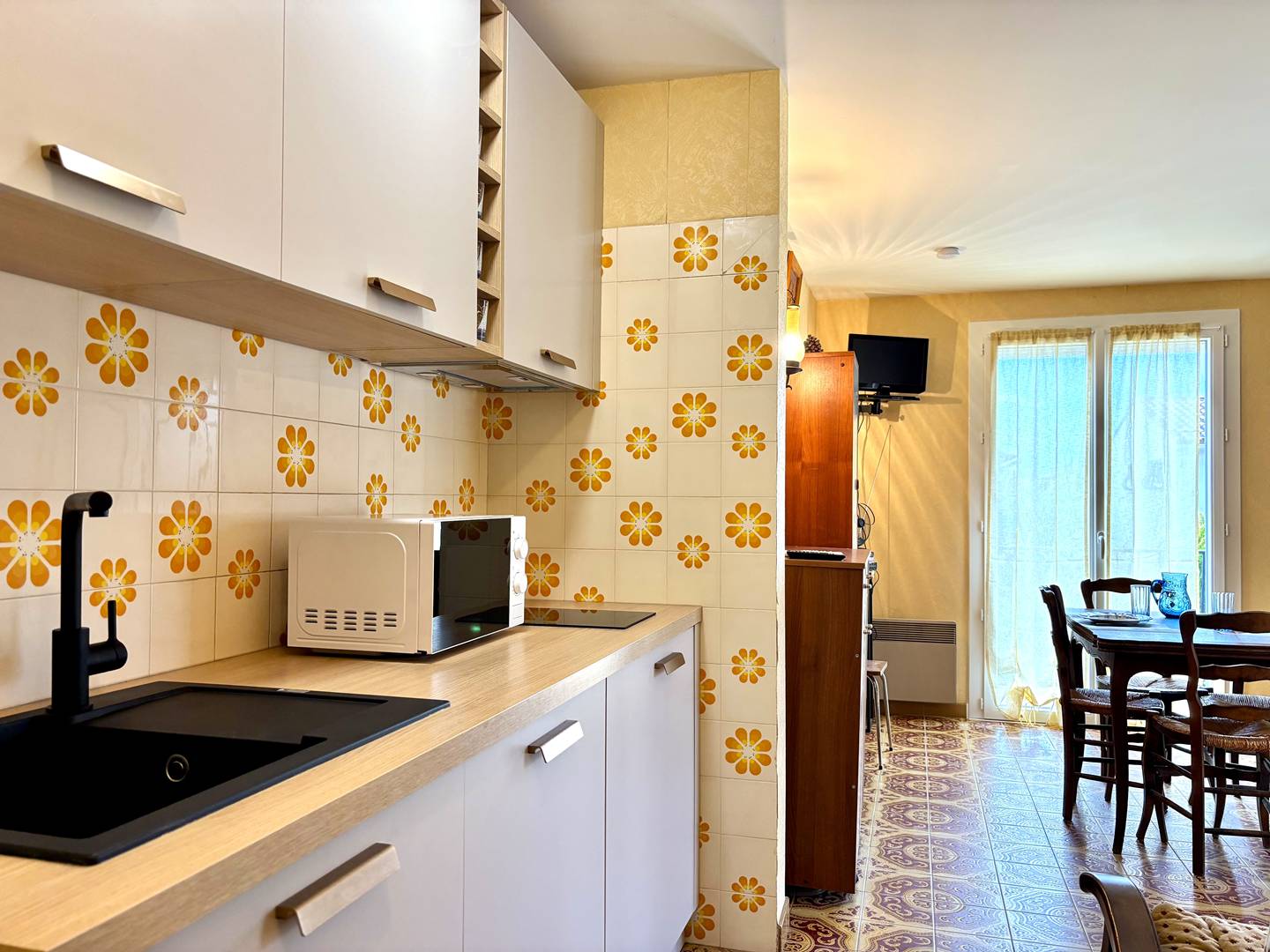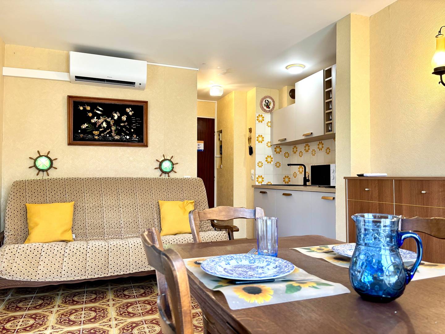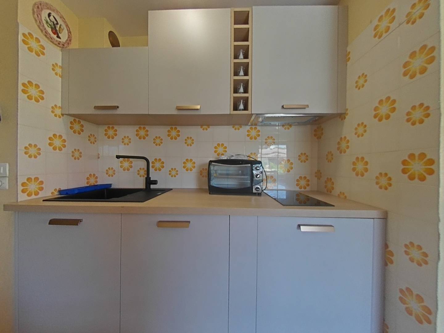 This -floor vacation rental features a studio with a north-west view of the residence and its greenery, a living room with a sofa bed, a newly renovated kitchenette, a bathroom, and a toilet.