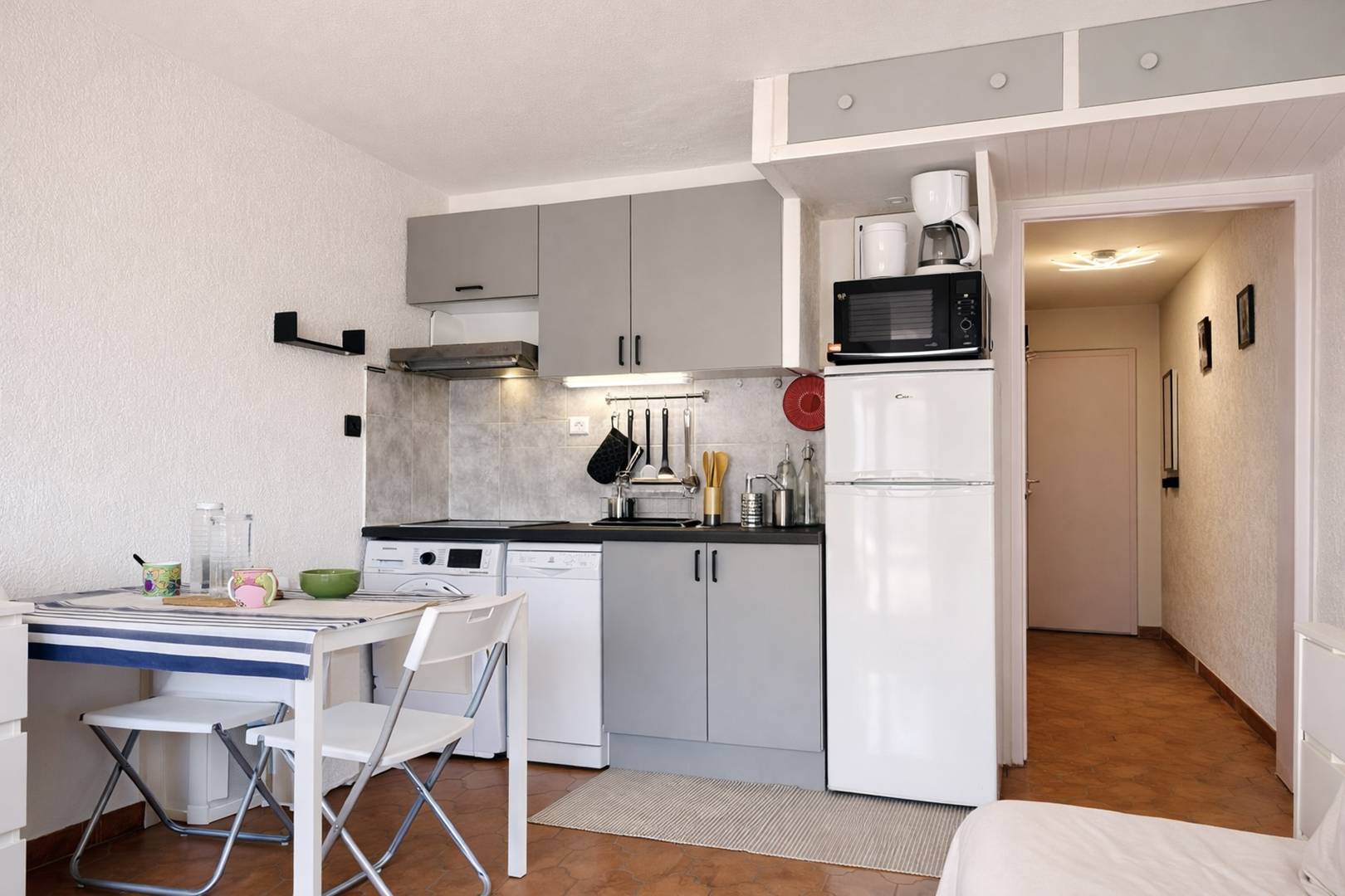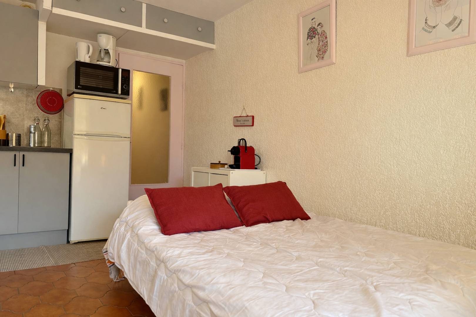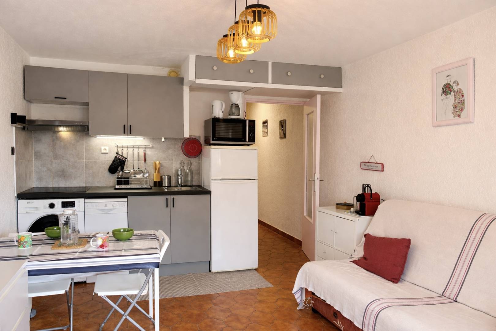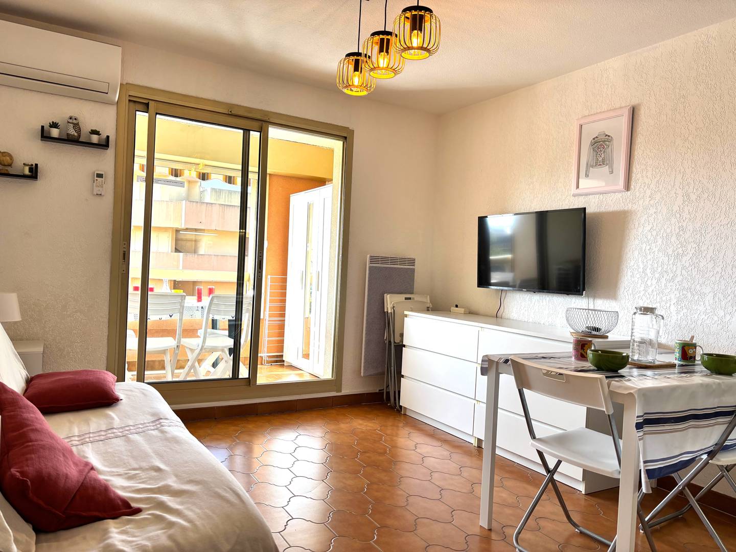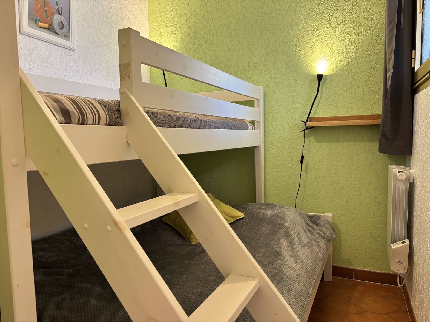 The accommodation: This charming holiday apartment located on the 2nd floor offers a south-facing balcony, an air-conditioned living room with a cliclac type bed open to the kitchen, a bedroom with a bunk bed (double downstairs single at the top) and a bathroom with toilet.
