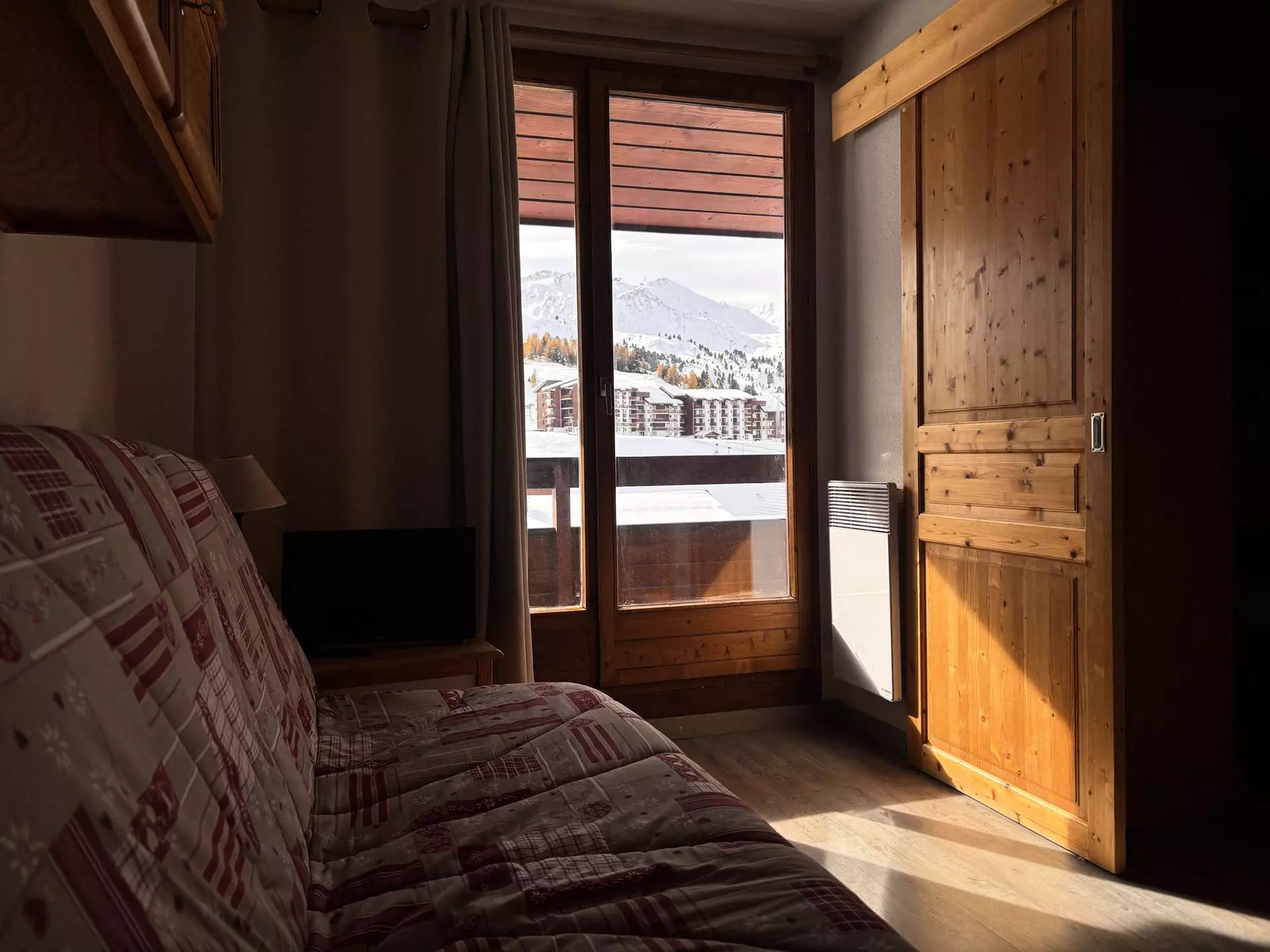 2-room apartment, 4/5 people, 25m2, balcony, south facing, view of the slopes, 4th floor, elevator. Kitchen: 2 electric hotplates, oven, microwave, refrigerator, dishwasher - Living room: dining area, lounge area, 1 double sofa bed, 1 single sofa bed, TV. Bedroom: 2 bunk beds. Bathroom: bathtub, separate toilet. Floors: plastic, except kitchen, bathroom, toilet: tiled. Bedding: duvets - Apartment very well located in relation to the slopes and shops, very pleasant with a large sunny balcony. Ski locker n°409 at the slope exit level. End-of-stay cleaning, sheets, towels and ski passes are optional.