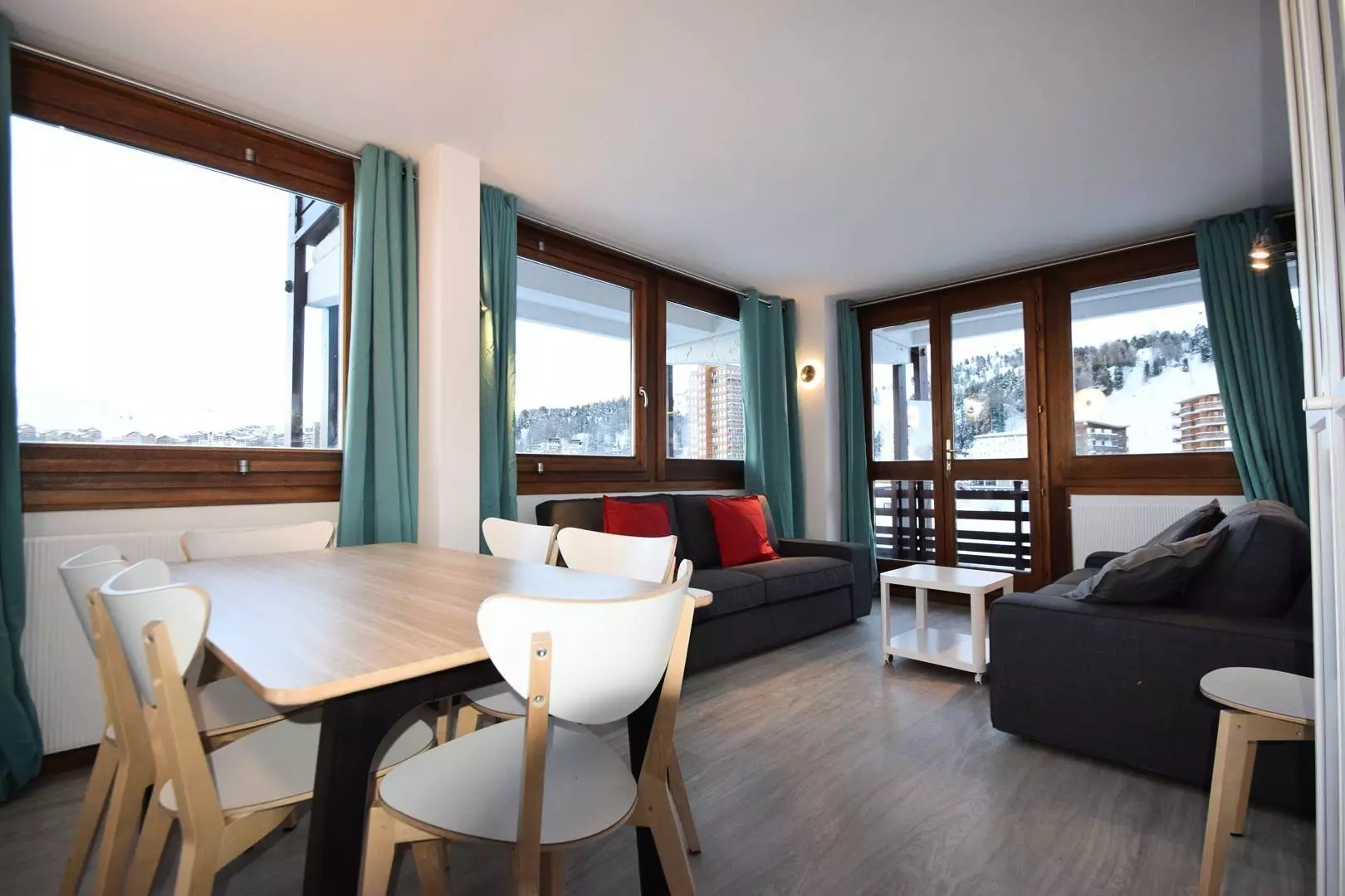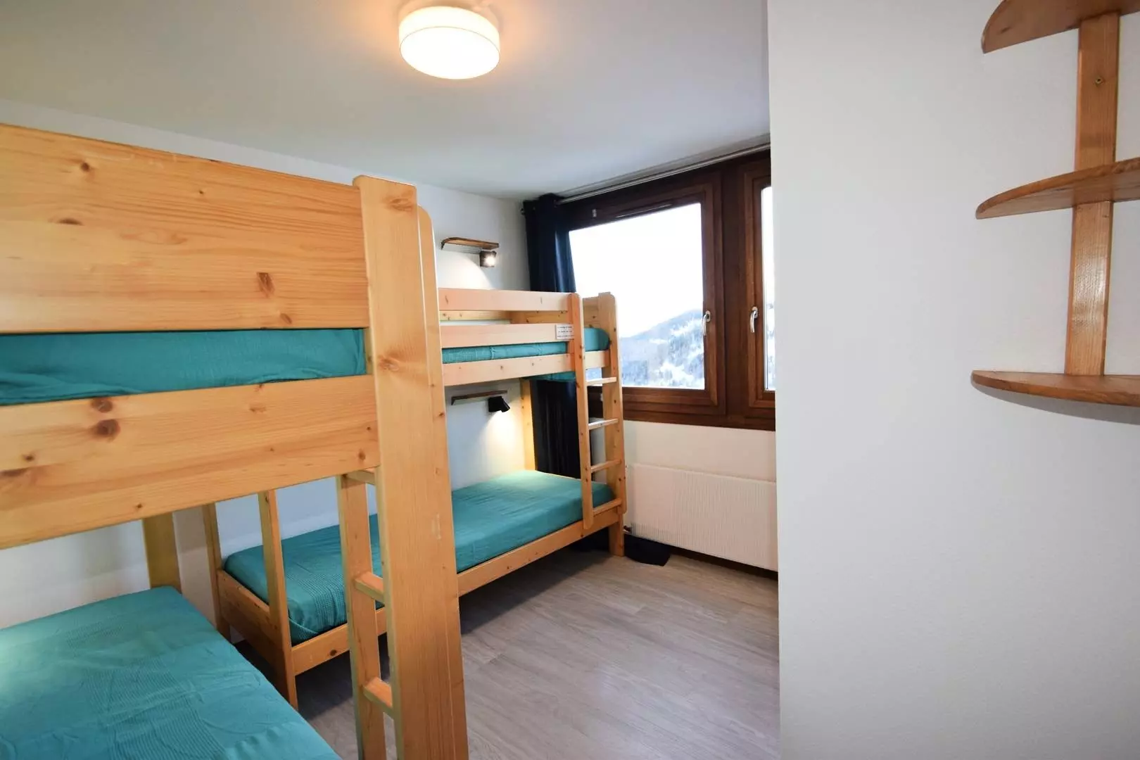 Renovated apartment, composed of 3 rooms, 6 people, 52m2, south facing, located 100m from the slopes. Corner balcony, 3rd floor with elevator, magnificent view of the resort and Mont Blanc, slopes - Separate kitchen: 2 ceramic hobs, refrigerator, oven, microwave, dishwasher. Living room: dining area and lounge area, TV - Bedroom 1: 2 single beds with adjoining shower room Bedroom 2: 2 x 2 bunk beds - Bathroom: bathtub and washing machine - Separate WC - Bedding: duvets - Floors: PVC slats. End of stay cleaning, sheets, towels and ski passes optional. Apartment with a beautiful view of the resort. Ski locker no. 306 on level 1 direct exit (room no. 1) - The Residence located approximately 200m from the slopes and possibility of returning on skis in front of the residence - shops and shopping arcade approx. 300m -