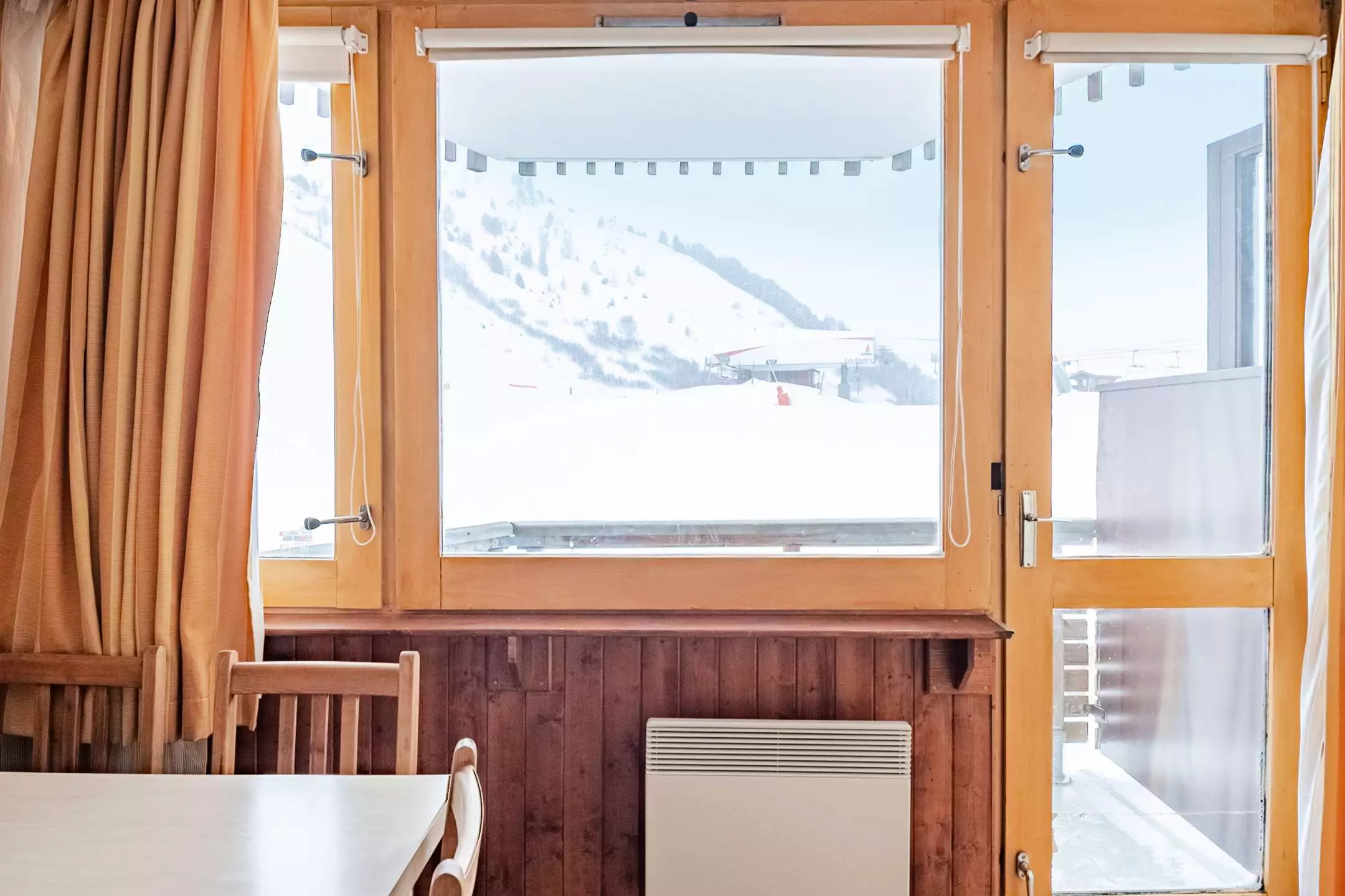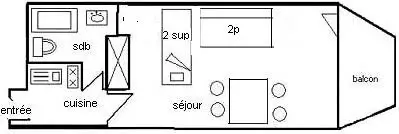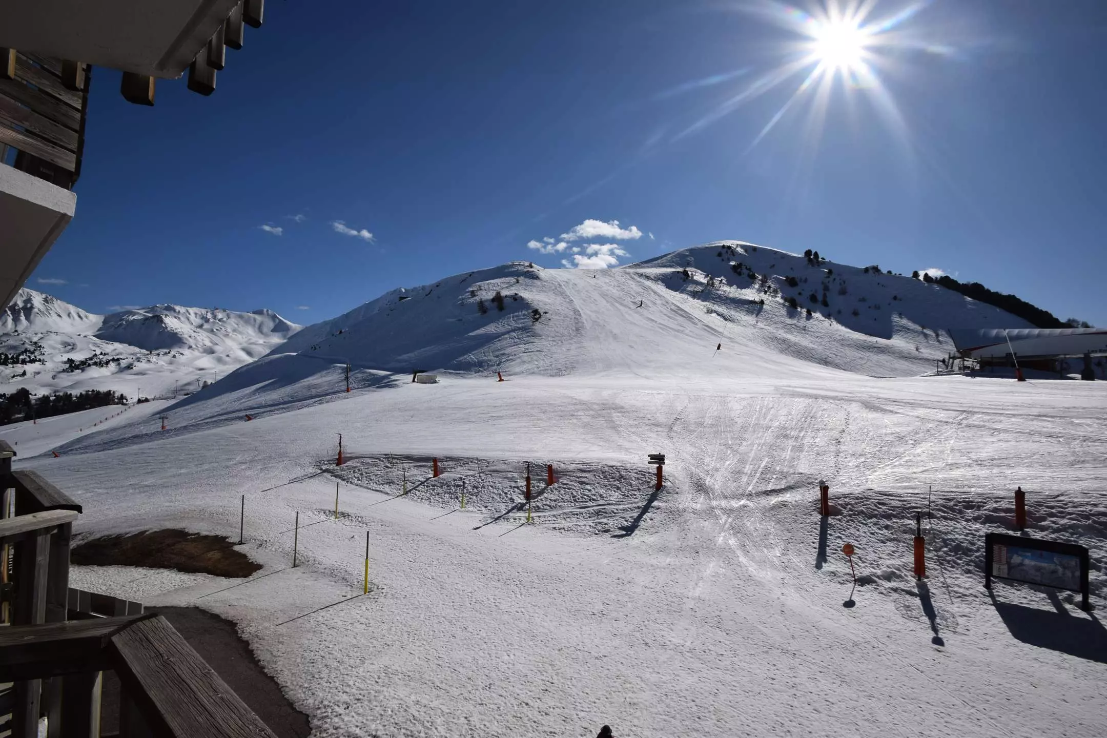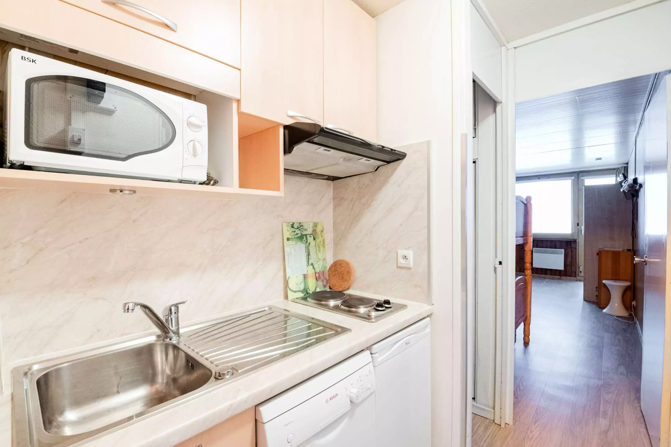 Studio 26m2, 3/4 people, south facing, balcony, view of the slopes, floor j with diamond elevator. Kitchen in the entrance/corridor: 2 electric hotplates, refrigerator, microwave, mini-oven, dishwasher. Living room: dining area, 1 sofa bed for 2 people and 2 bunk beds 90cm, television. Bathroom: bathtub, WC included. Studio well exposed, sunny. Bedding: duvets and blankets - Ski locker n° J49 under ESF level F room n°2. Non-smoking apartment. Optional and extra: End of stay cleaning, sheets, towels, ski passes.