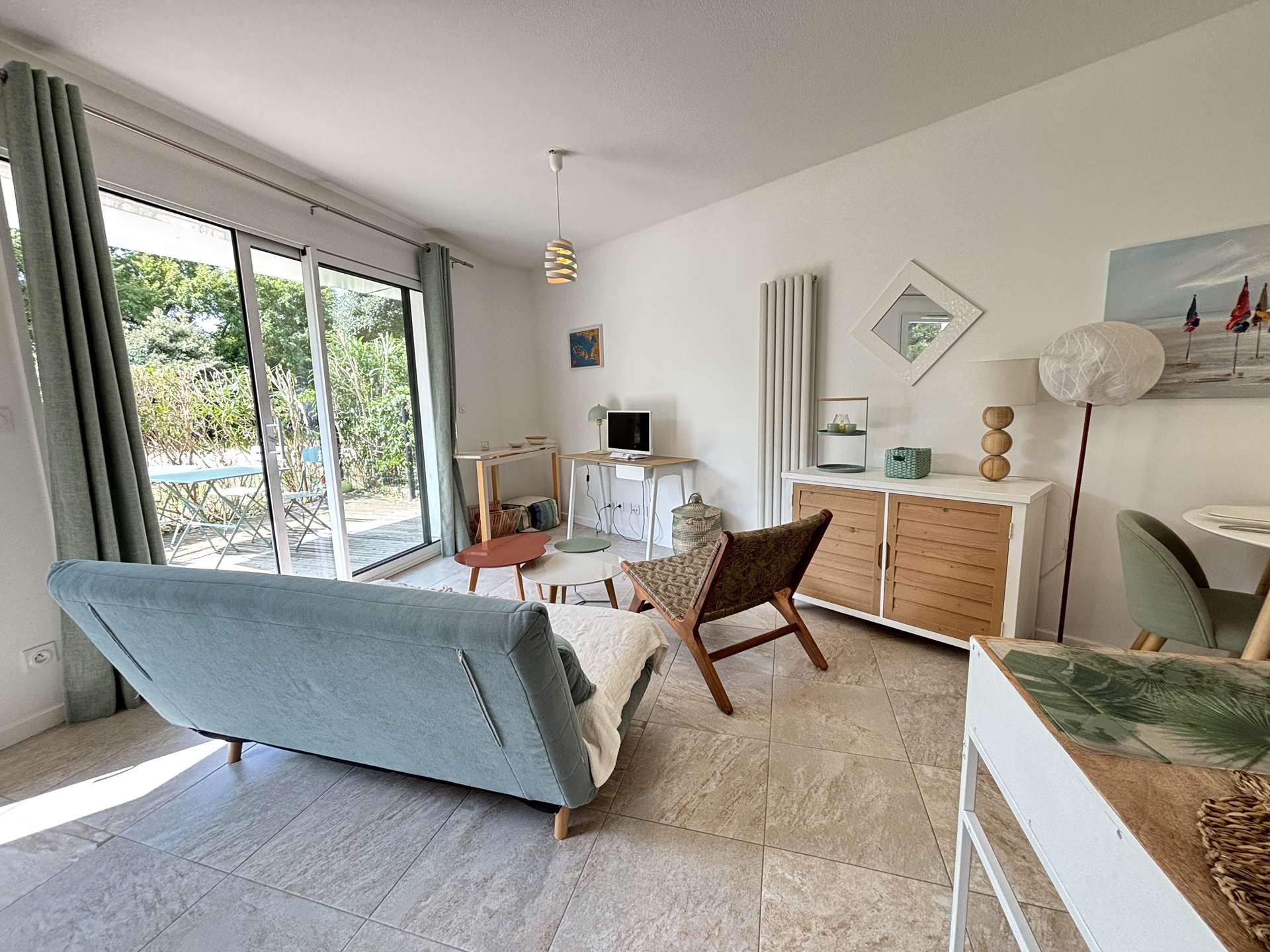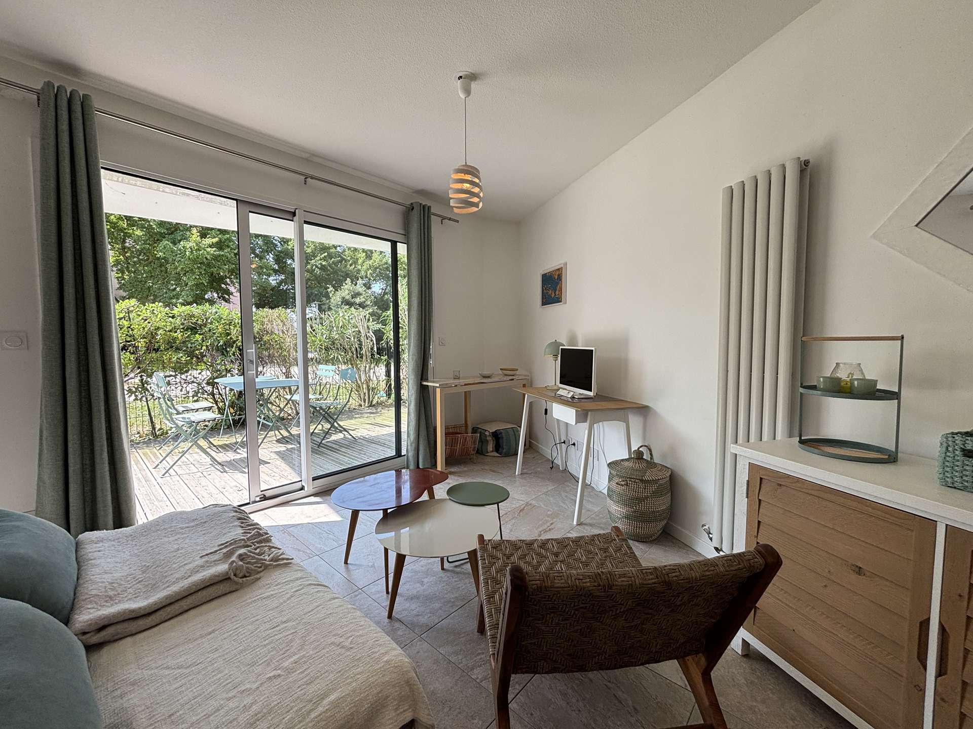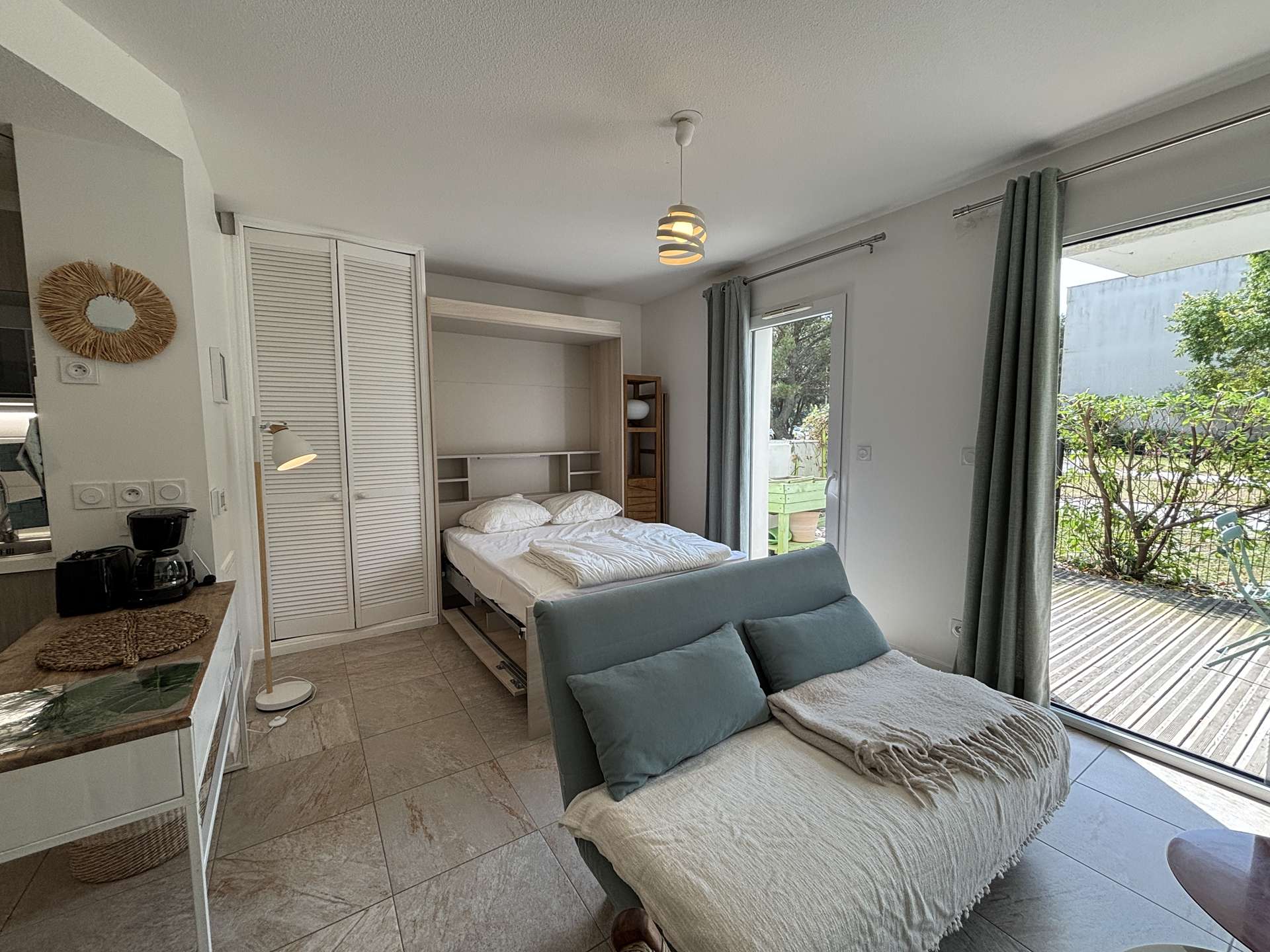 La Rochelle (17) - Les Minimes - Résidence Carré des Minimes 1 room apartment - approx. 35 m² - up to 2 people The apartment in perfect condition, is on the ground floor and consists of a large living room with a side a living area with a sofa, and on the other a sleeping area with a fold-away bed with a 140cm bed for 2 people, a kitchen area equipped with top fridge, microwave and extractor hood, a bathroom with WC and a large terrace of approximately 15m², facing south with garden furniture to enjoy the sun. The accommodation also has a storeroom with a washing machine. The advantages of this rental by the sea: Private parking space in the basement, plenty of storage space, washing machine, large area and south-facing terrace. Close to shops and easy access to public transport. Housekeeping with disinfection included.