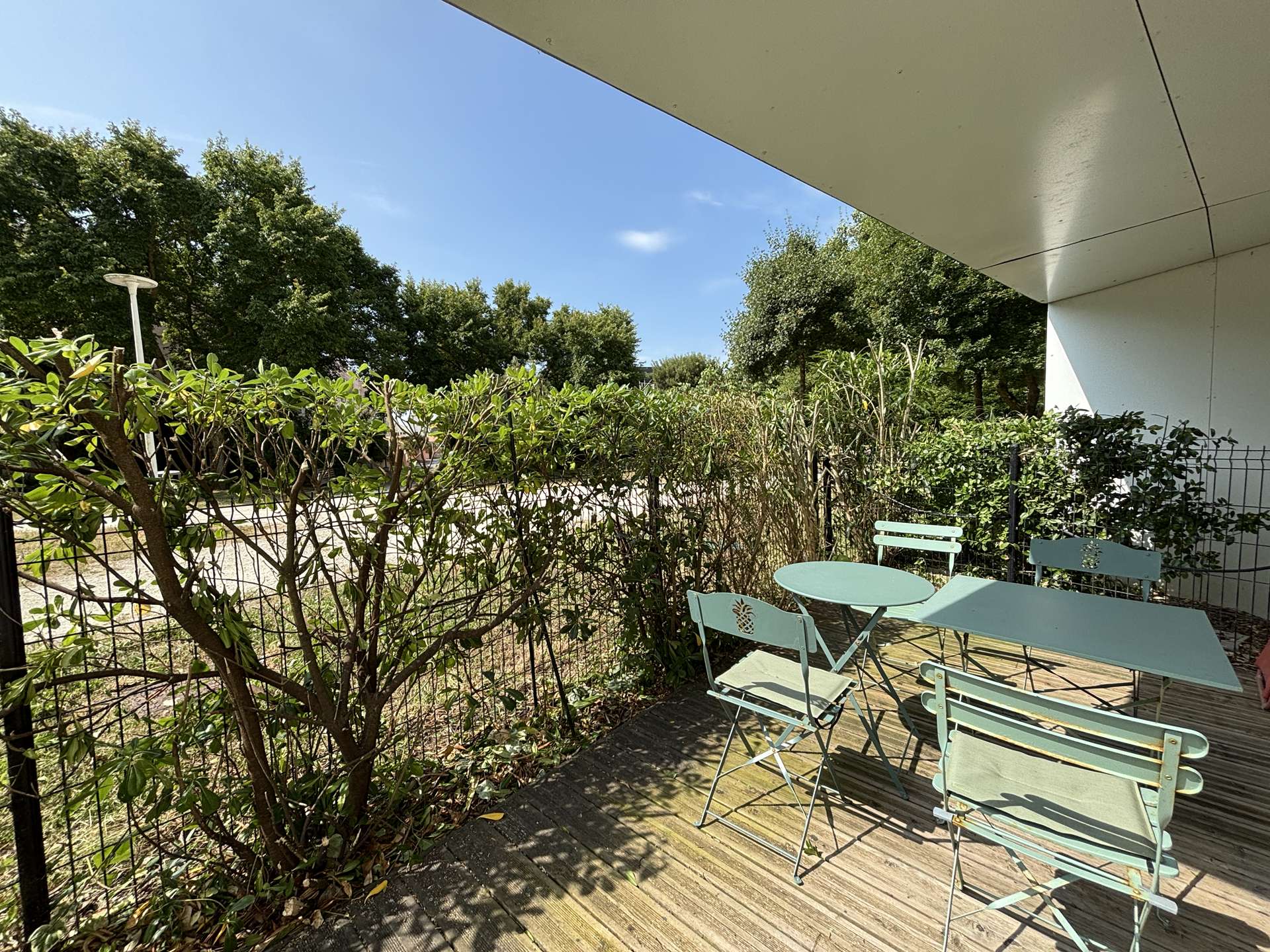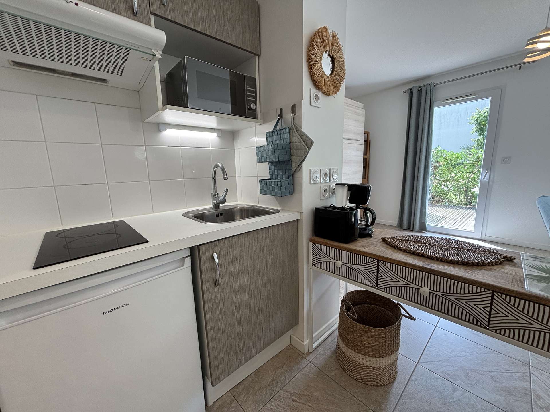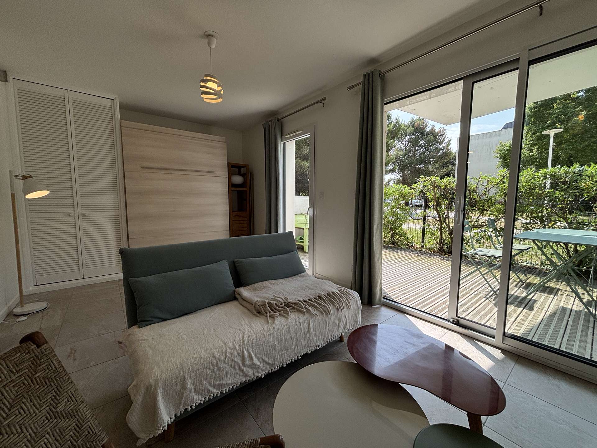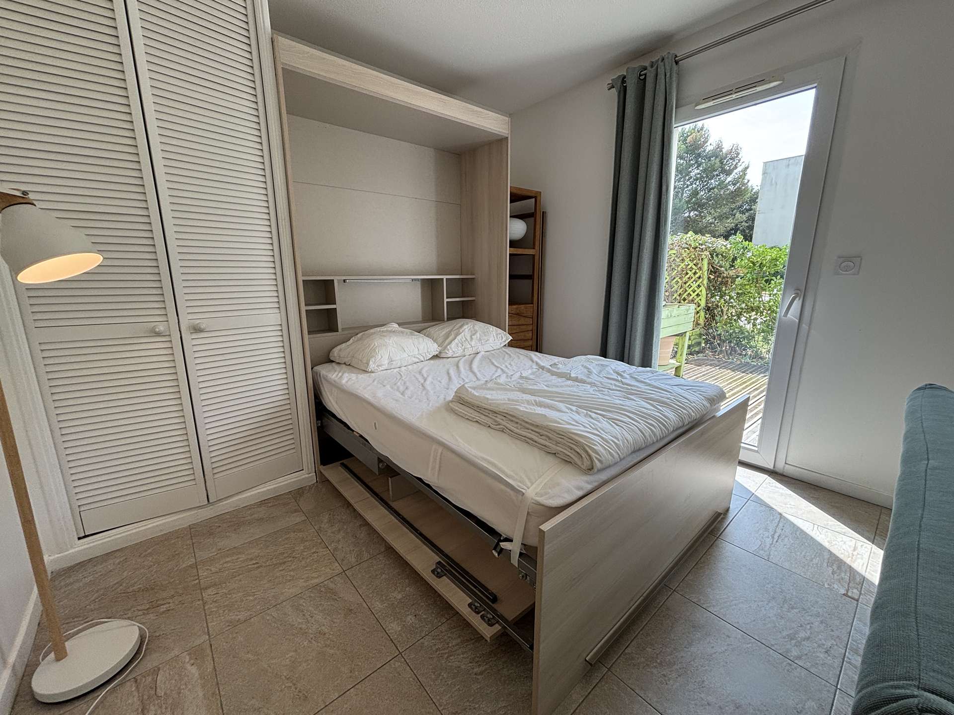 La Rochelle (17) - Les Minimes - Résidence Carré des Minimes 1 room apartment - approx. 35 m² - up to 2 people The apartment in perfect condition, is on the ground floor and consists of a large living room with a side a living area with a sofa, and on the other a sleeping area with a fold-away bed with a 140cm bed for 2 people, a kitchen area equipped with top fridge, microwave and extractor hood, a bathroom with WC and a large terrace of approximately 15m², facing south with garden furniture to enjoy the sun. The accommodation also has a storeroom with a washing machine. The advantages of this rental by the sea: Private parking space in the basement, plenty of storage space, washing machine, large area and south-facing terrace. Close to shops and easy access to public transport. Housekeeping with disinfection included.