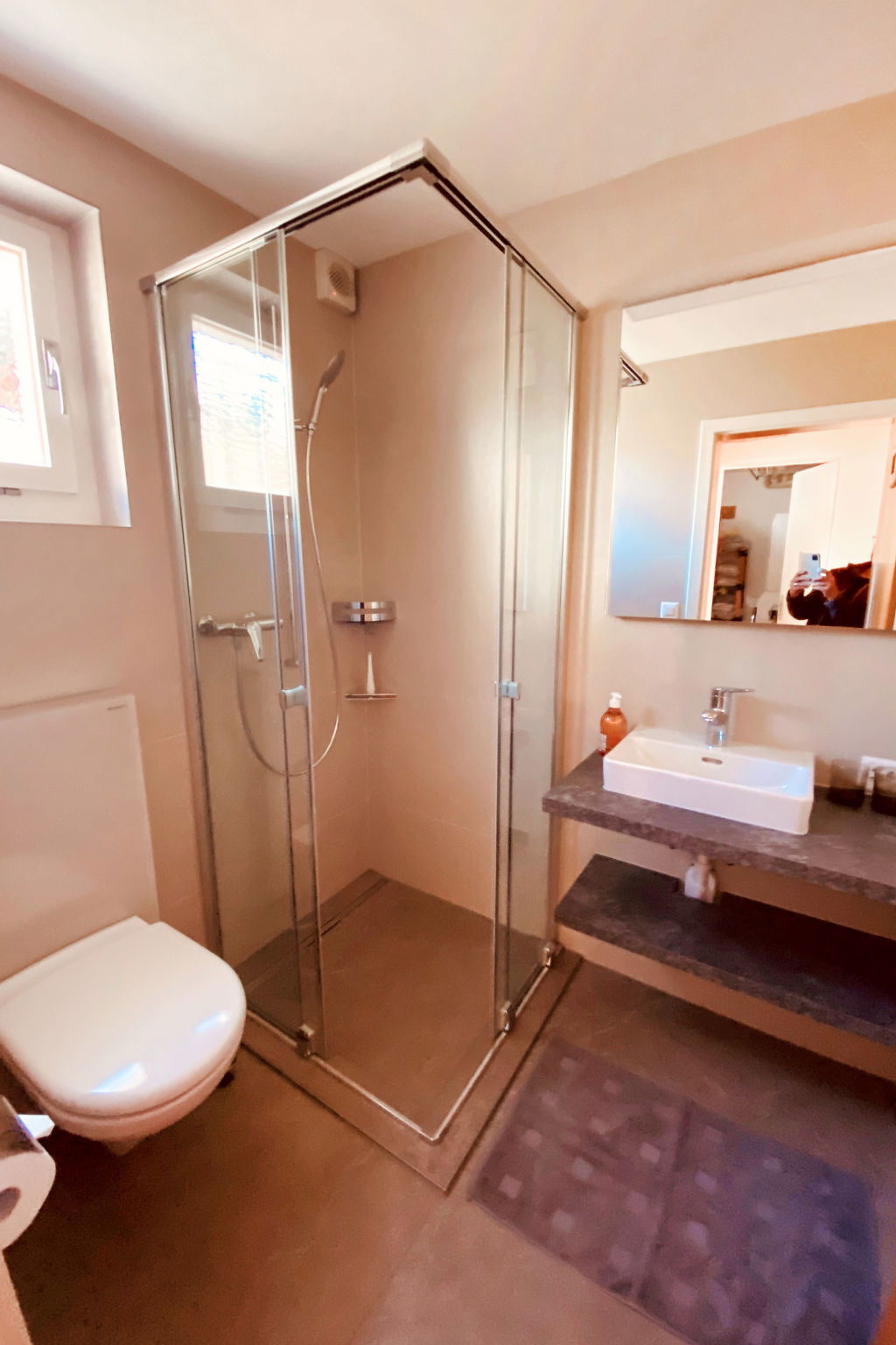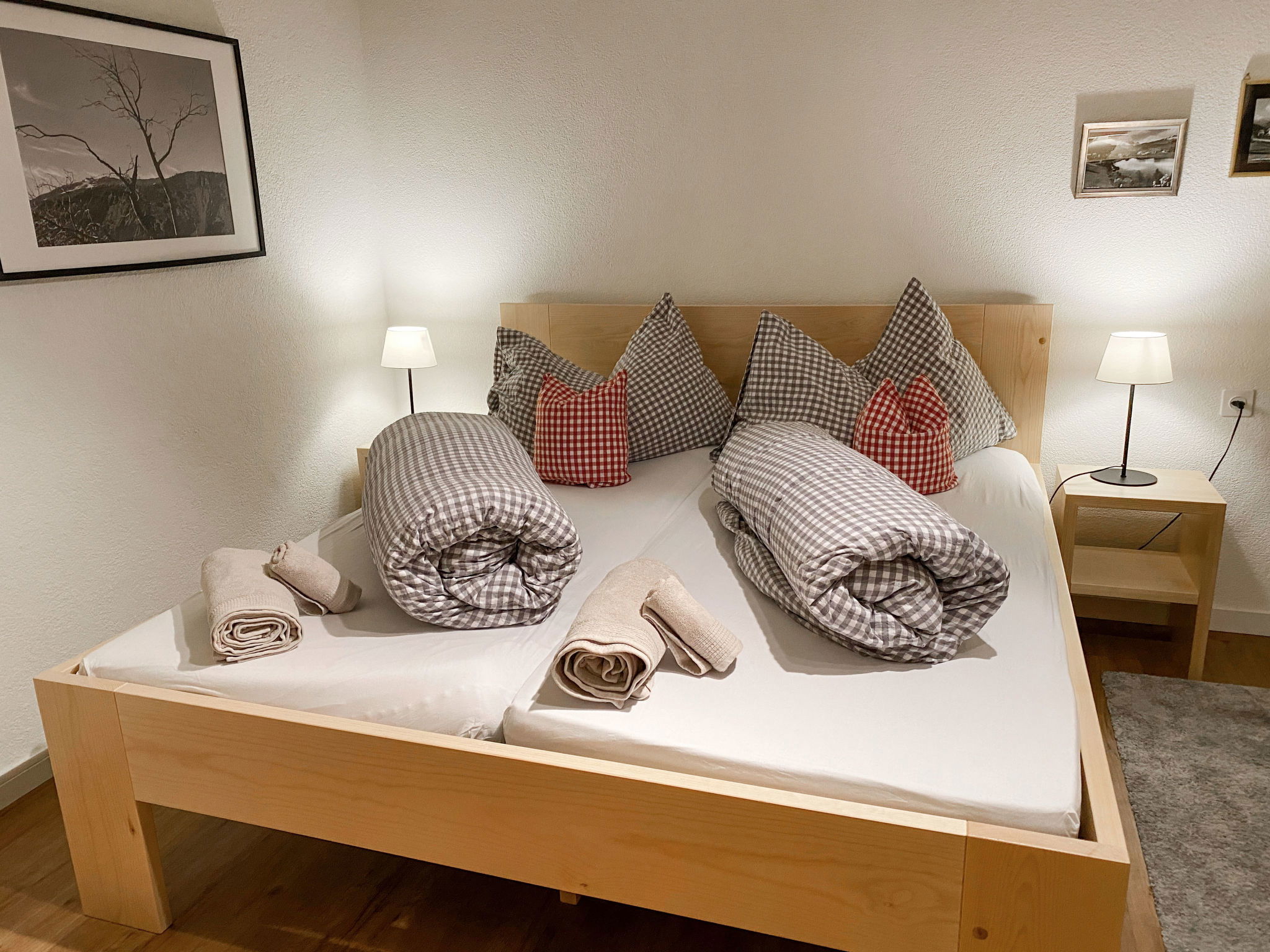 "Schumellins ", 1-room apartment 35 m2, on the ground floor, south facing position. Renovated in 2021, tasteful and cosy furnishings: living/sleeping room with 1 double bed, dining table and cable TV (flat screen). Exit to the terrace. Open kitchen (oven, dishwasher, 2 ceramic glass hob hotplates, electric coffee machine, raclette grill, fondue Set (chinoise, cheese)). Shower/WC. Oil heating. Terrace. Terrace furniture, barbecue, deck chairs (2). Beautiful panoramic view of the lake, the mountains, the countryside and the resort. Facilities: Internet (WiFi, extra). Parking (roofed) at the house. Please note: non-smoking house. Maximum 2 pets/ dogs allowed. Private entrance.
