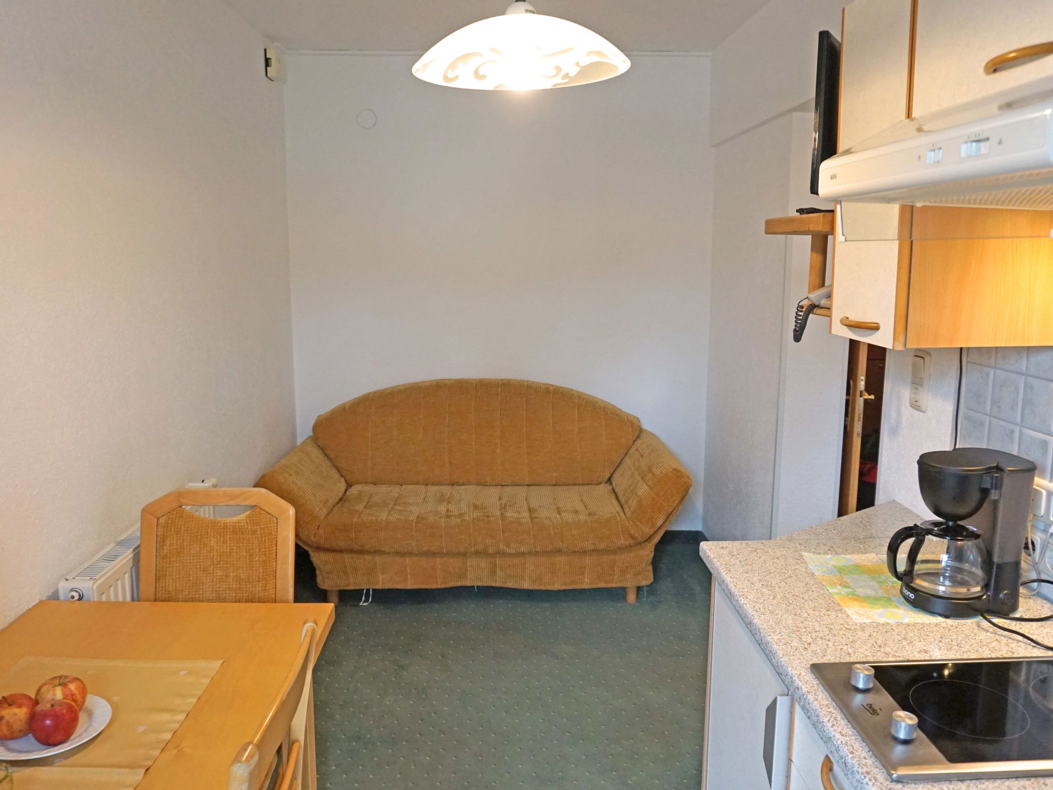 2-room apartment 30 m2 on 1st floor. Beautiful and cosy furnishings: living/sleeping room with 1 sofabed, dining table and satellite TV. Exit to the balcony. 1 double bedroom. Kitchenette (2 hot plates). Shower/WC. Balcony. Beautiful view of the mountains and the countryside. Facilities: safe, hair dryer. Internet (WiFi, free). Please note: suitable for families. Maximum 1 pet/ dog allowed. Smoke alarm.