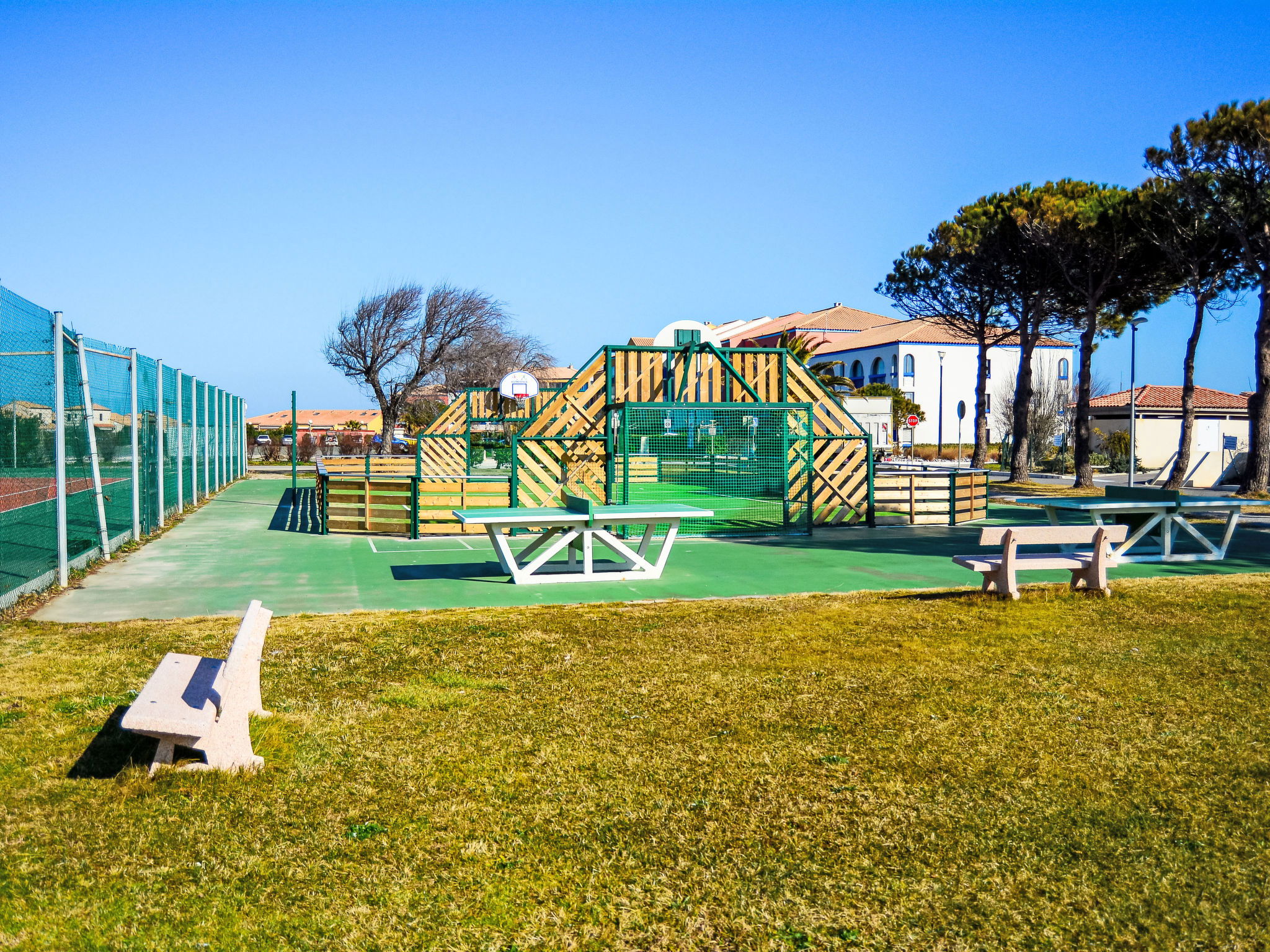 Coudalère 5 km from Barcarès centre: As part of the water restriction measures linked to the drought in some of our departments, please note that the rental swimming pool may be closed by prefectural decree. Residence "Grenade", 2 storeys. 2.5 km from the sea, 50 m from the lake, 2.5 km from the beach. For shared use: beautiful garden to relax, 2 swimming pools heated (10 x 15 m, seasonal availability: 15.Apr. - 15.Oct.). Children's pool, tennis (extra), basketball (extra), children's playground (slide), public parking. Shop, grocery 500 m, supermarket 6 km, restaurant, bar, bakery, café, bicycle rental 500 m, bus stop "La Coudalère" 1 km, railway station "Perpignan" 22 km, sandy beach 2.5 km. Sailing school 500 m, minigolf 1.3 km, riding stable 12 km. Nearby attractions: Réserve Africaine de Sigean 41 km, Aqualand Port Leucate 7 km, parcours aventure 7 km, cinéma 5 km, Téleski nautique site des dosses 5 km, Spot de windsurf 50 m. Well-known lakes can easily be reached: Lac de villeneuve de la Raho 34 km. Hiking paths: Sentier du guetteur 8 km, la forteresse de salses 15 km, Sentier du littoral Collioure 40 km. Please note: car recommended, no lift. Entertainment in the season. The photograph shows a typical example. Additional accommodations can be booked.