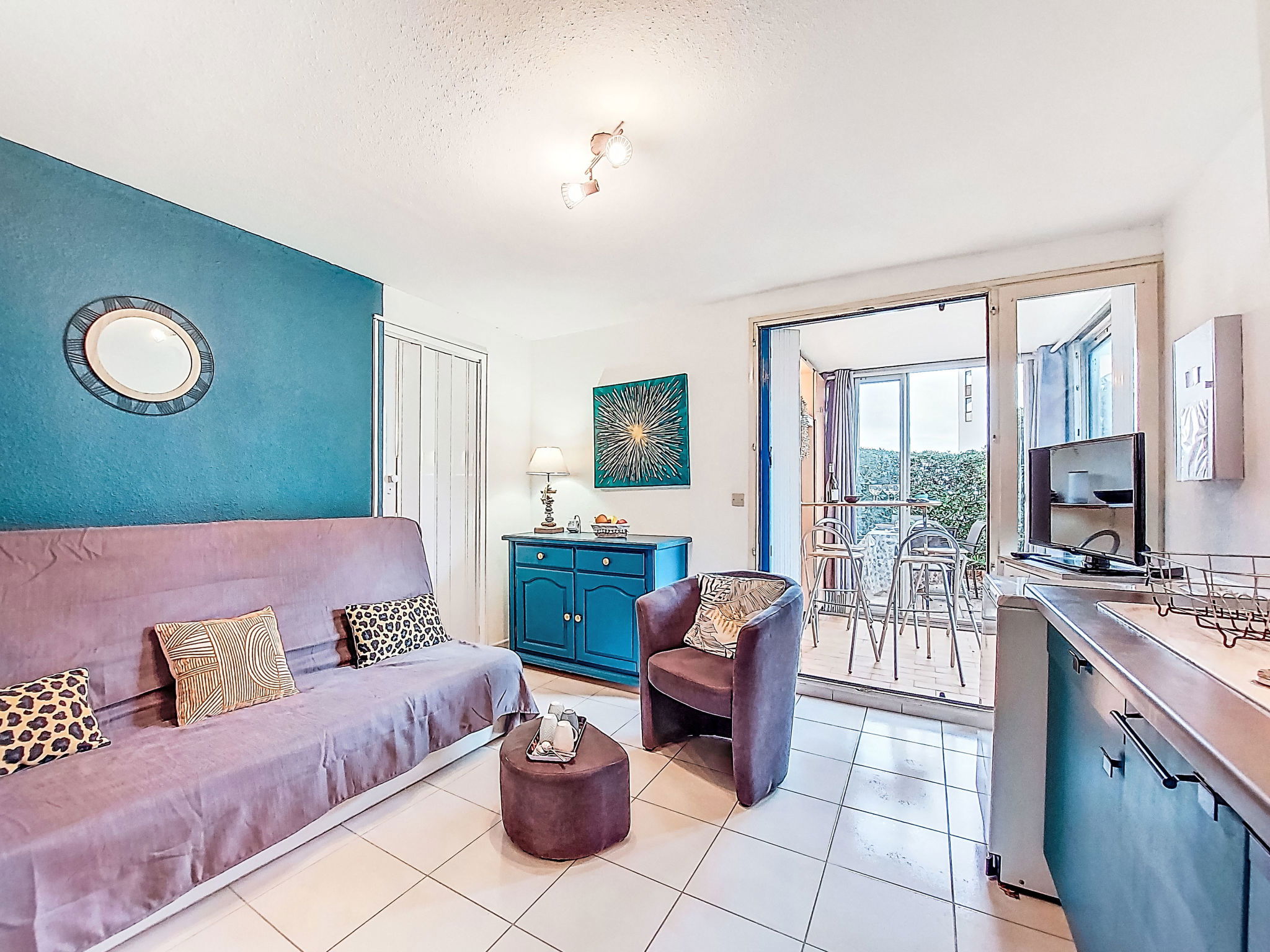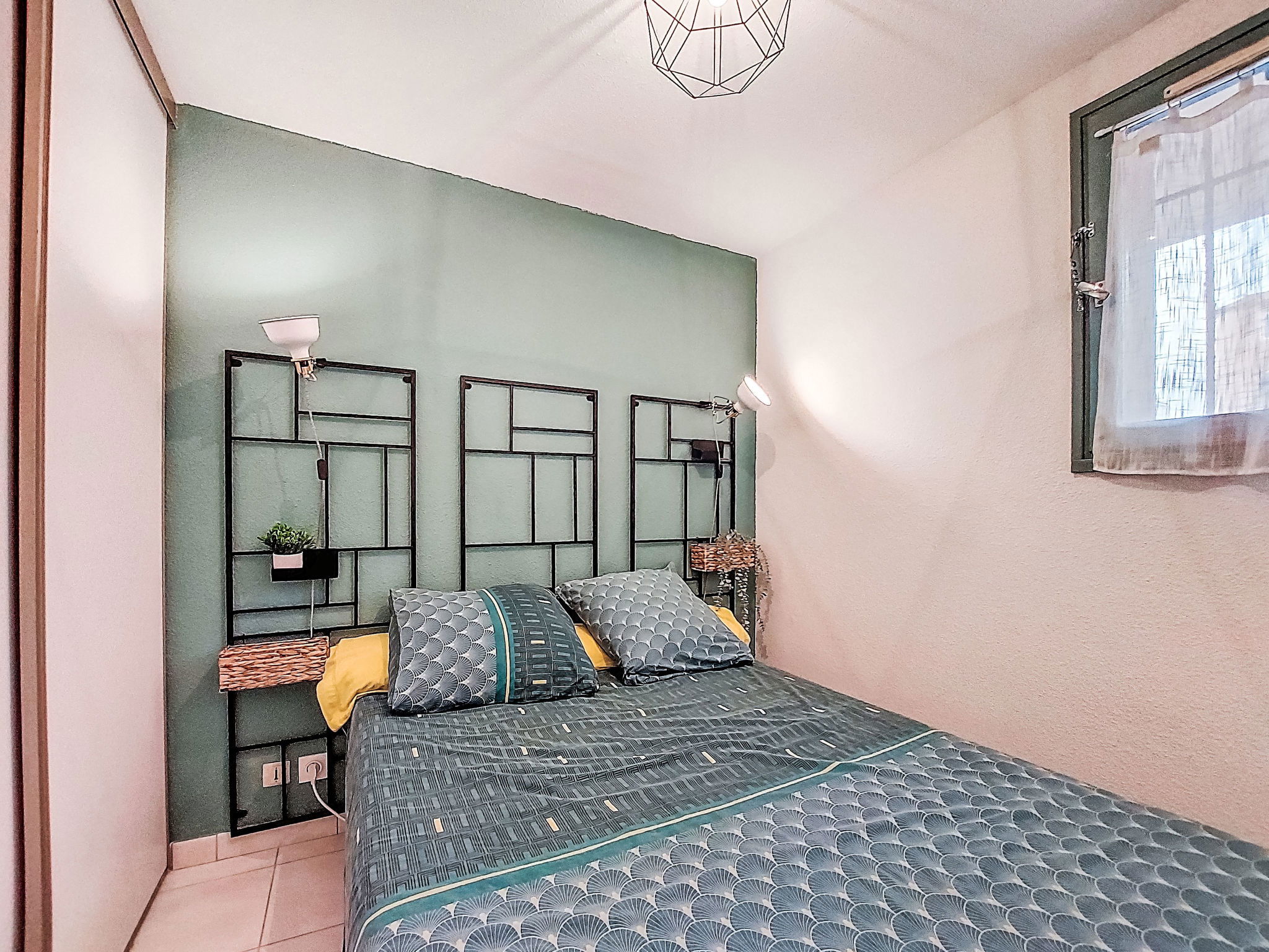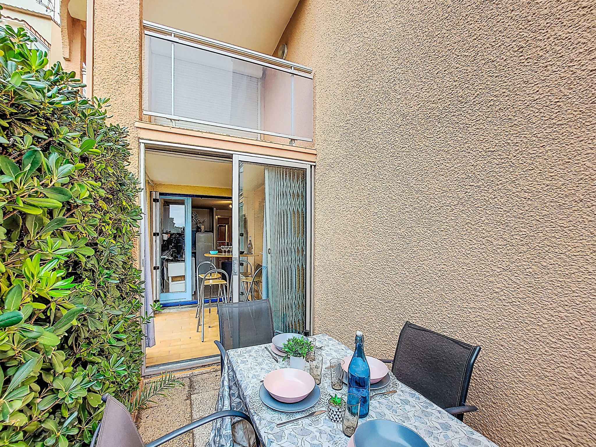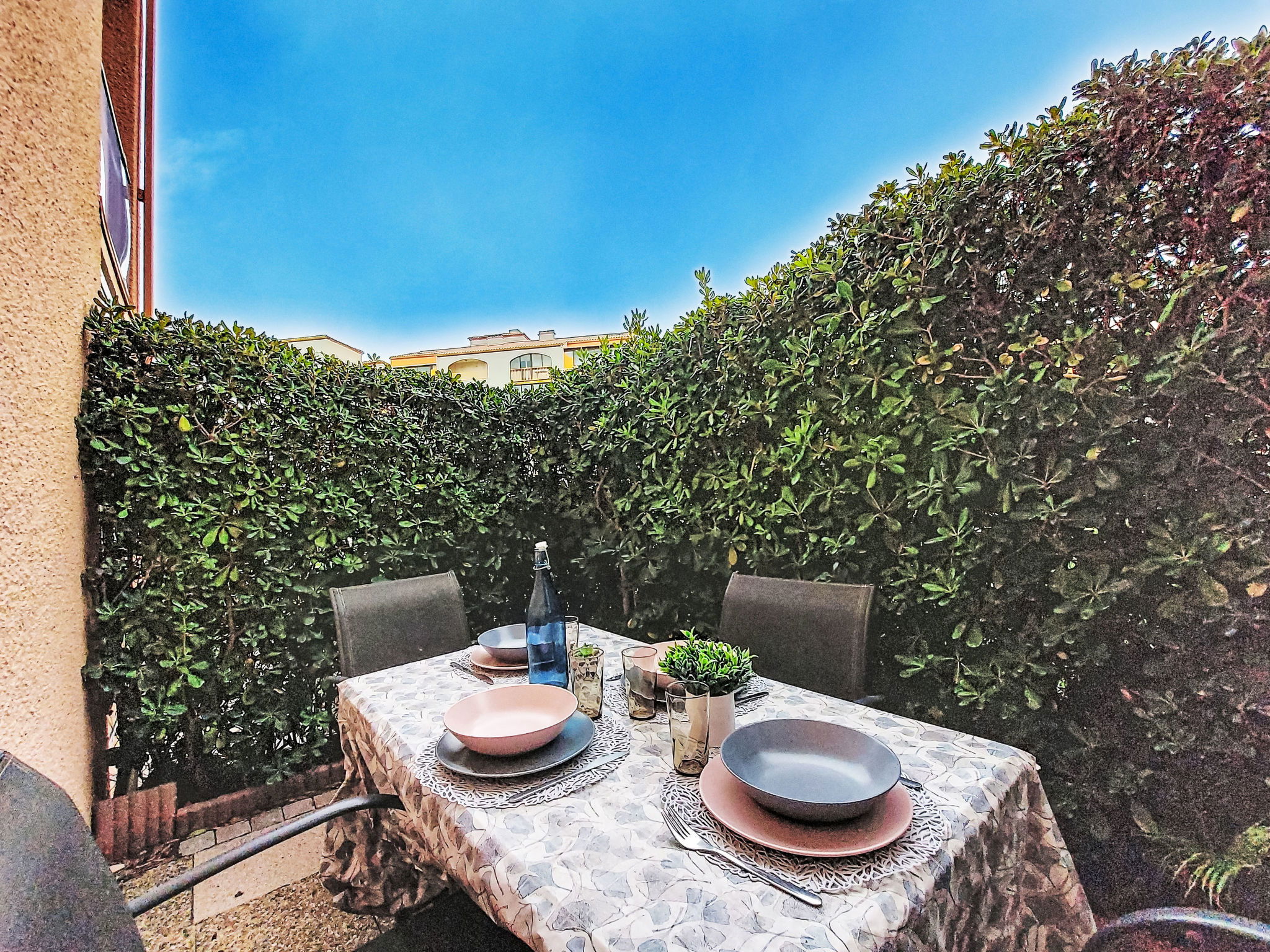 "Cap de mer", 2-room apartment 28 m2, on the ground floor, south-east facing position. Living/dining room with TV (flat screen). Exit to the terrace, to the loggia. 1 room with 1 french bed (1 x 140 cm, length 190 cm). Sleeping alcove with 1 x 2 bunk beds (90 cm, length 190 cm). Kitchenette (dishwasher, 4 ceramic glass hob hotplates, toaster, kettle, electric coffee machine, combination microwave). Shower/WC. Terrace 9 m2. Terrace furniture, covered balcony. Facilities: washing machine. Internet (WiFi, extra). Parking. Please note: maximum 1 pet/ dog allowed. Smoke alarm. Offer by a private individual according to Art. 155, IV of CGI.