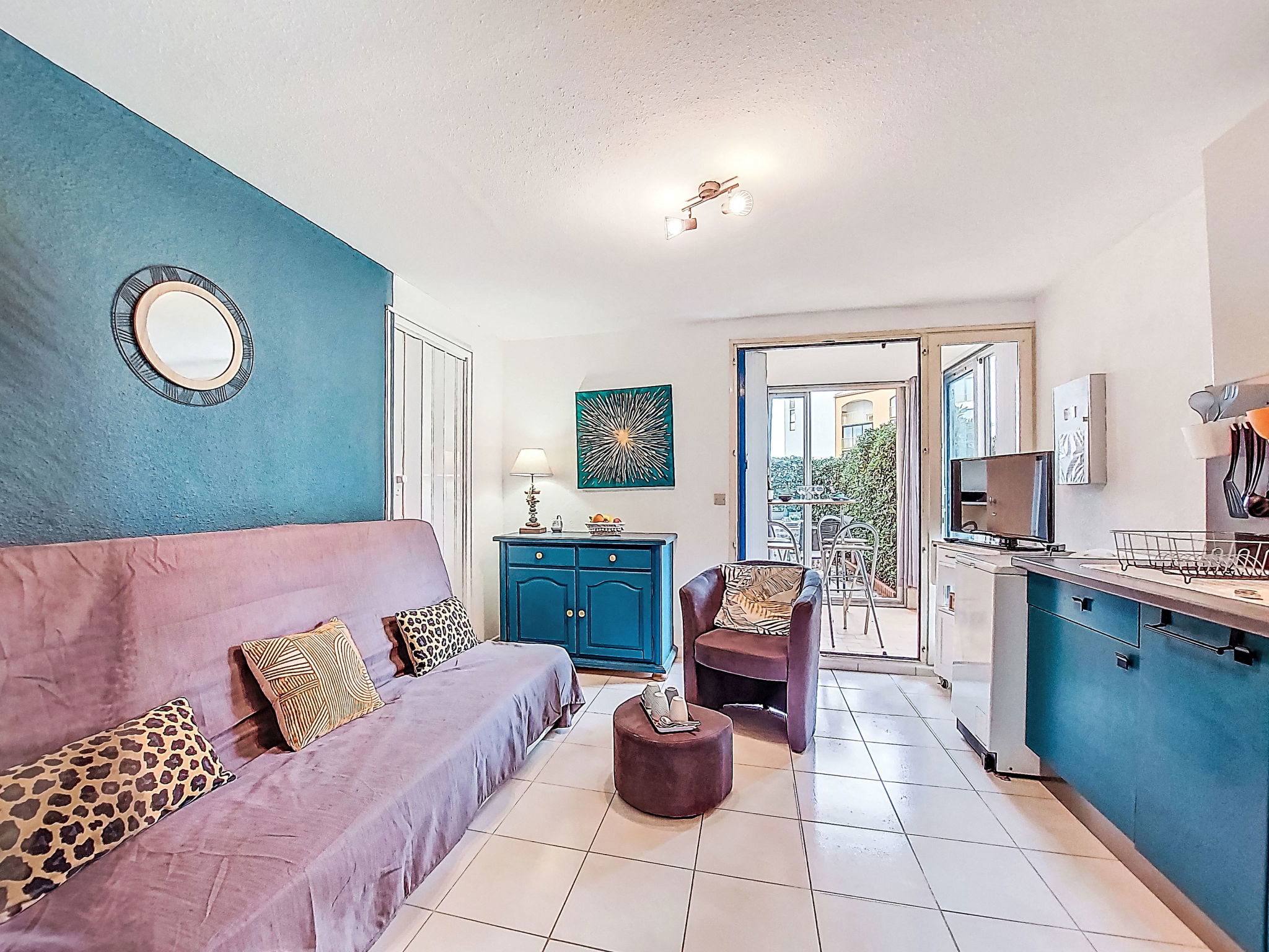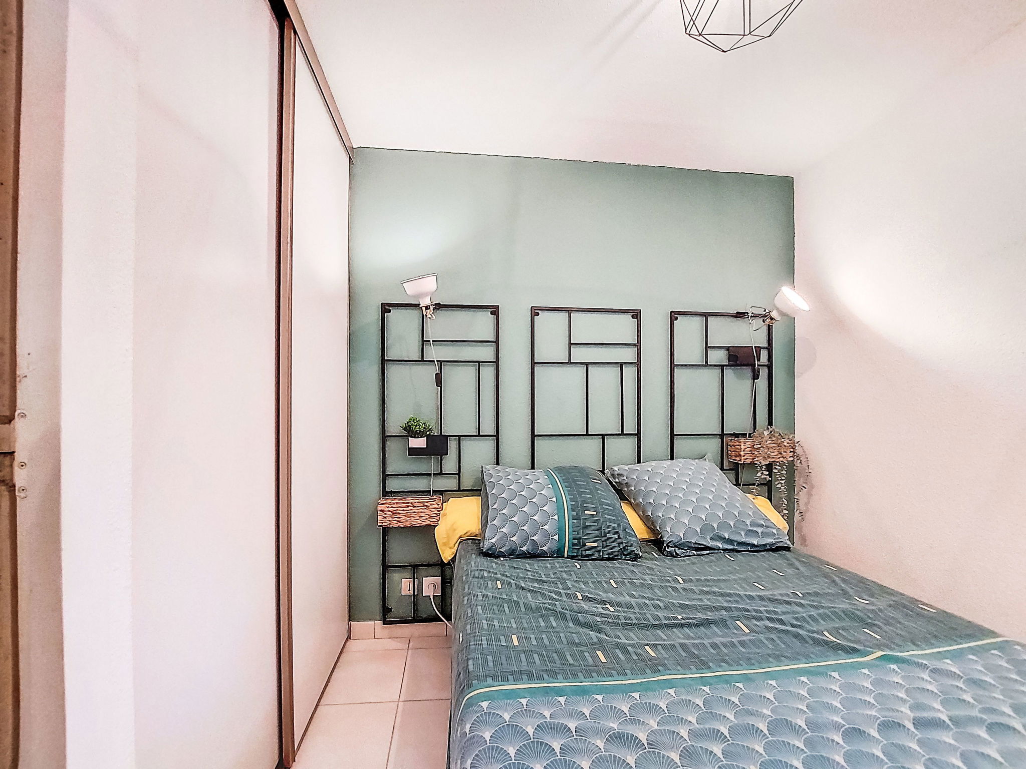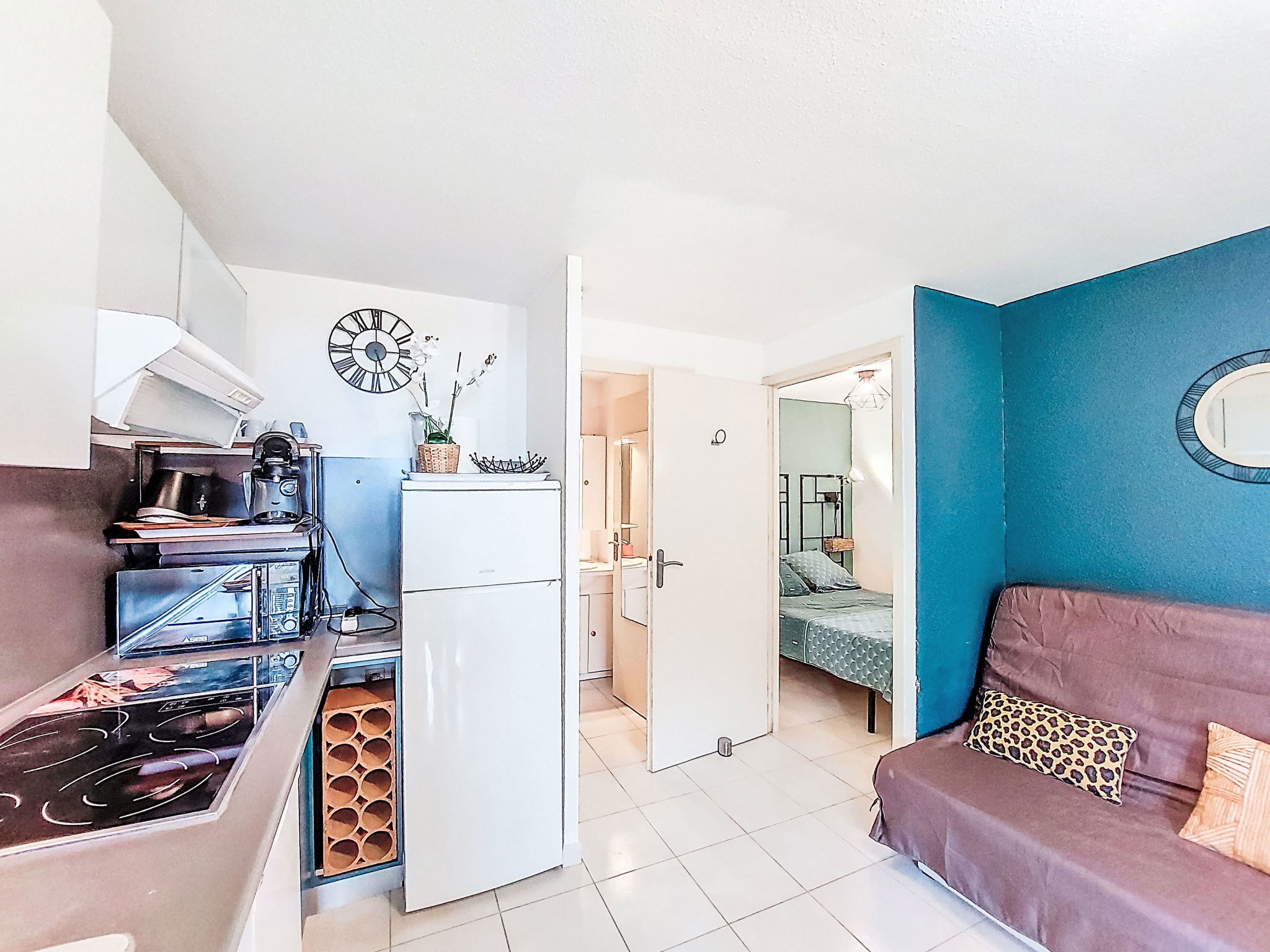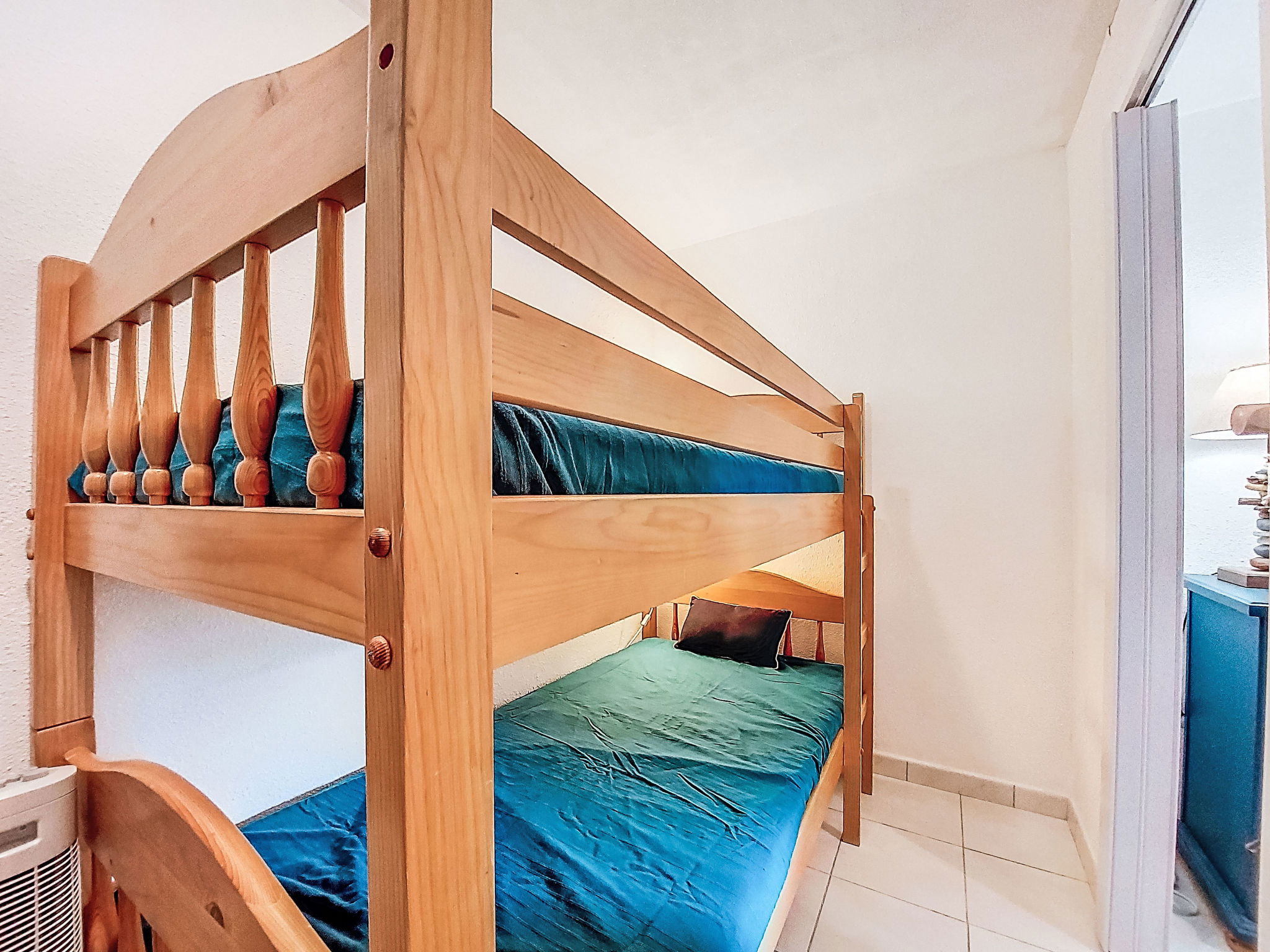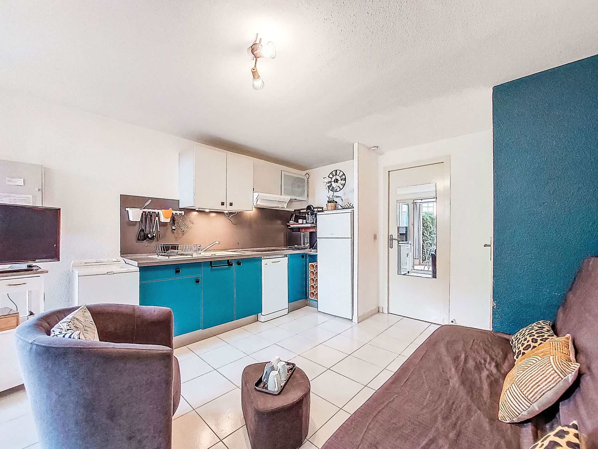 "Cap de mer", 2-room apartment 28 m2, on the ground floor, south-east facing position. Living/dining room with TV (flat screen). Exit to the terrace, to the loggia. 1 room with 1 french bed (1 x 140 cm, length 190 cm). Sleeping alcove with 1 x 2 bunk beds (90 cm, length 190 cm). Kitchenette (dishwasher, 4 ceramic glass hob hotplates, toaster, kettle, electric coffee machine, combination microwave). Shower/WC. Terrace 9 m2. Terrace furniture, covered balcony. Facilities: washing machine. Internet (WiFi, extra). Parking. Please note: maximum 1 pet/ dog allowed. Smoke alarm. Offer by a private individual according to Art. 155, IV of CGI.