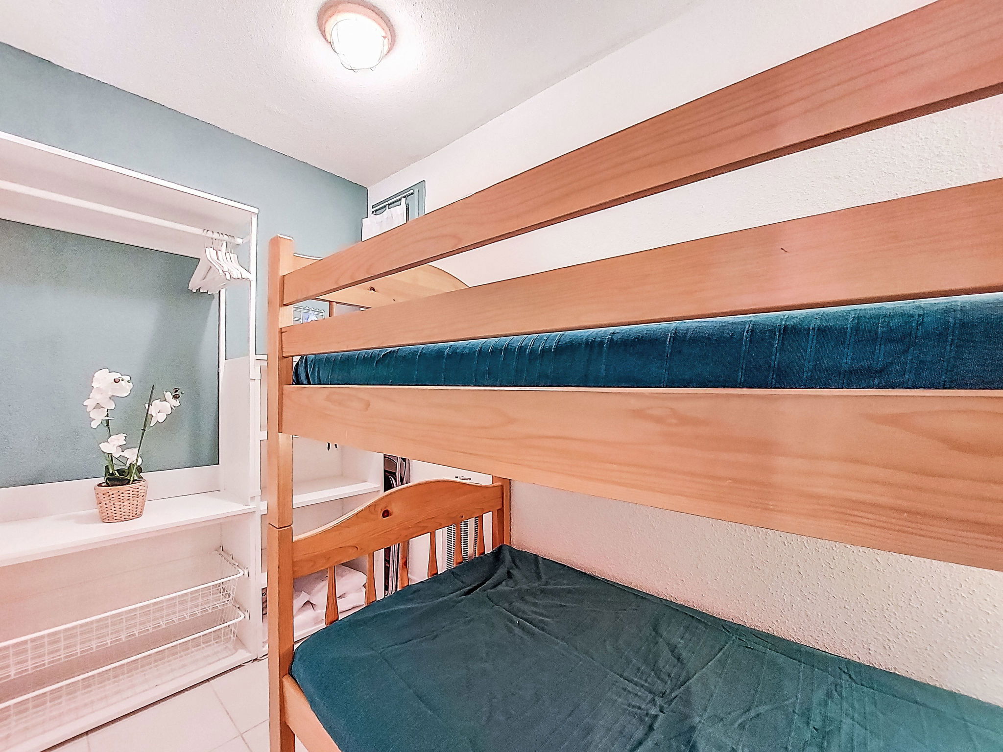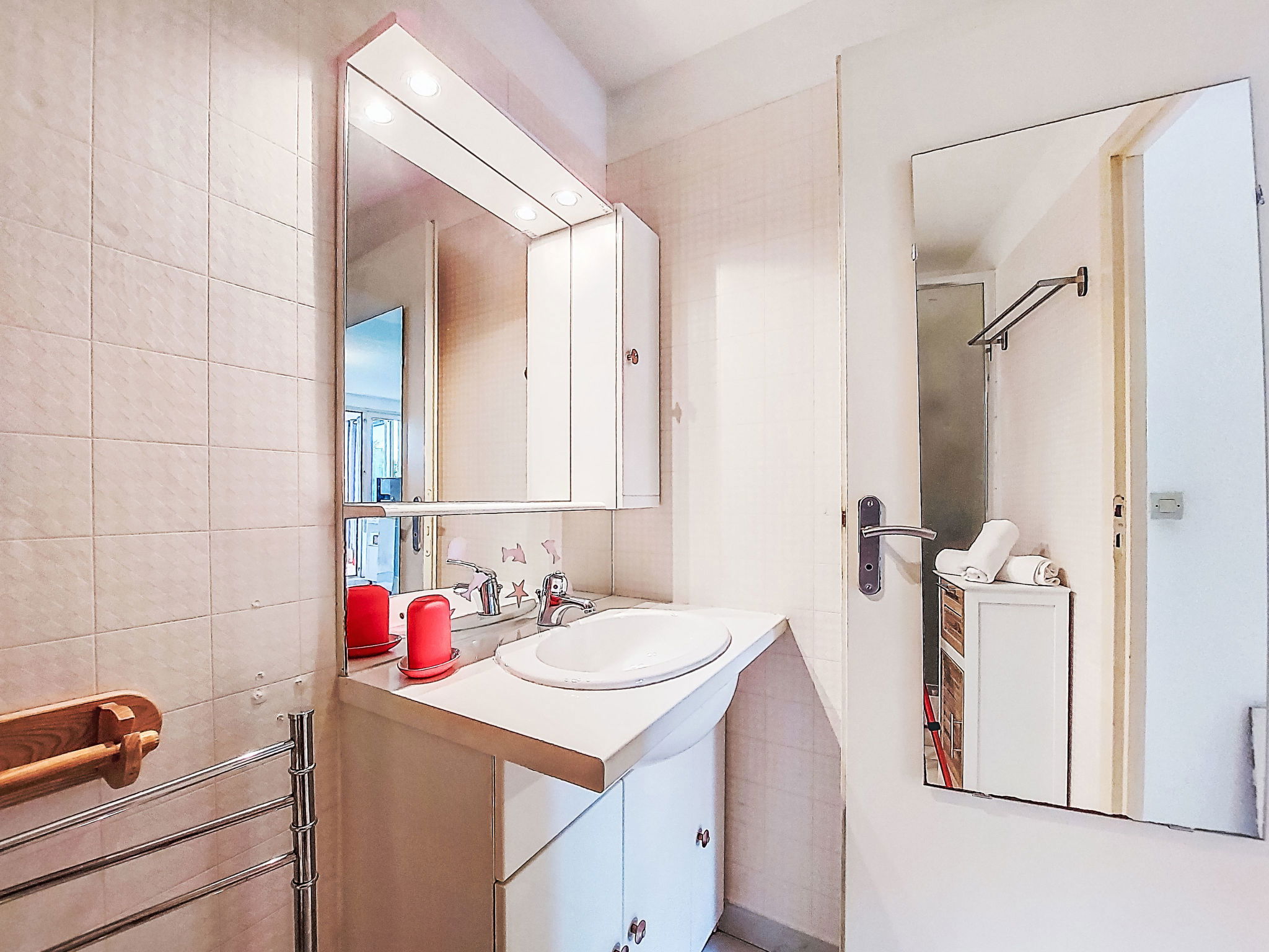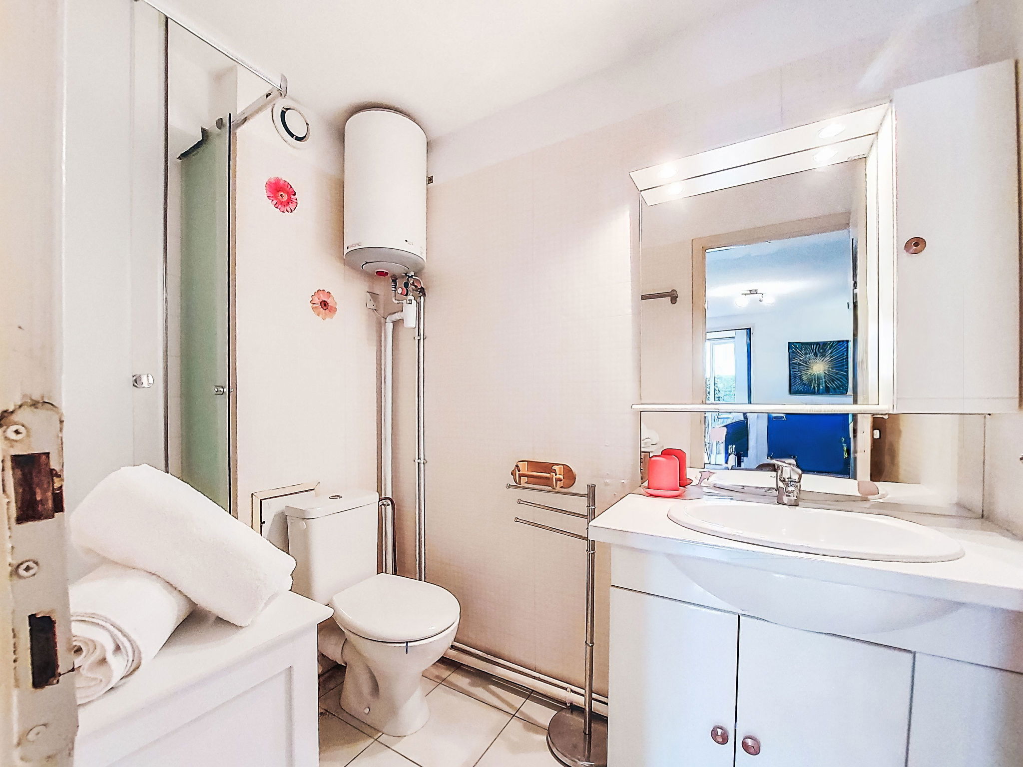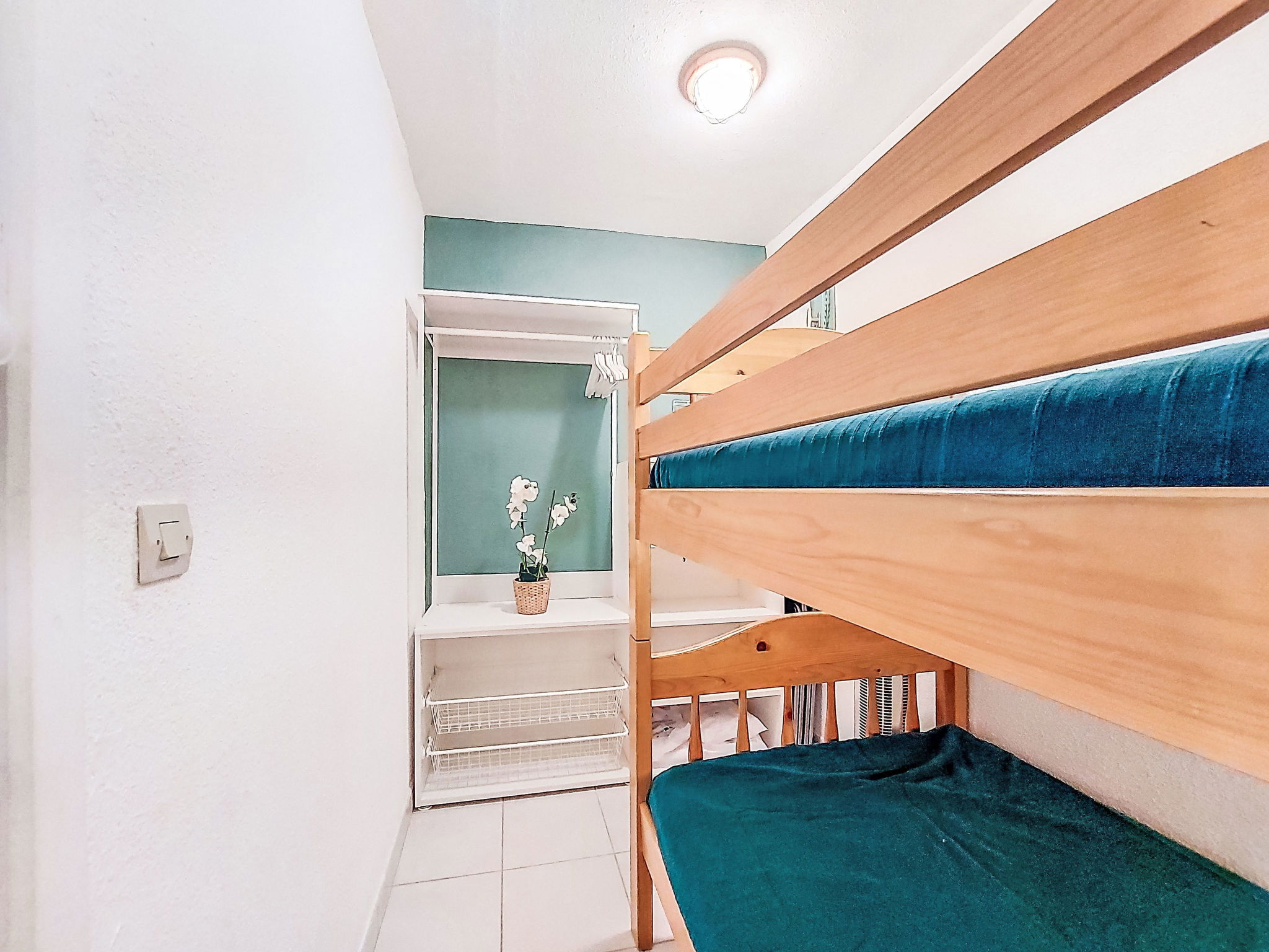 "Cap de mer", 2-room apartment 28 m2, on the ground floor, south-east facing position. Living/dining room with TV (flat screen). Exit to the terrace, to the loggia. 1 room with 1 french bed (1 x 140 cm, length 190 cm). Sleeping alcove with 1 x 2 bunk beds (90 cm, length 190 cm). Kitchenette (dishwasher, 4 ceramic glass hob hotplates, toaster, kettle, electric coffee machine, combination microwave). Shower/WC. Terrace 9 m2. Terrace furniture, covered balcony. Facilities: washing machine. Internet (WiFi, extra). Parking. Please note: maximum 1 pet/ dog allowed. Smoke alarm. Offer by a private individual according to Art. 155, IV of CGI.