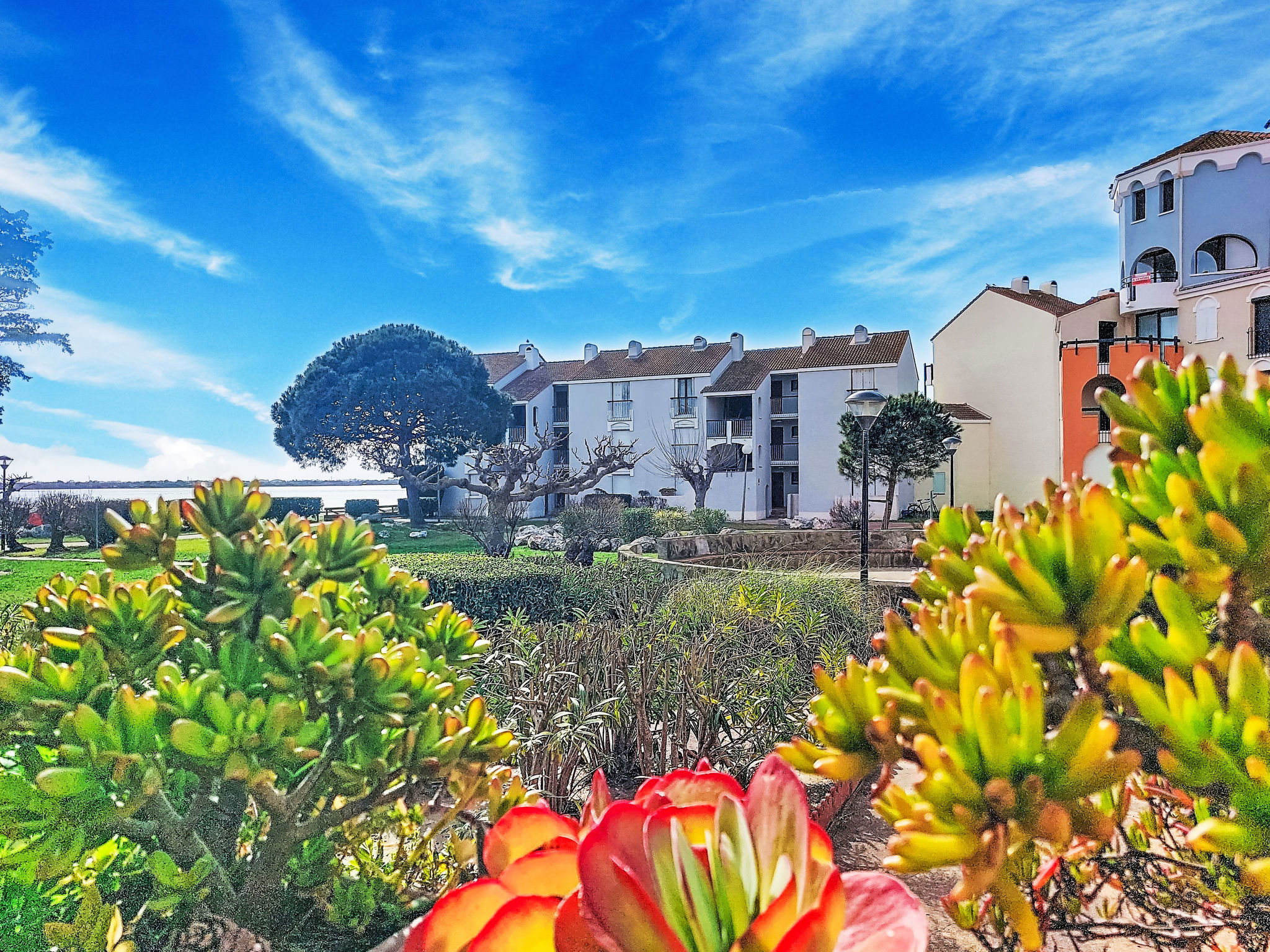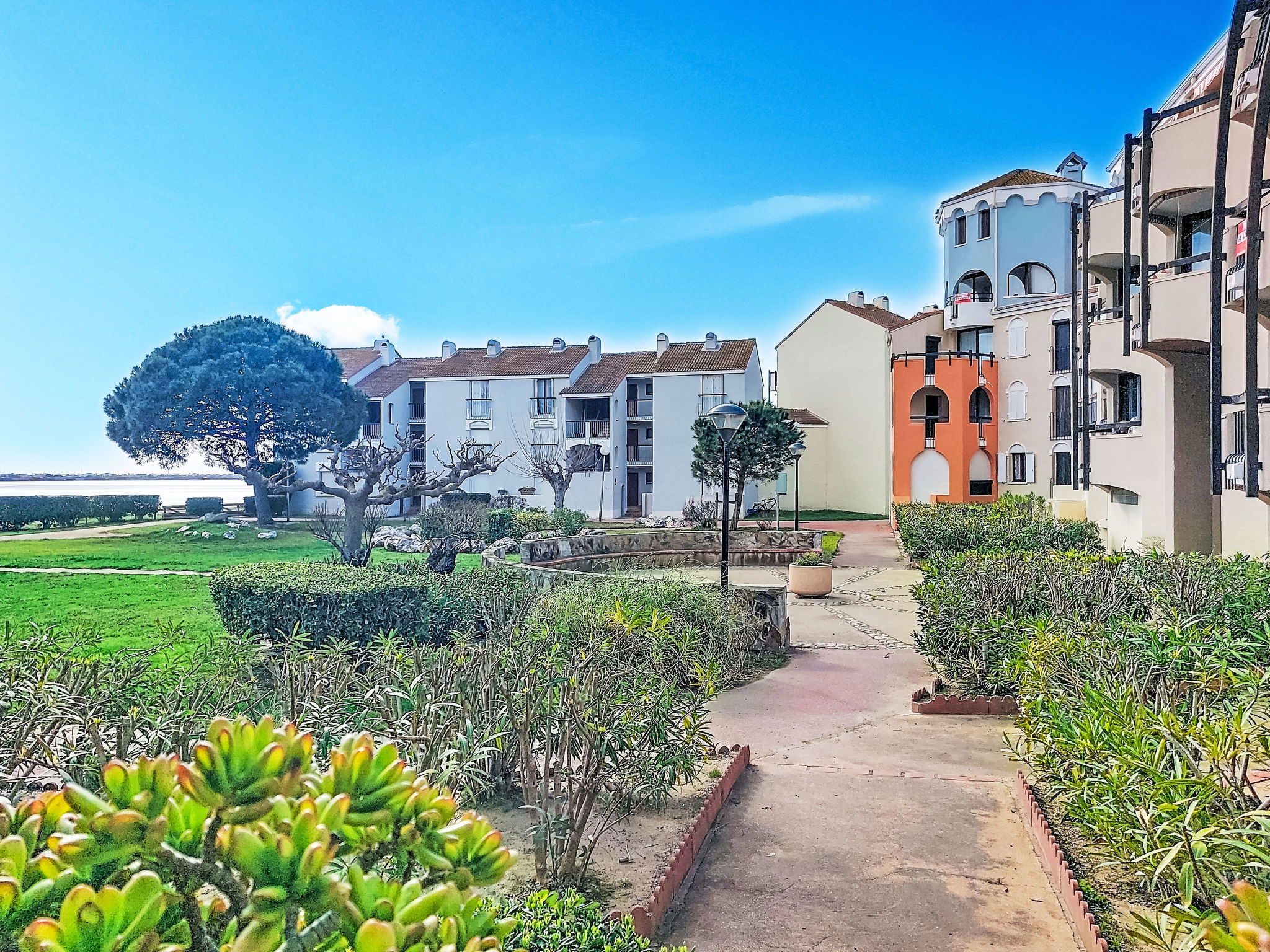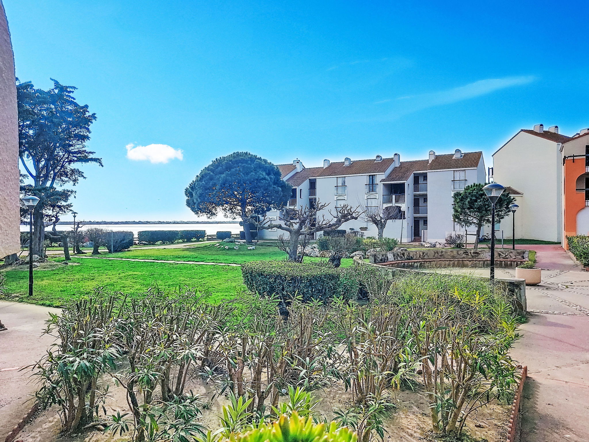 La Coudalère 5 km from Barcarès centre: Residence "Dominica", 3 storeys. 2.5 km from the sea, 50 m from the lake, 2.5 km from the beach. For shared use: beautiful garden to relax, 2 swimming pools heated (10 x 15 m, seasonal availability: 15.Apr. - 15.Oct.). Children's pool, tennis (extra), basketball (extra), children's playground (slide), public parking. Shop, grocery 400 m, supermarket 6 km, restaurant, bar, bakery, café 400 m, bus stop "La coudalère" 1 km, railway station "Perpignan" 22 km, sandy beach 2.5 km. Sailing school 400 m, minigolf 1.3 km, riding stable 12 km. Nearby attractions: Réserve Africaine de Sigean 41 km, Aqualand Port Leucate 7 km, parcours aventure 7 km, cinéma 5 km, Téleski nautique site des dosses 5 km, Spot de windsurf 400 m. Well-known lakes can easily be reached: Lac de villeneuve de la Raho 34 km. Hiking paths: Sentier du guetteur 8 km, la forteresse de salses 15 km, Sentier du littoral Collioure 40 km. Please note: car recommended, no lift. Entertainment in the season. The keys‘ handover takes place by the agency Barcares 3 km. The apartment is located in a zone with limited traffic. The photograph shows a typical example. Additional accommodations can be booked. As part of the water restriction measures linked to the drought in some of our departments, please note that the rental swimming pool may be closed by prefectural decree.