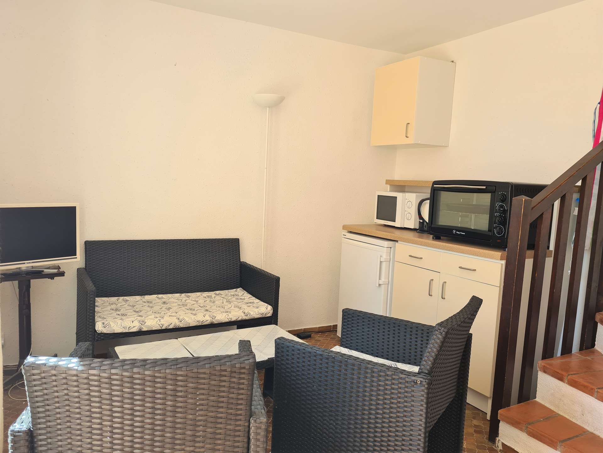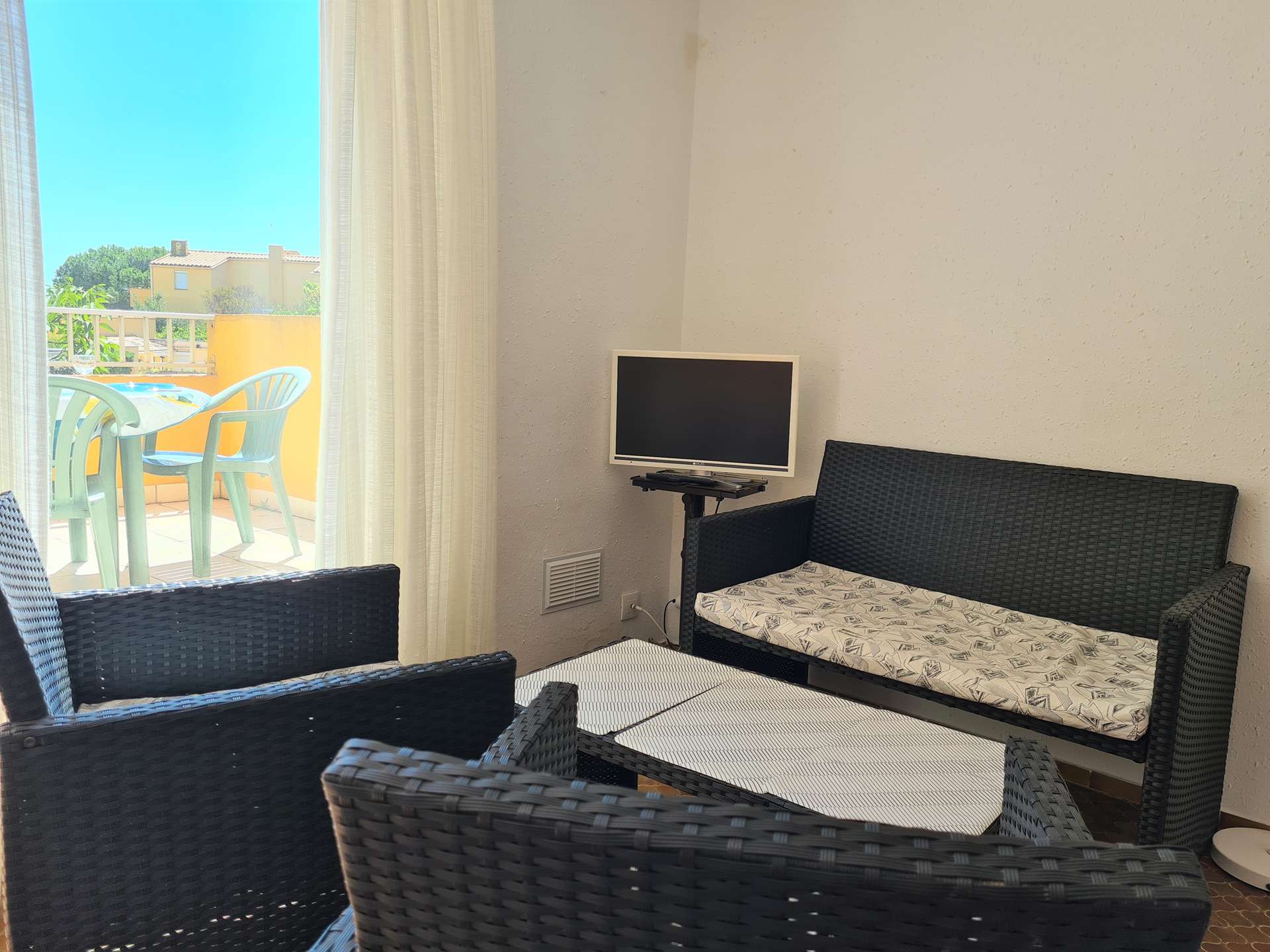 Cap d'Agde (34) - Plage de la Roquille district - Residence Les Agathes Plus 3-room apartment/mezzanine - approximately 60 m² - up to 6 people. Located 400 m from La Roquille beach, the "Les Agathes Plus" residence is a set of small buildings on one floor surrounded by gardens, in a quiet area, while being only 600 m from the port centre. This holiday apartment, located on the 1st floor, includes a living room with a sofa and television, a bedroom with a double bed, upstairs a large mezzanine (with window) with two single beds, and a bedroom with a double bed. 2 places, an equipped kitchen area, a bathroom with WC. The "Plus" of this rental by the sea: private parking, beautiful terrace of about 10 m² facing south overlooking the gardens of the residence, with garden furniture. end of stay cleaning included