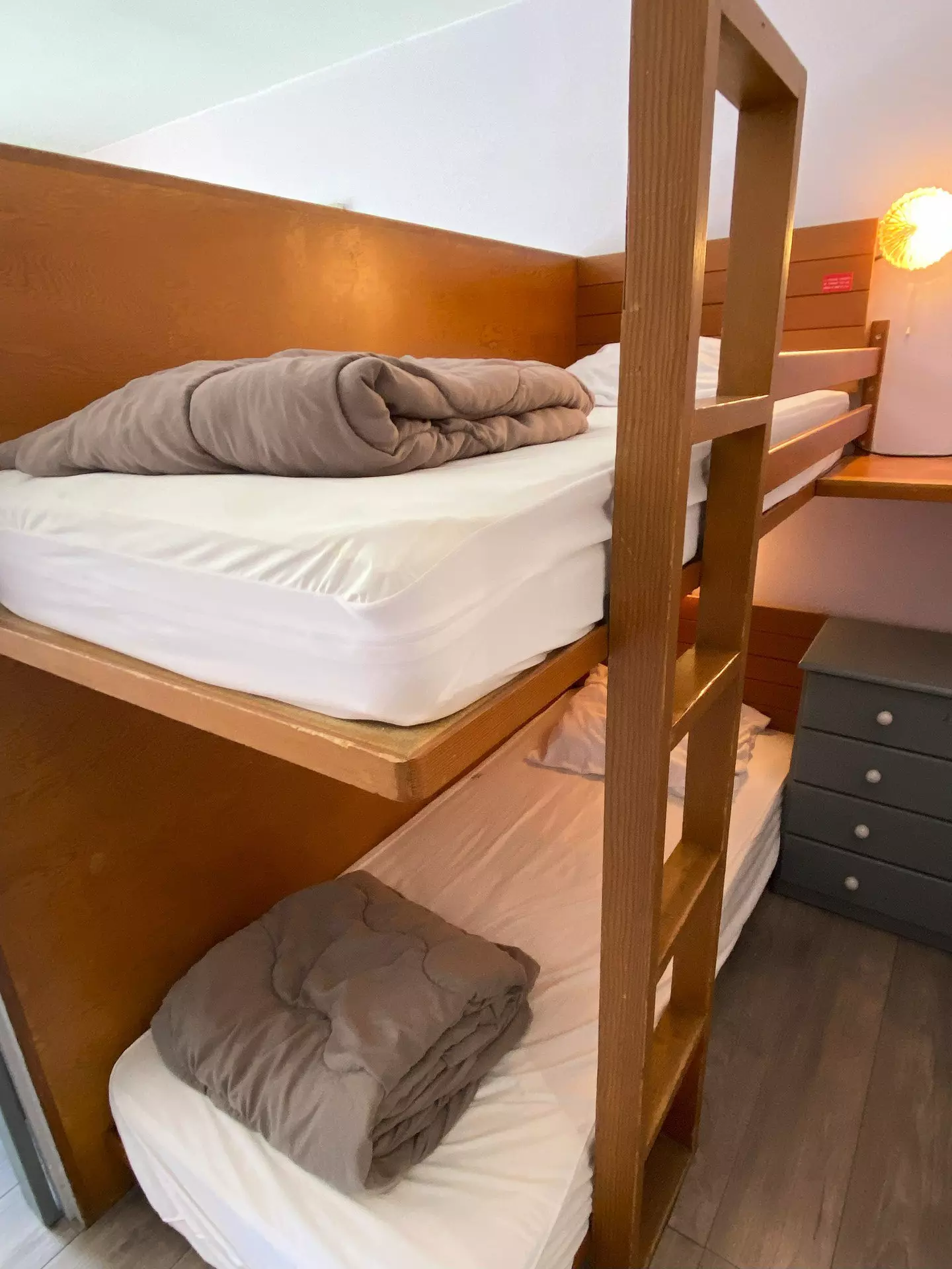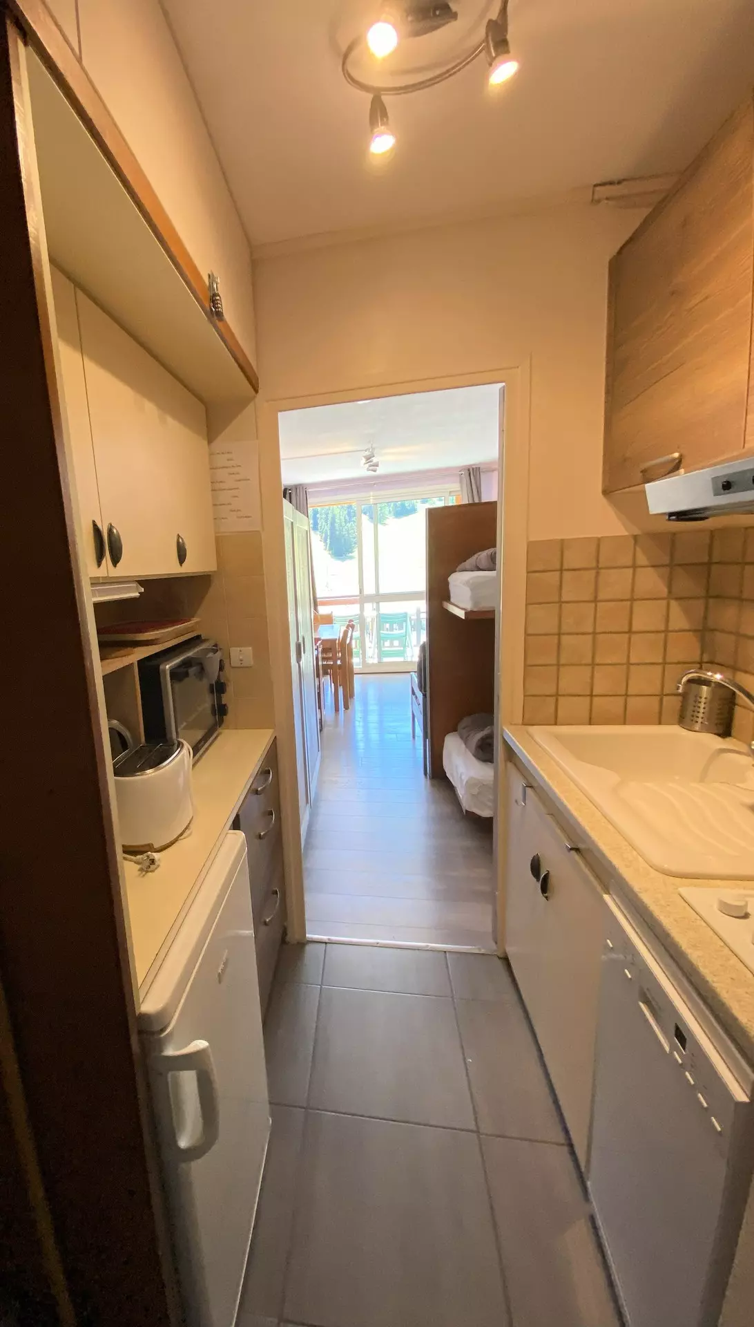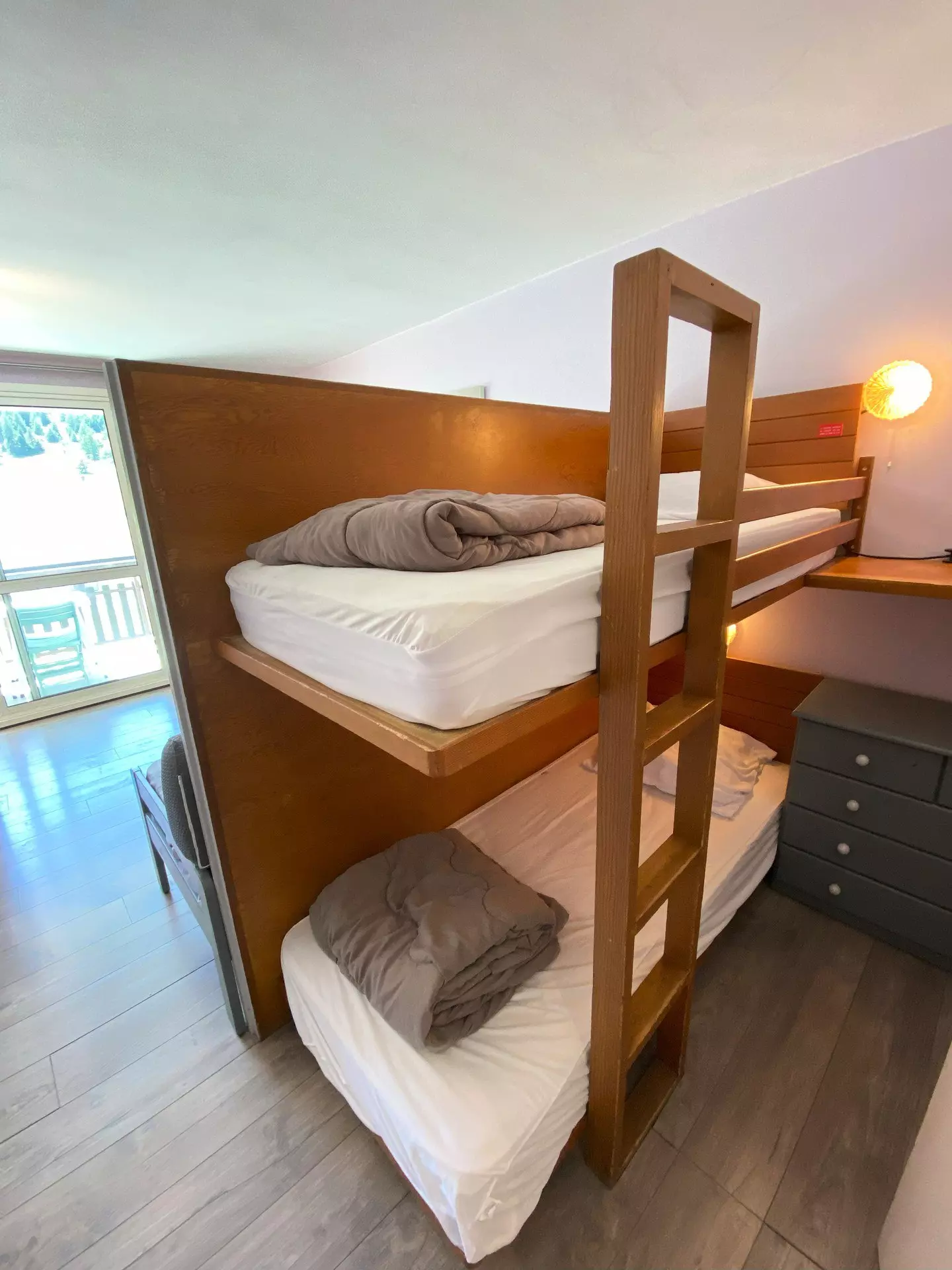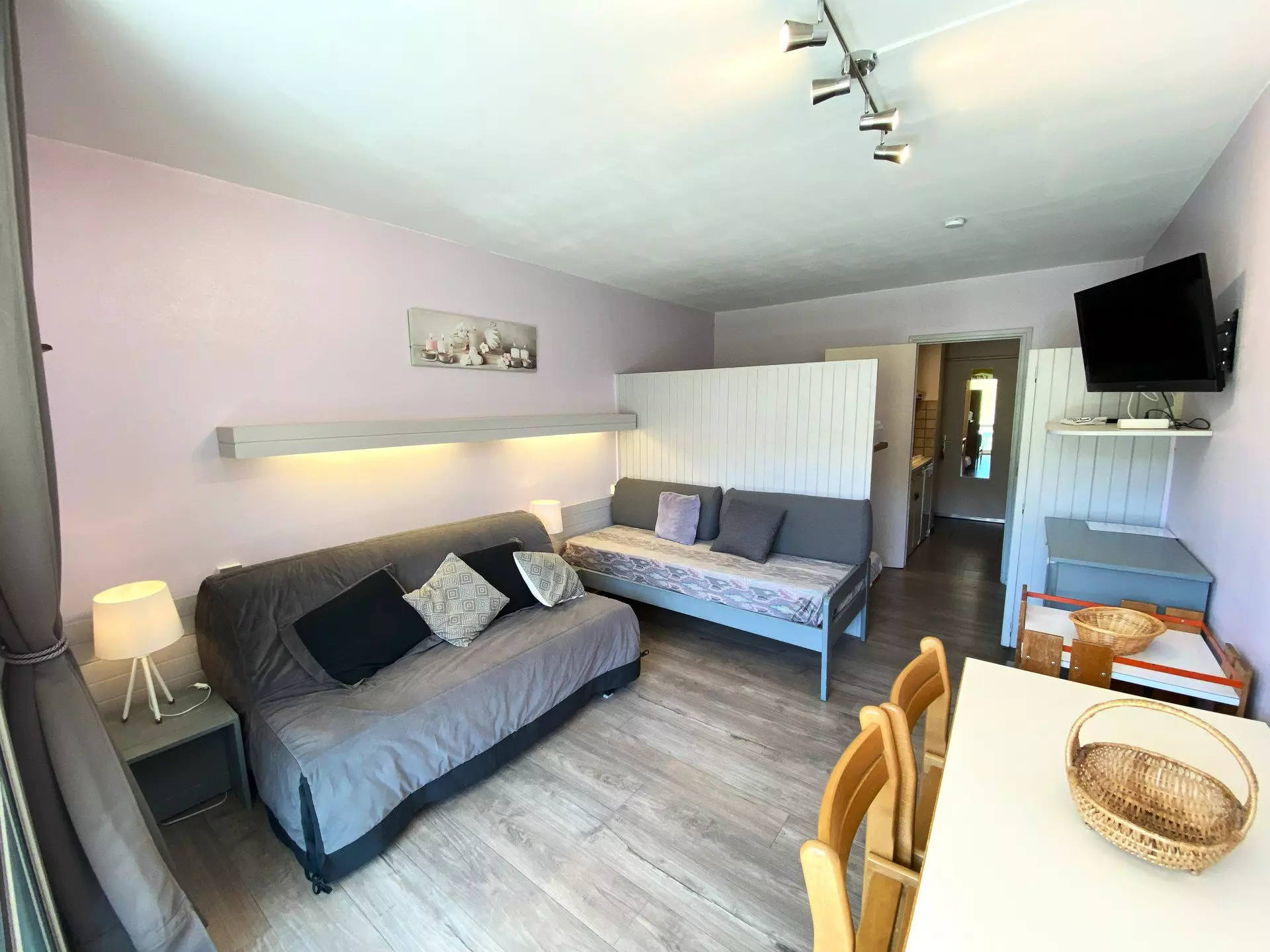 Living room with dining area, 1 sofa bed and 1 single bed. Separated from the sleeping area (2 bunk beds) by a wooden partition, TV included.