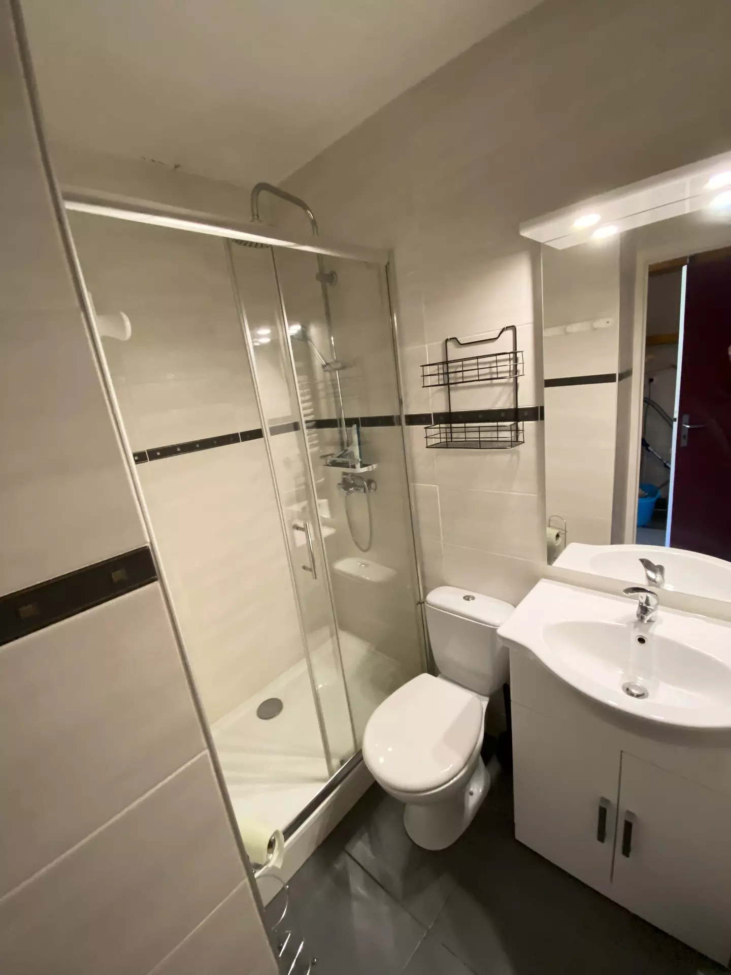 Shower room with shower, sink and toilet.