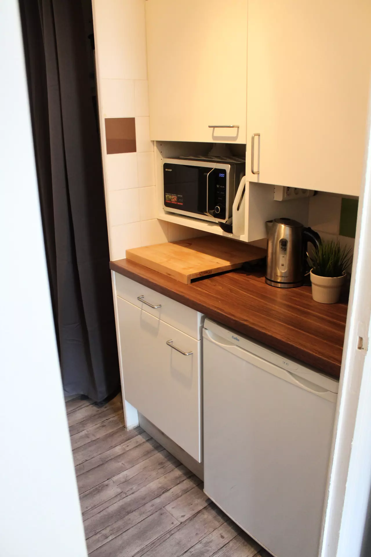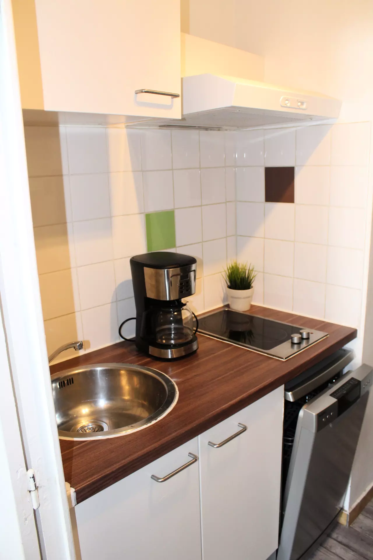 Kitchenette with 2 electric hotplates, microwave, filter coffee maker, toaster, electric kettle, refrigerator and dishwasher.