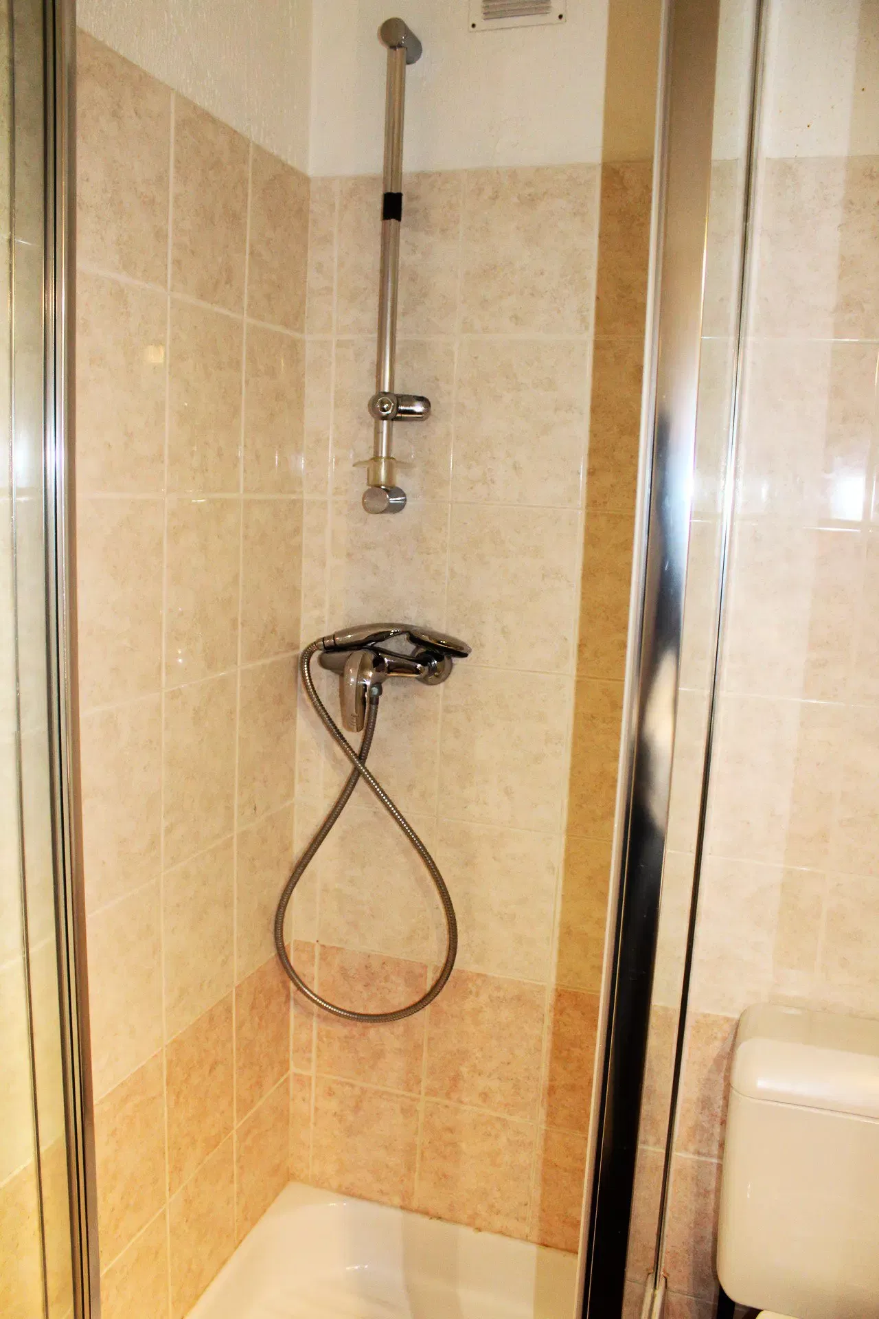 Shower room with shower, sink and toilet.