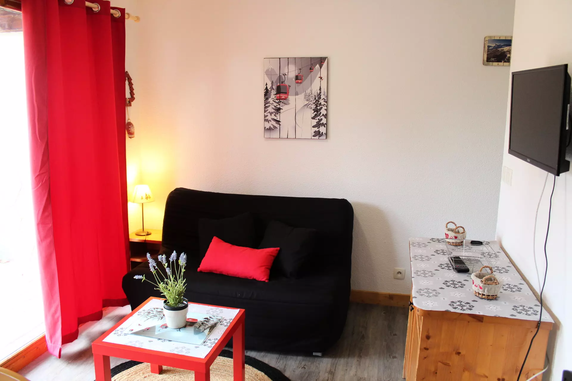 Living room with kitchenette with dishwasher, oven, microwave and large refrigerator with freezer compartment, filter coffee maker, toaster, electric kettle, Raclette machine.