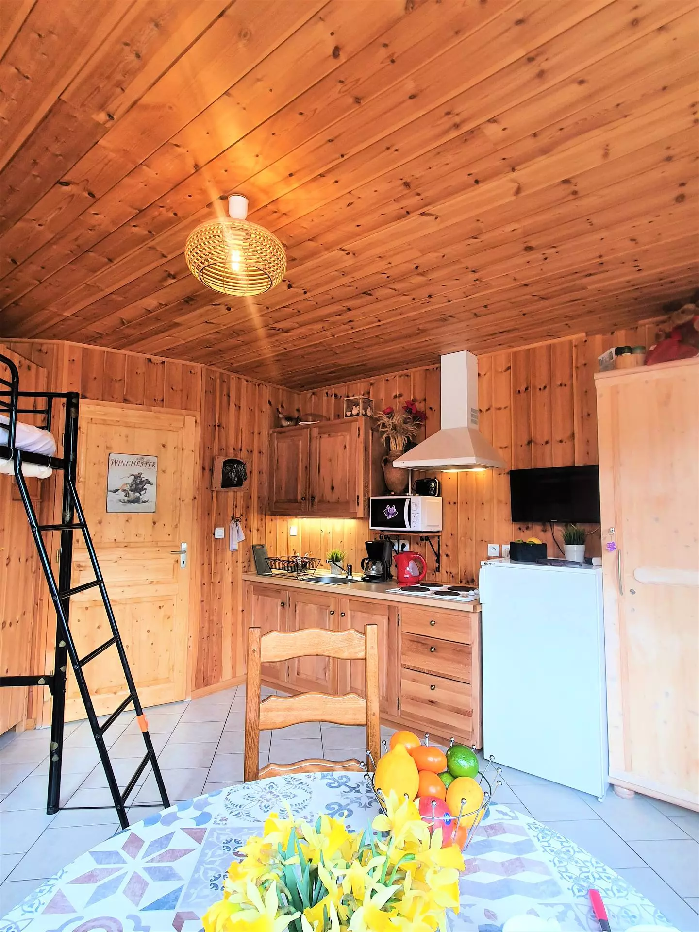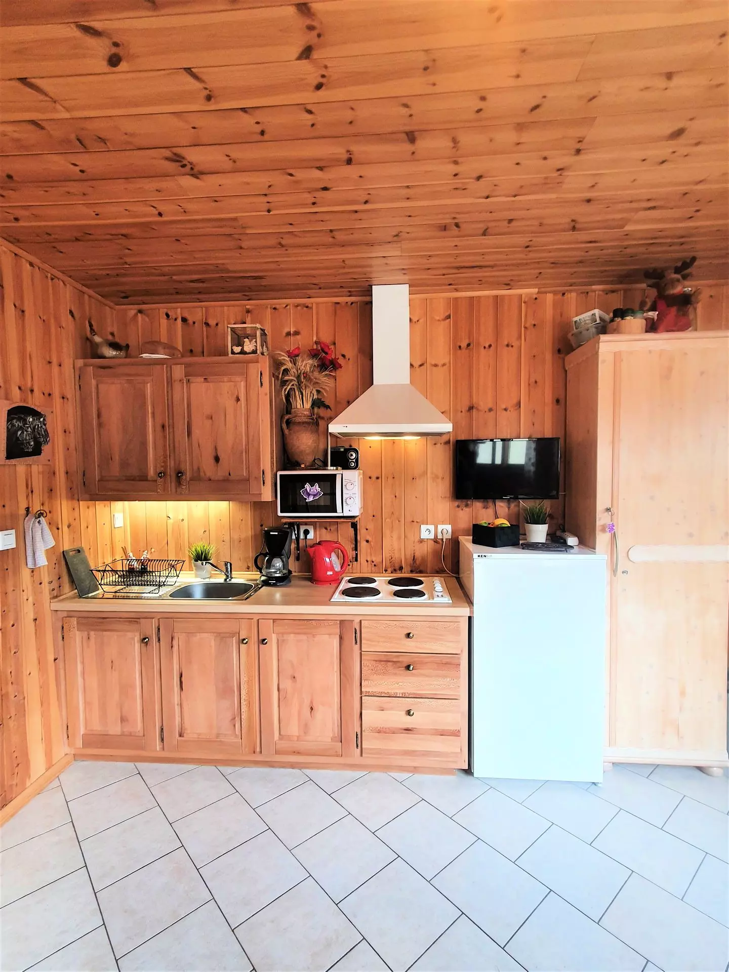 Equipped kitchenette, microwave, filter coffee maker and Nespresso-Krups, toaster, electric kettle, Raclette machine.