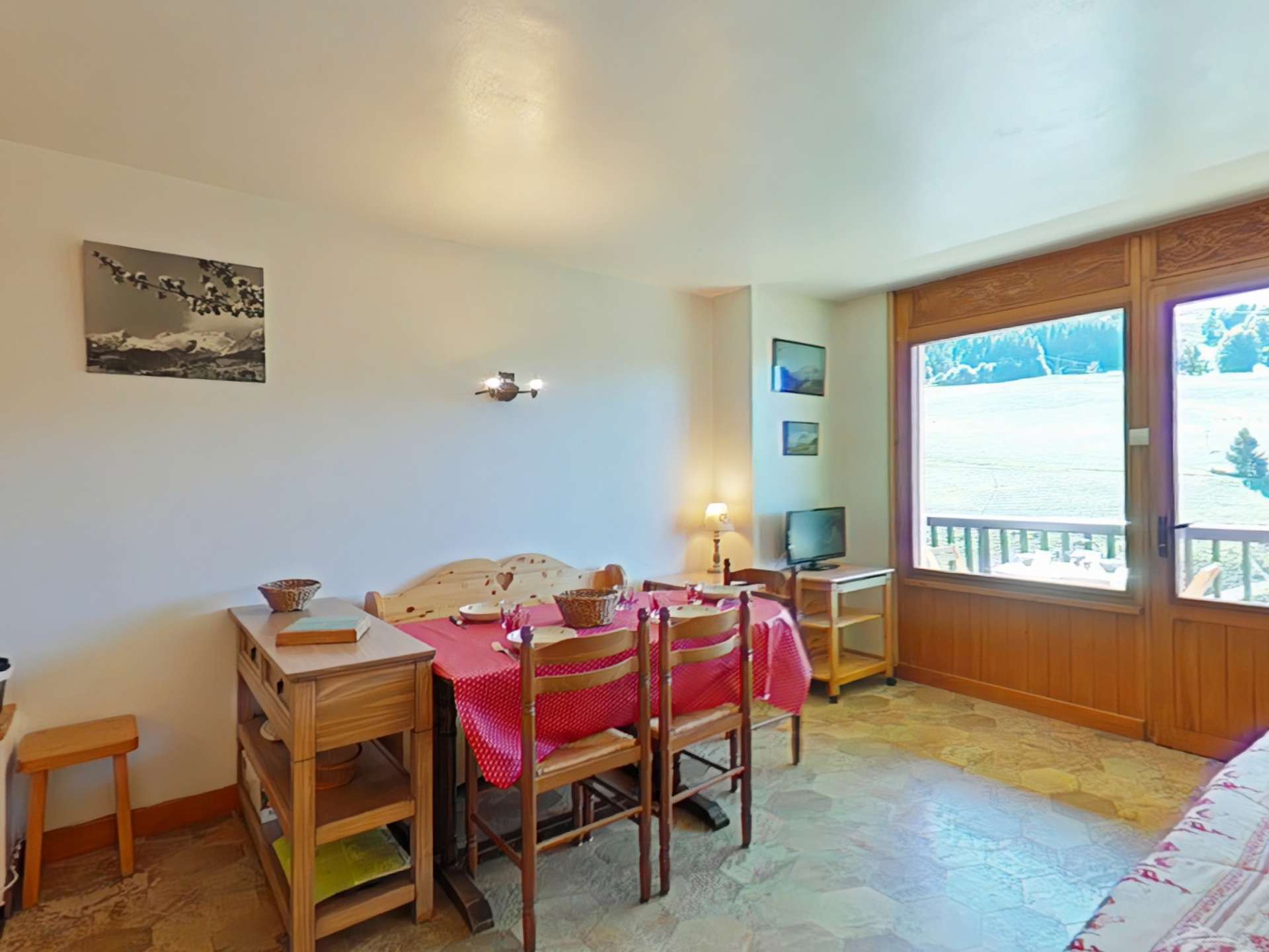 This holiday apartment located on the 2nd floor, without elevator, consists of a living room with convertible sofa bed for 2 people and television opening onto a south-facing balcony with a view of the ski area, an equipped kitchen area with dishwasher, a bedroom with 1 bed for 2 people and 1 bunk bed for 1 person, a bathroom with a hip bathtub and a WC.