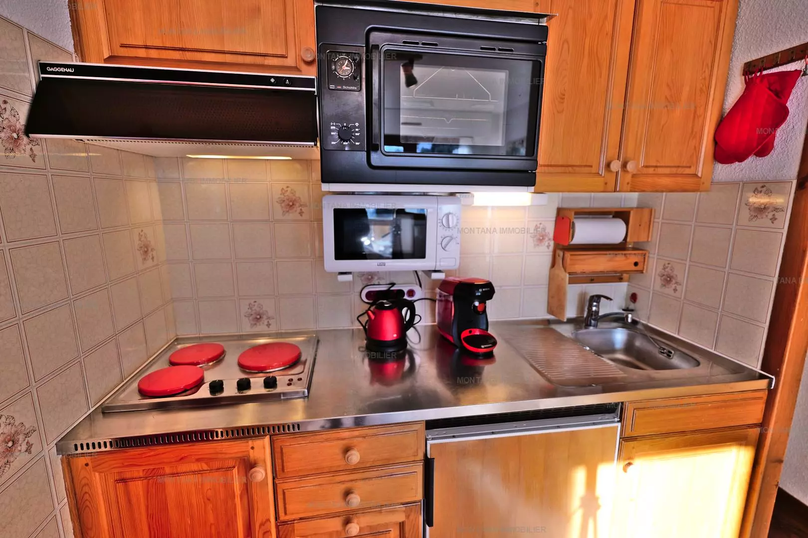 A fully equipped kitchen opening onto the living room