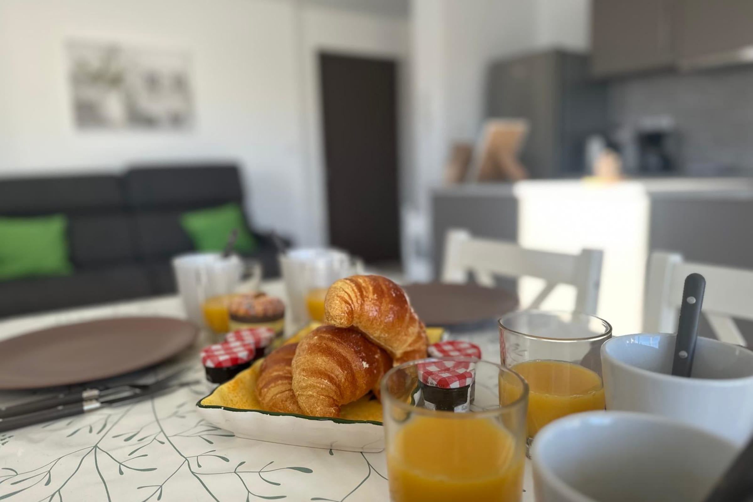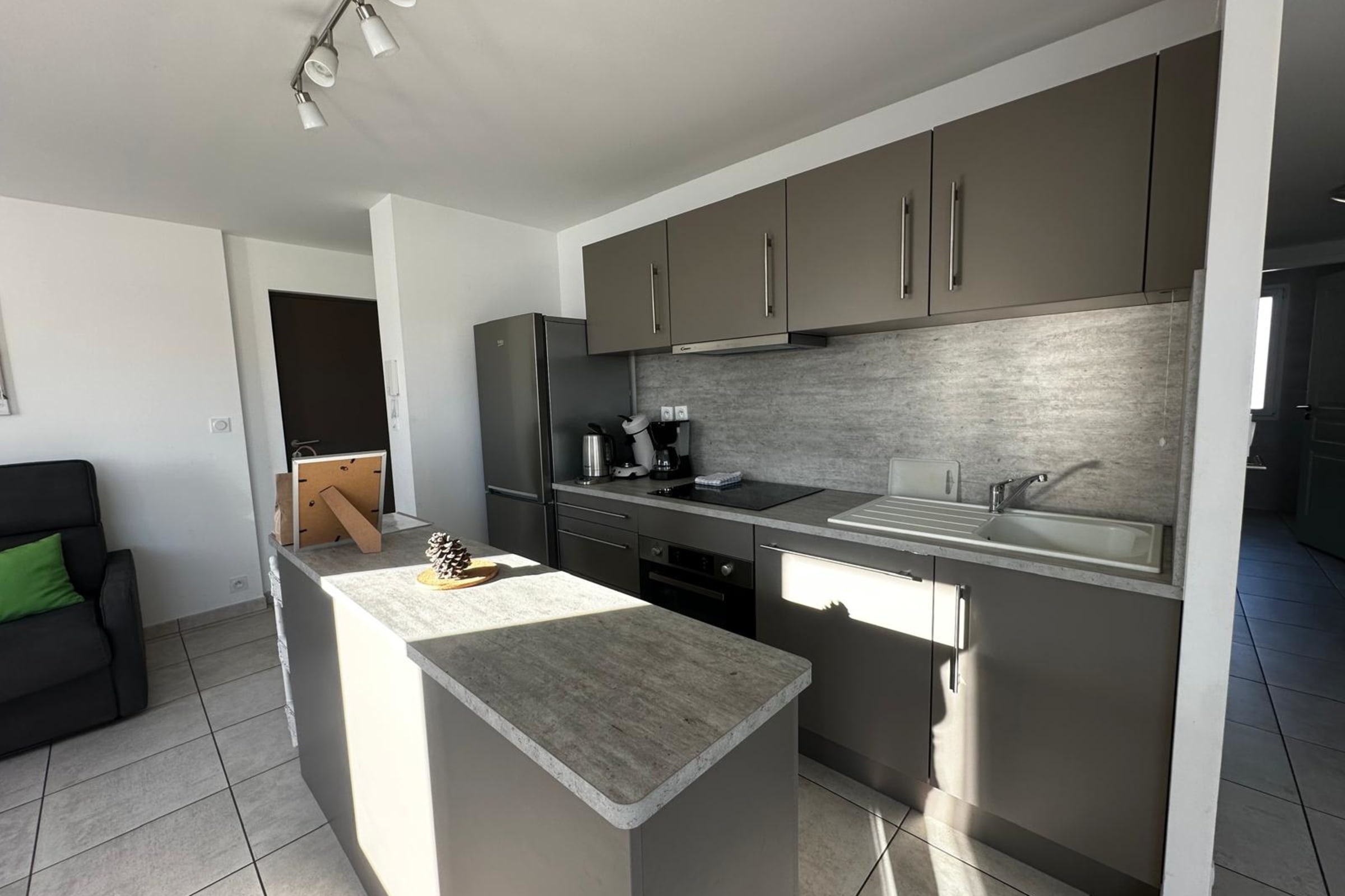 La Roselière features a bright living room with a fully equipped open kitchen and central island, plus a dining area. The kitchen includes a coffee machine, toaster, kettle, microwave-oven combo, fridge, and all cooking utensils you might need.