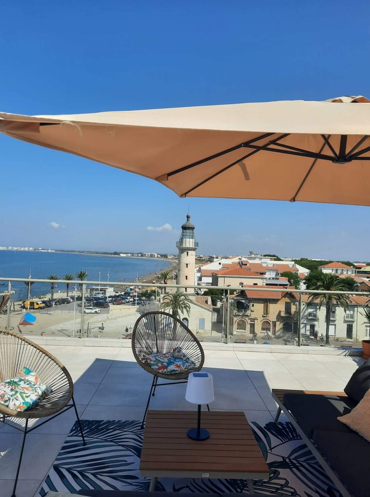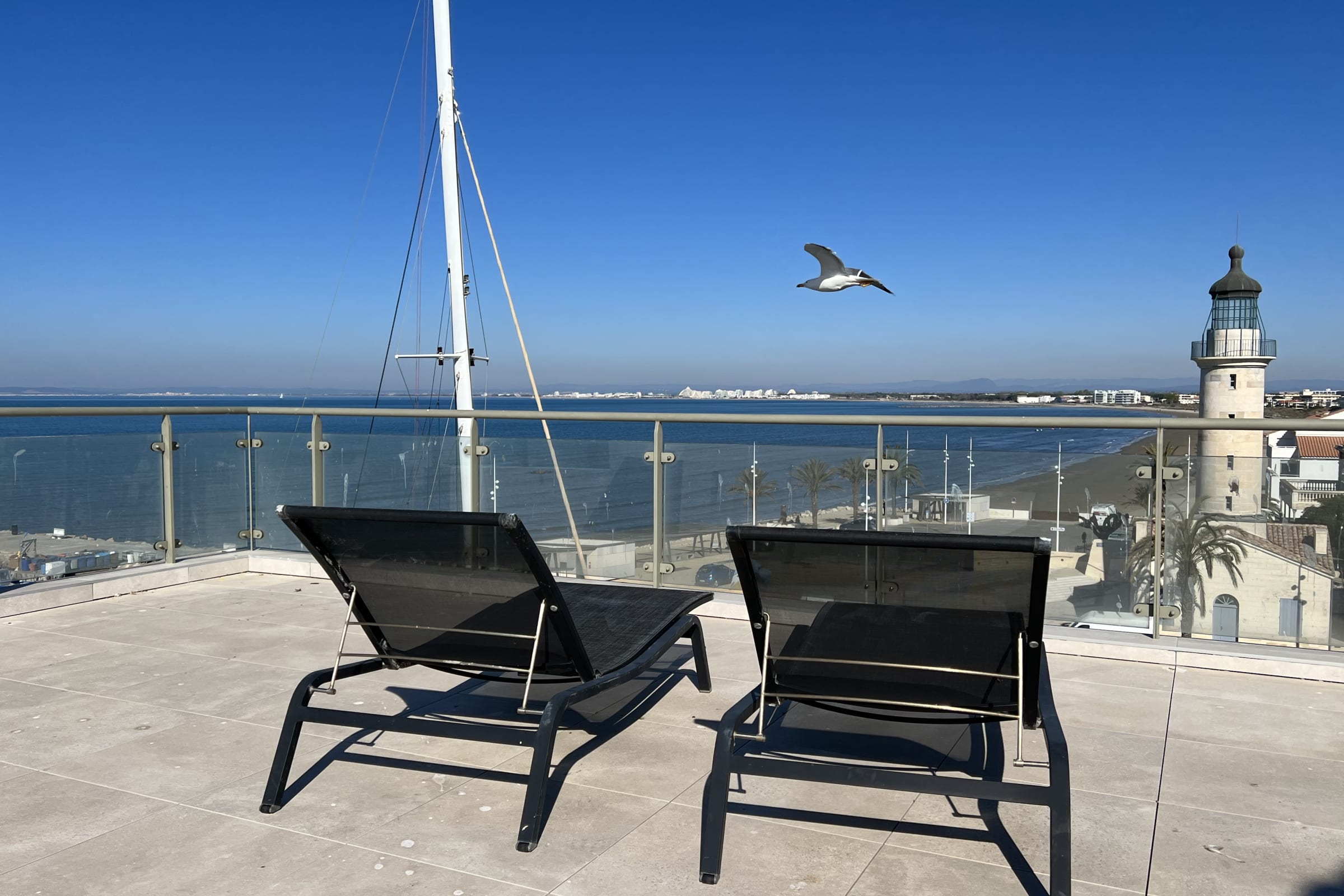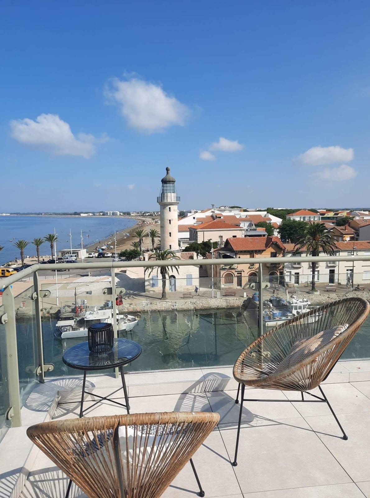 Discover Le Phare du Grau, an exceptional duplex featuring a stunning 100 sqm rooftop terrace with breathtaking panoramic views over the sea, the canal and the historic lighthouse of Le Grau du Roi.