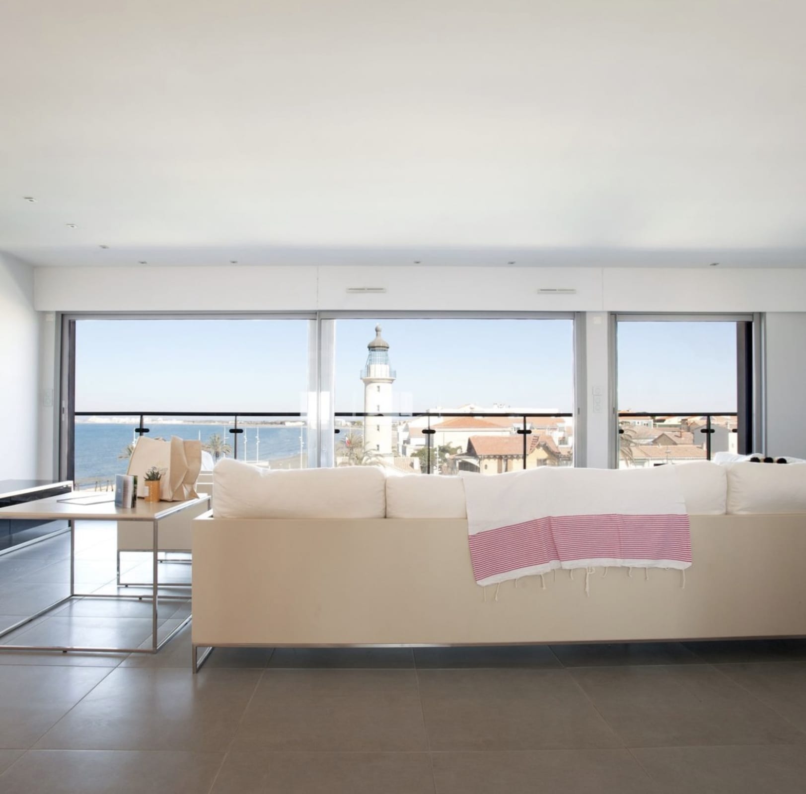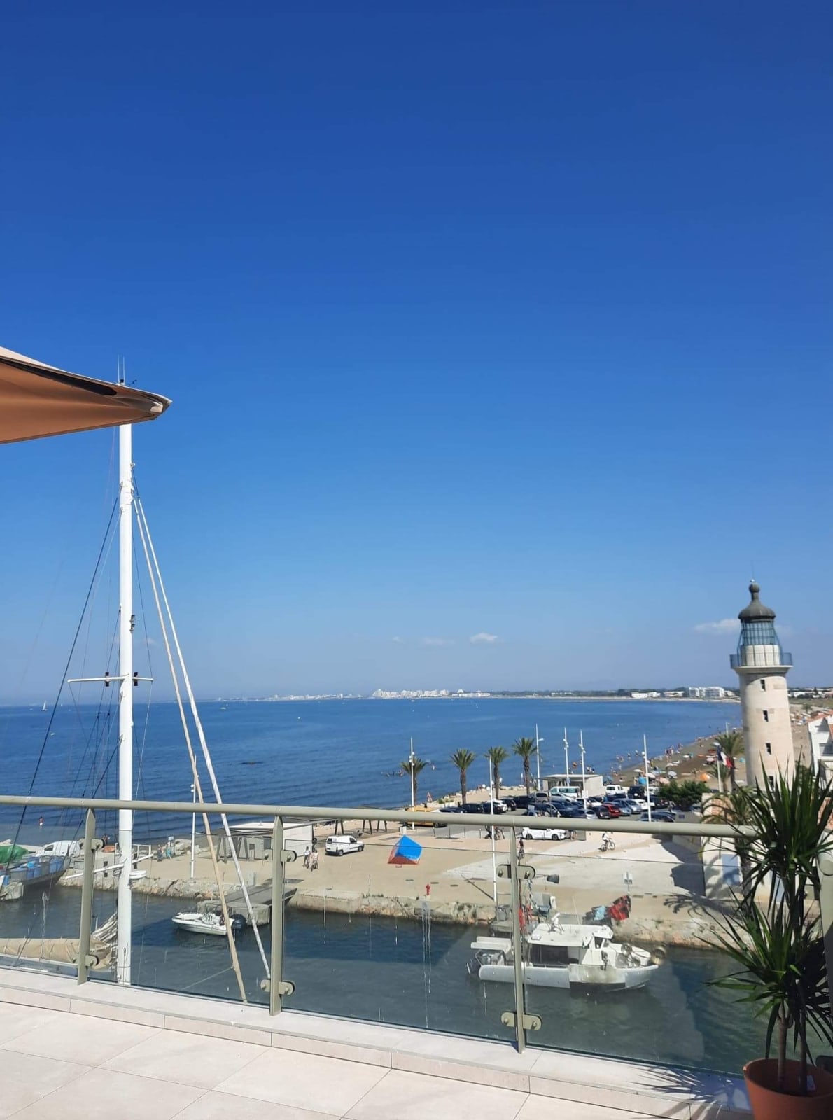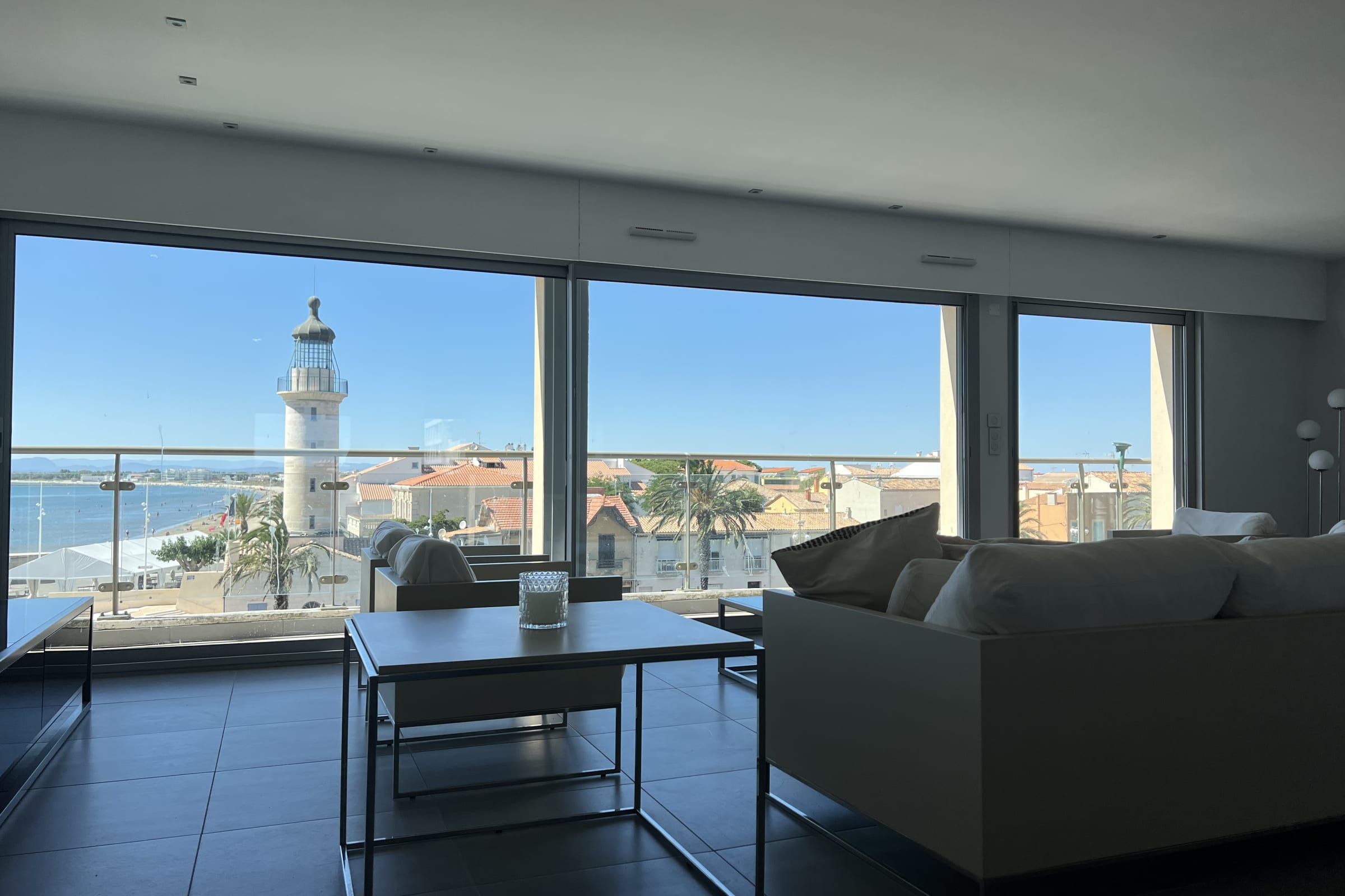 Discover Le Phare du Grau, an exceptional duplex featuring a stunning 100 sqm rooftop terrace with breathtaking panoramic views over the sea, the canal and the historic lighthouse of Le Grau du Roi.