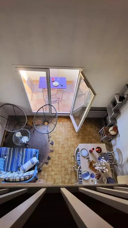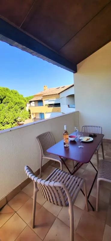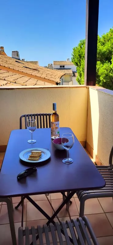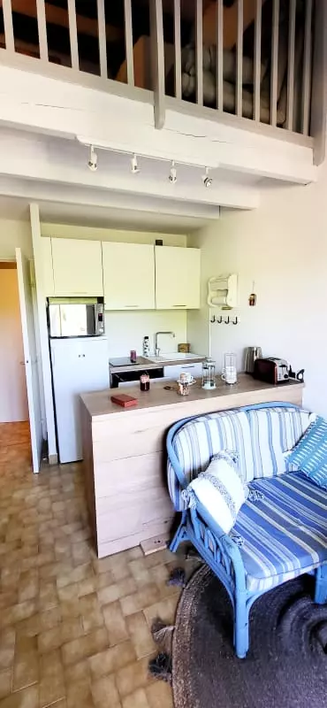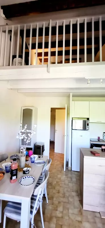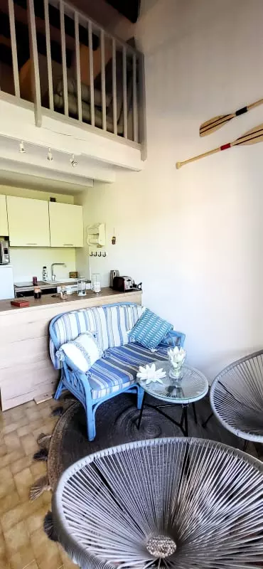 Duplex Type 2 with bedroom and cabin with mezzanine nestled in a green setting for a stay by the sea! 650 m from the Beach Access n° X Quiet area of Boucanet, 600m from the shops. This 1 bedroom apartment with terrace offers comfort thanks to the quality of its equipment and its decoration. Right Bank 1.5 km from the city center of Grau du Roi.