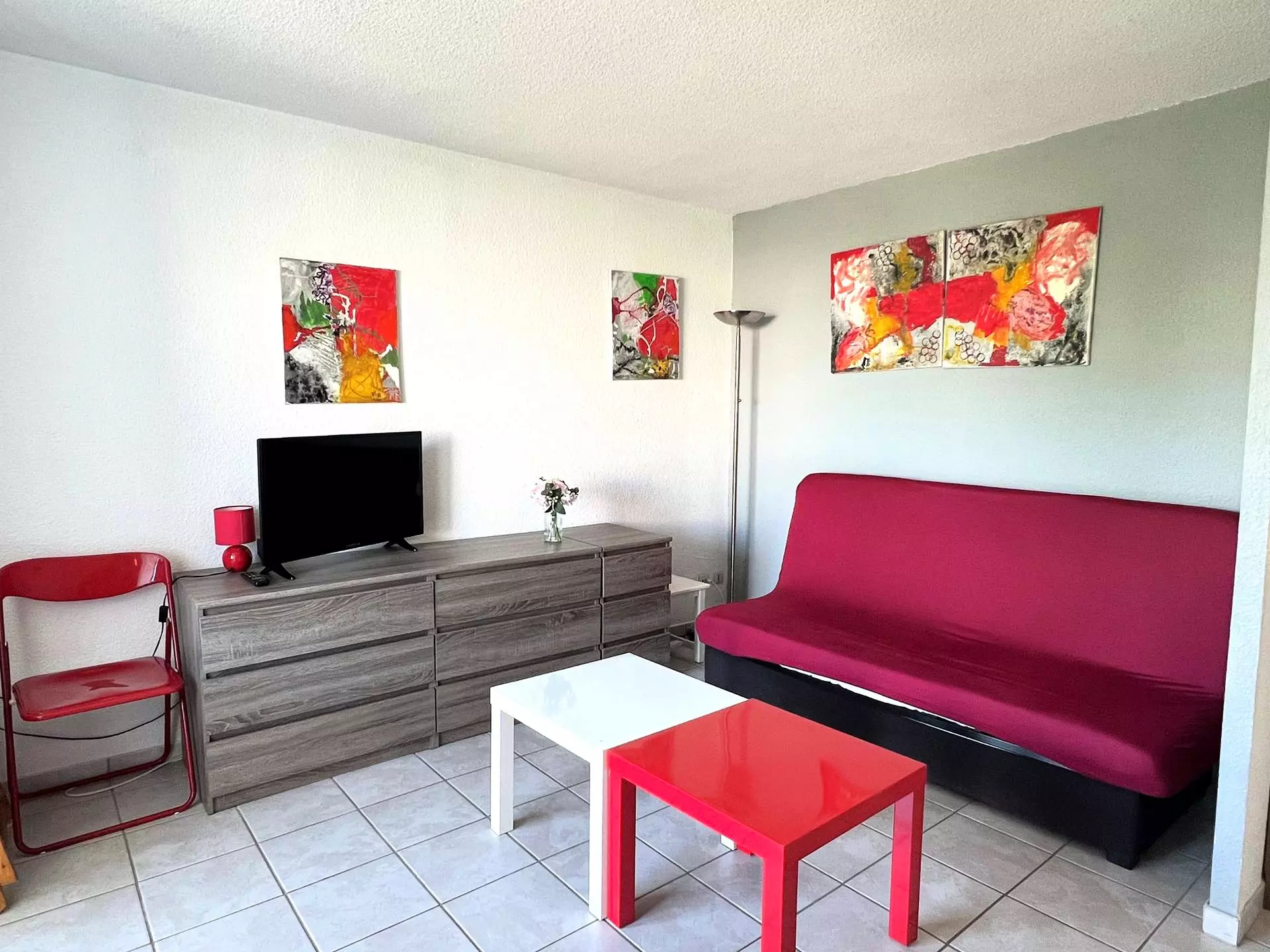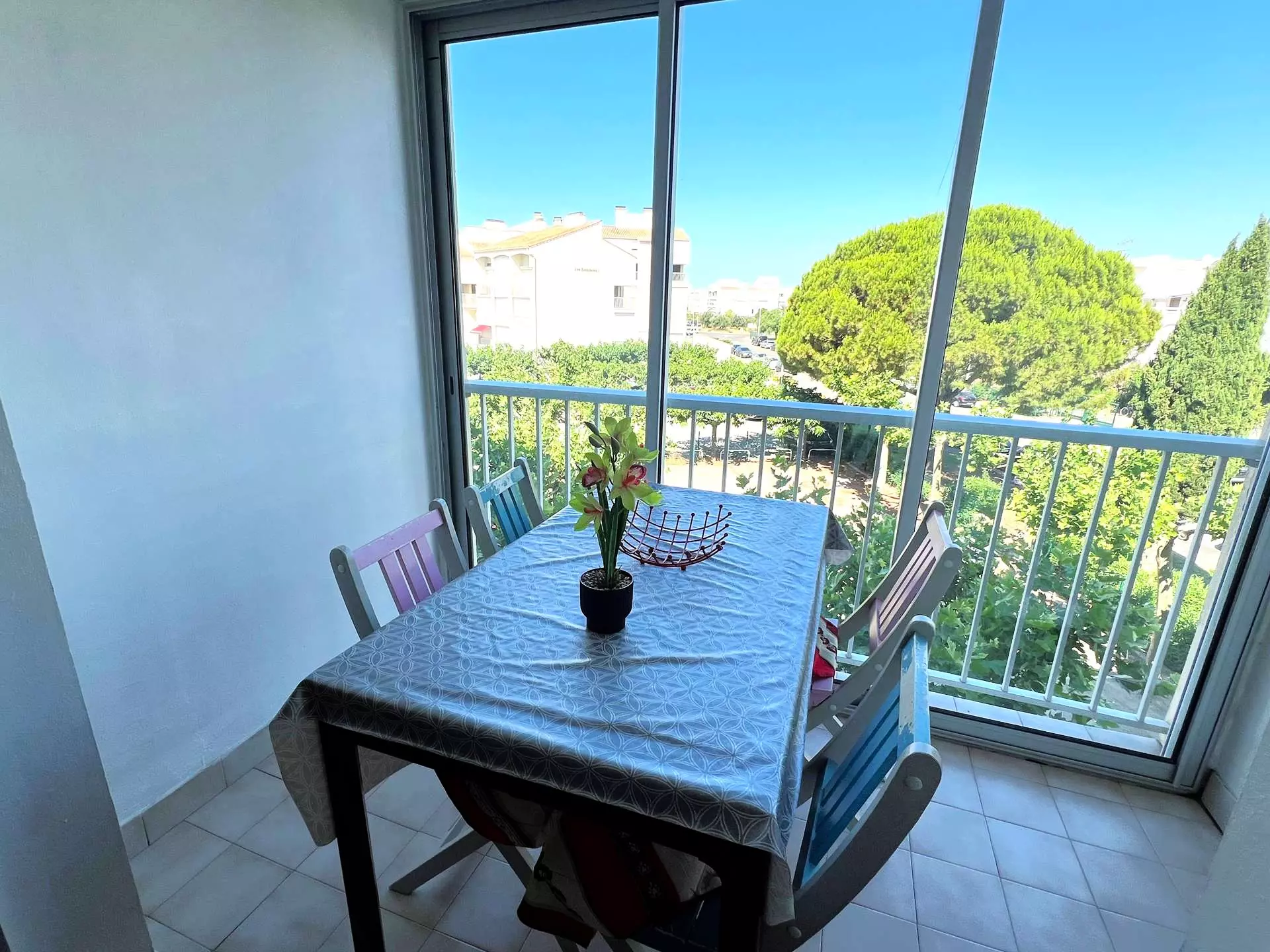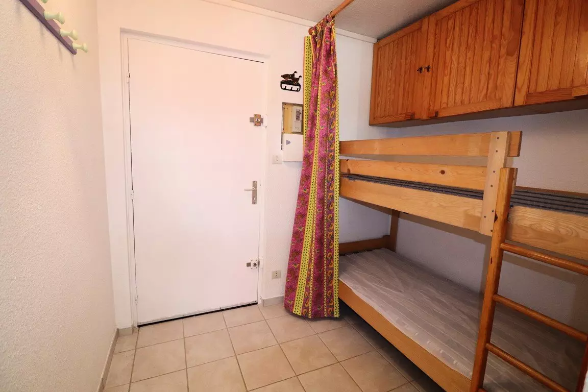 LES SABLES D'OR Residence – 2-room cabin apartment, very well-appointed, located on the 2nd floor with unobstructed views, close to the beach and shops, on the left bank of Grau-du-Roi. The apartment consists of an entrance hall, a cabin with 2 bunk beds, a bathroom with WC, and a bright kitchen area equipped with a washing machine, dishwasher, electric hob, oven, microwave and fridge-freezer. The living area, with a sofa bed for 2 people, opens onto a balcony with unobstructed views. The bedroom, also with a window, has a double bed and a storage wardrobe.