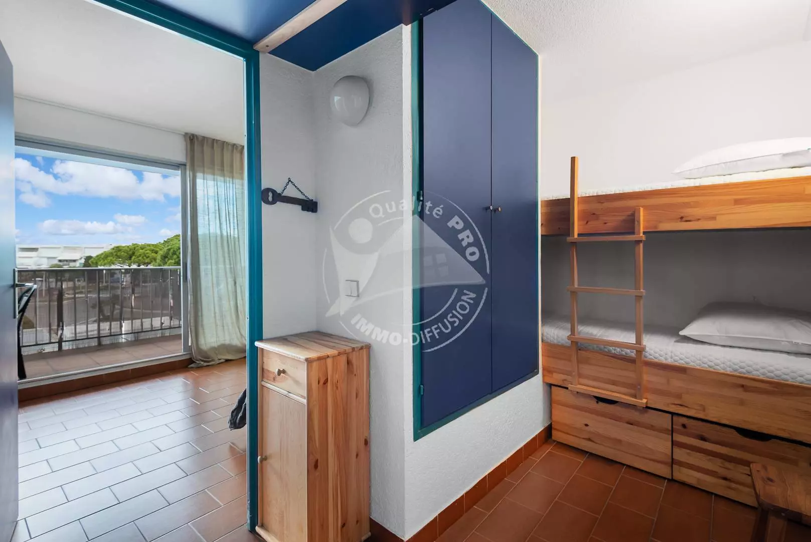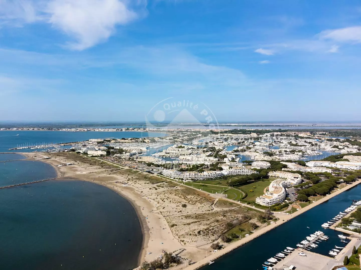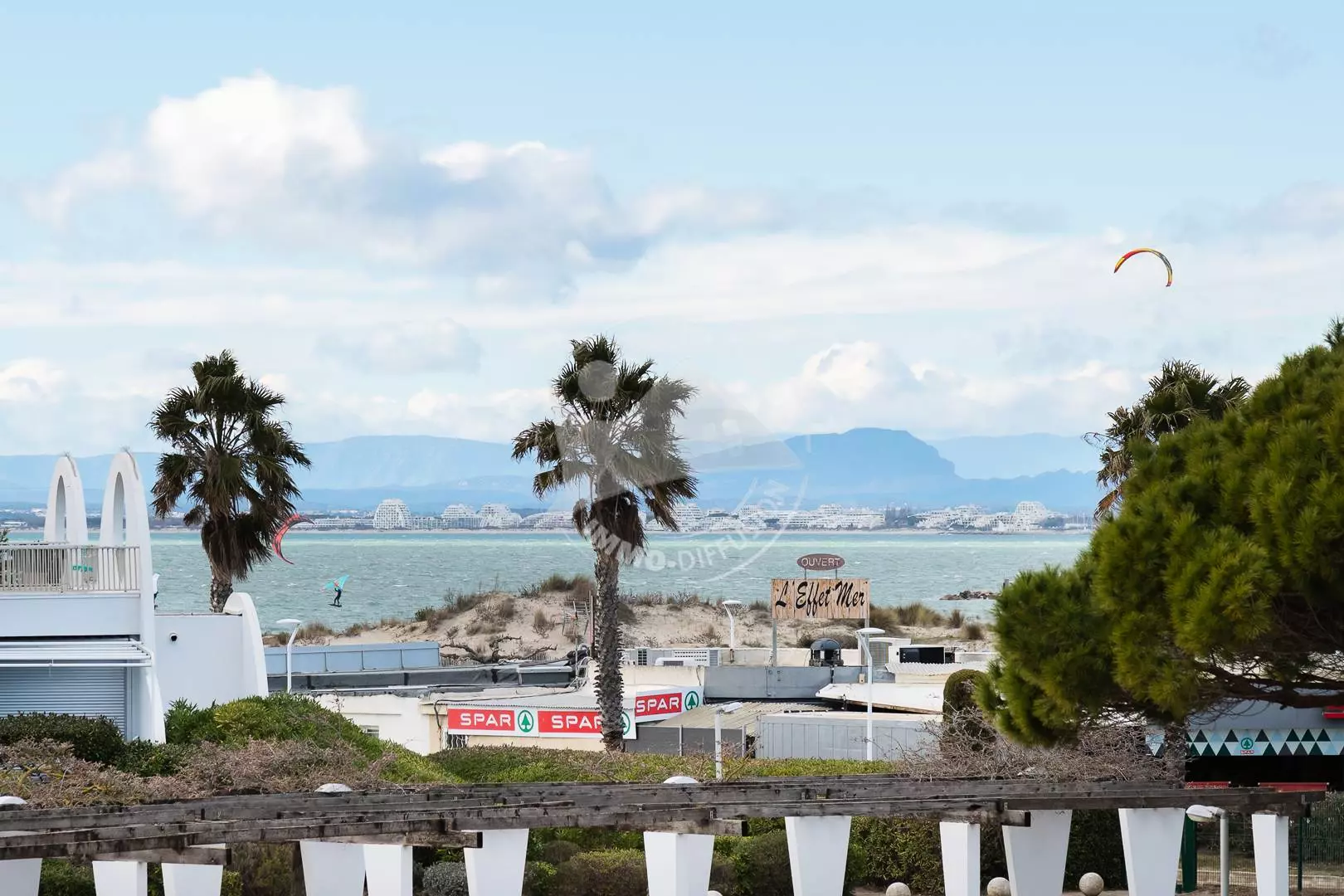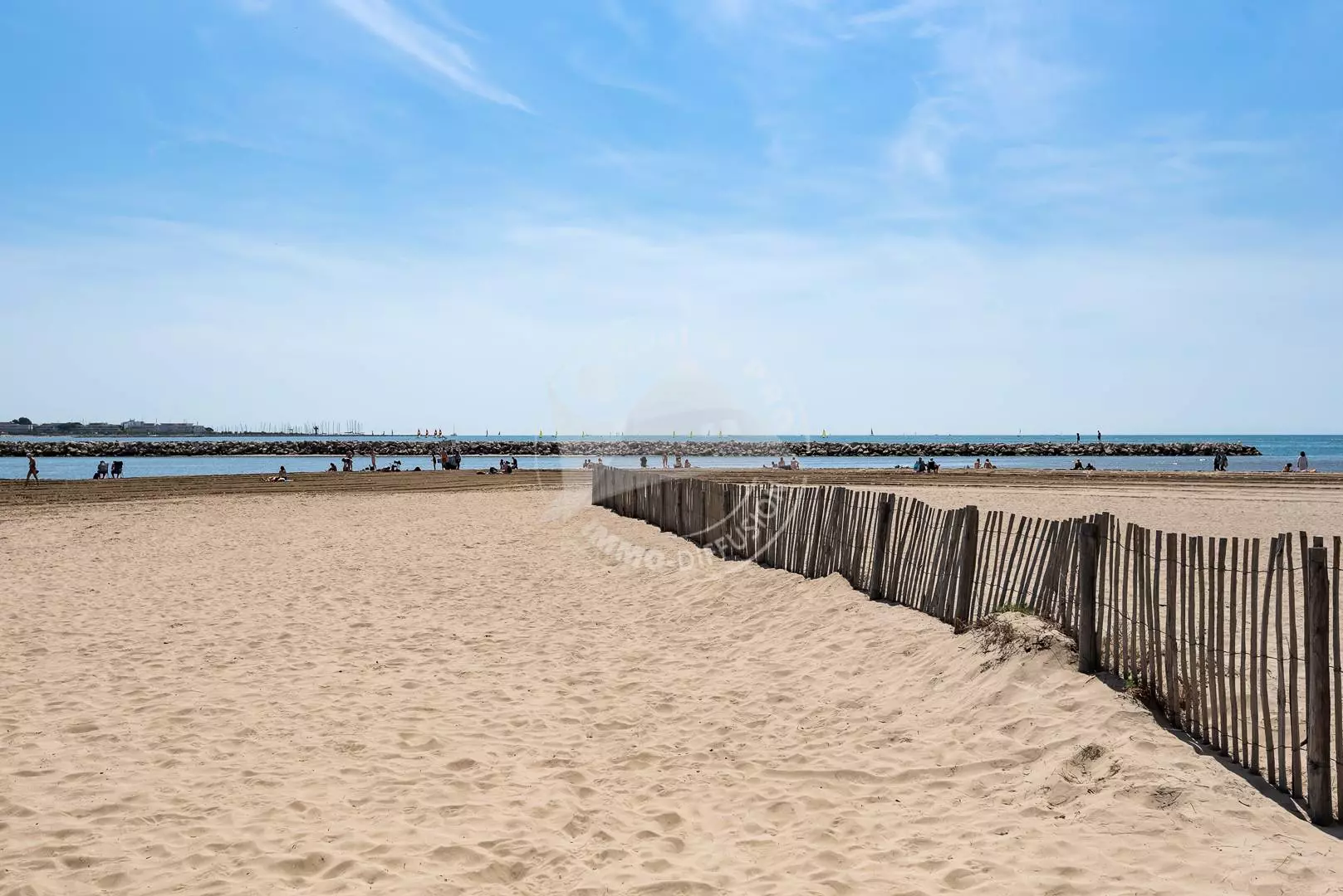 PORT CAMARGUE - SOUTH BEACH - Direct access to the beach. Luxury residence Studio Cabin of 23m² on the 1st floor. Composed of a bright living room with a built-in bed in 140 cm and a TV, a fully equipped kitchen, (oven, fridge/freezer, hob, dishwasher), a cabin with bunk bed for 2 people in 90 cm, a bathroom with washing machine and a separate toilet. Beautiful loggia of 11m² with a view of the sea. Secure shared parking. No road to cross to get to the beach. Close to shopping center, restaurants, nautical activities and public transport. Furnished and equipped for 4 people.
