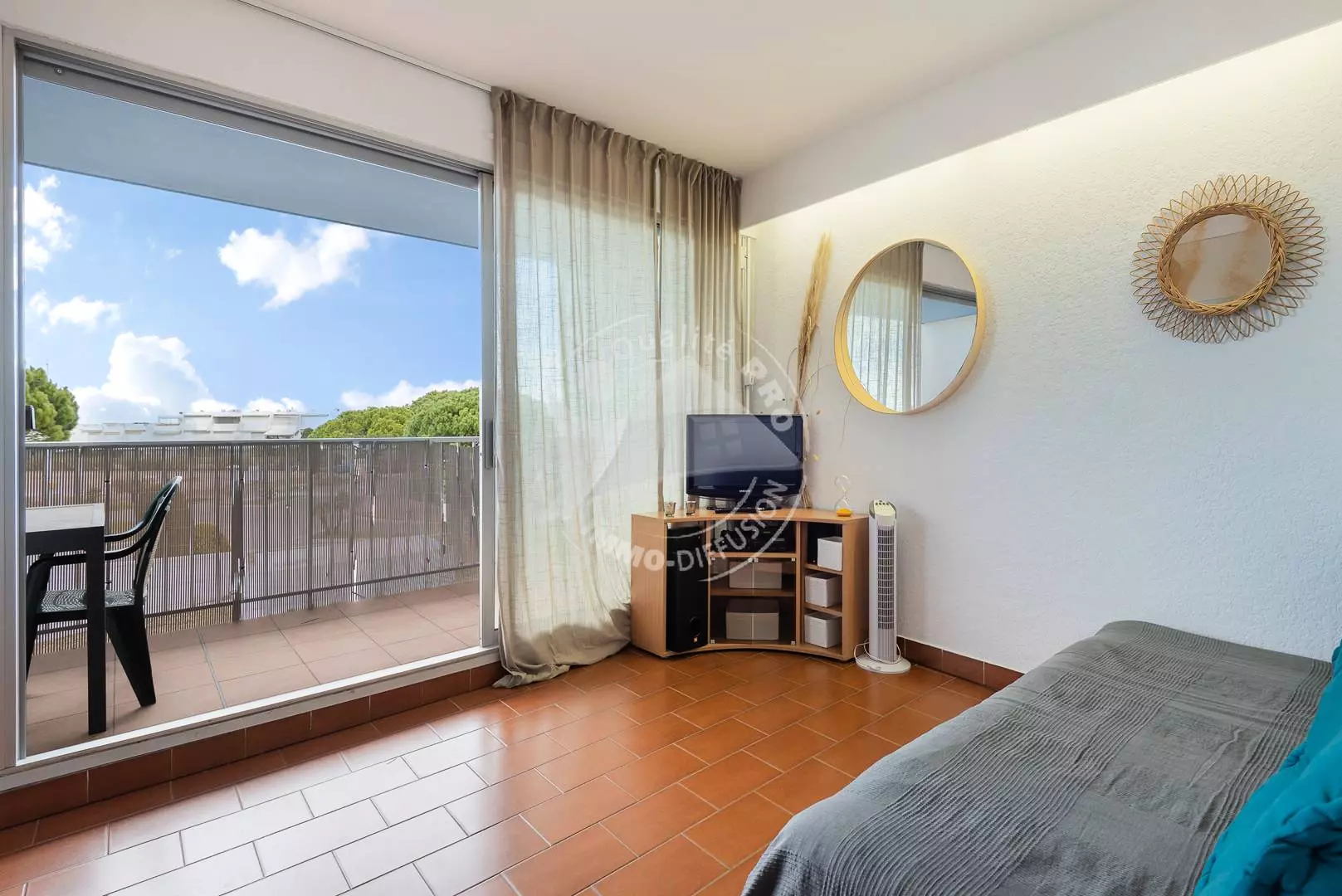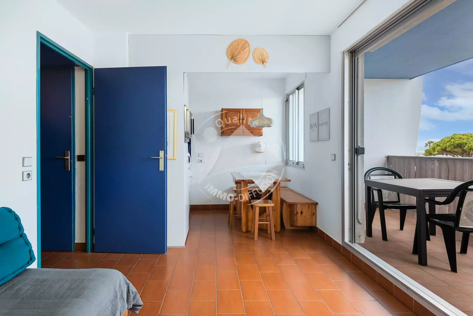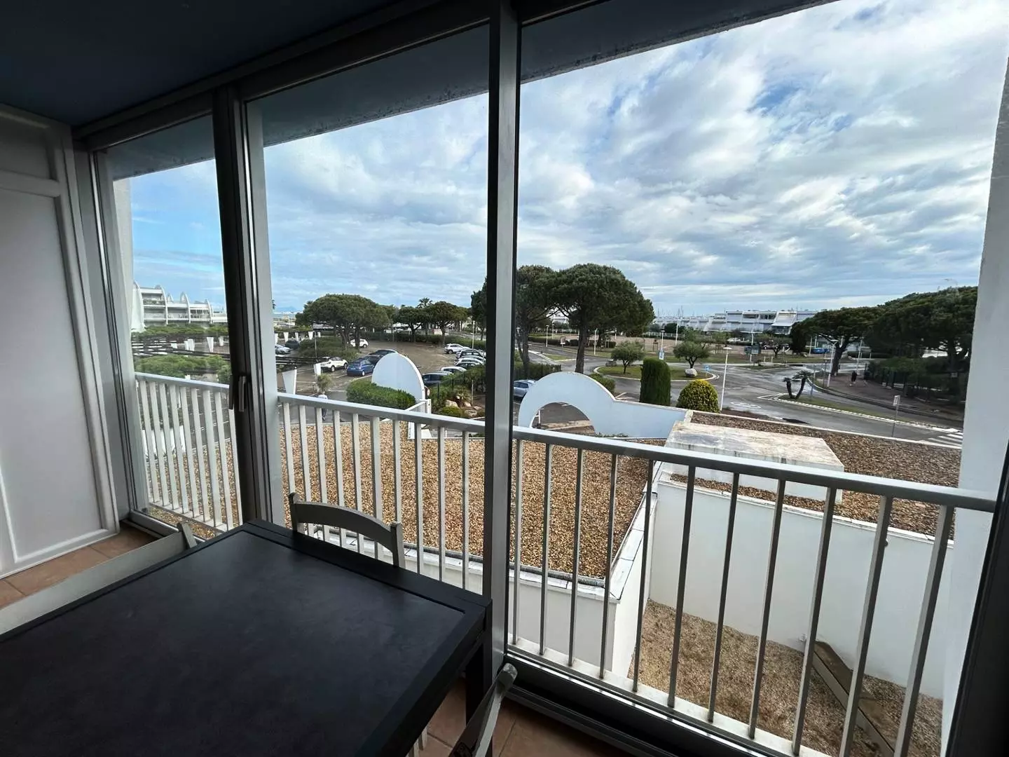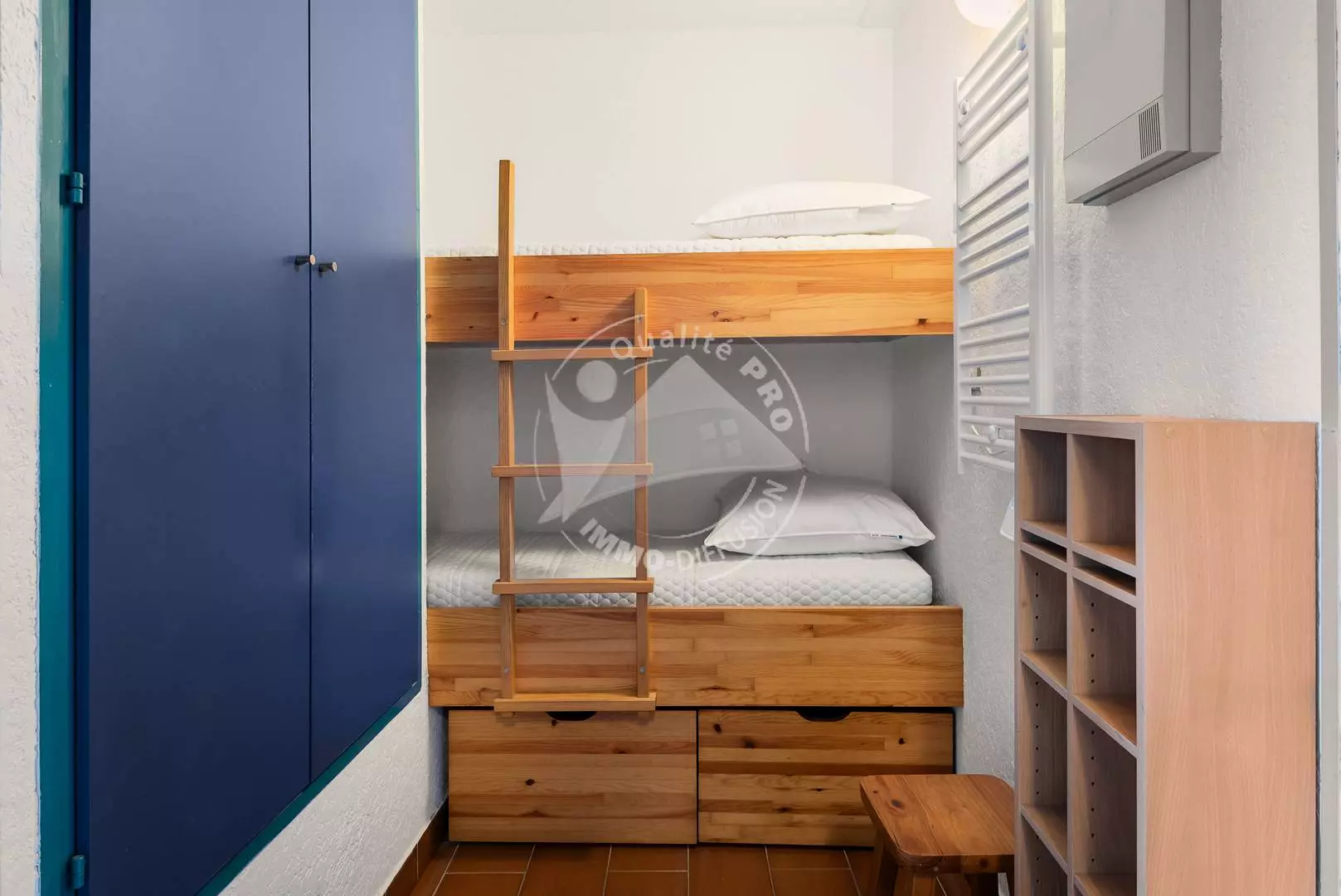 PORT CAMARGUE - SOUTH BEACH - Direct access to the beach. Luxury residence Studio Cabin of 23m² on the 1st floor. Composed of a bright living room with a built-in bed in 140 cm and a TV, a fully equipped kitchen, (oven, fridge/freezer, hob, dishwasher), a cabin with bunk bed for 2 people in 90 cm, a bathroom with washing machine and a separate toilet. Beautiful loggia of 11m² with a view of the sea. Secure shared parking. No road to cross to get to the beach. Close to shopping center, restaurants, nautical activities and public transport. Furnished and equipped for 4 people.