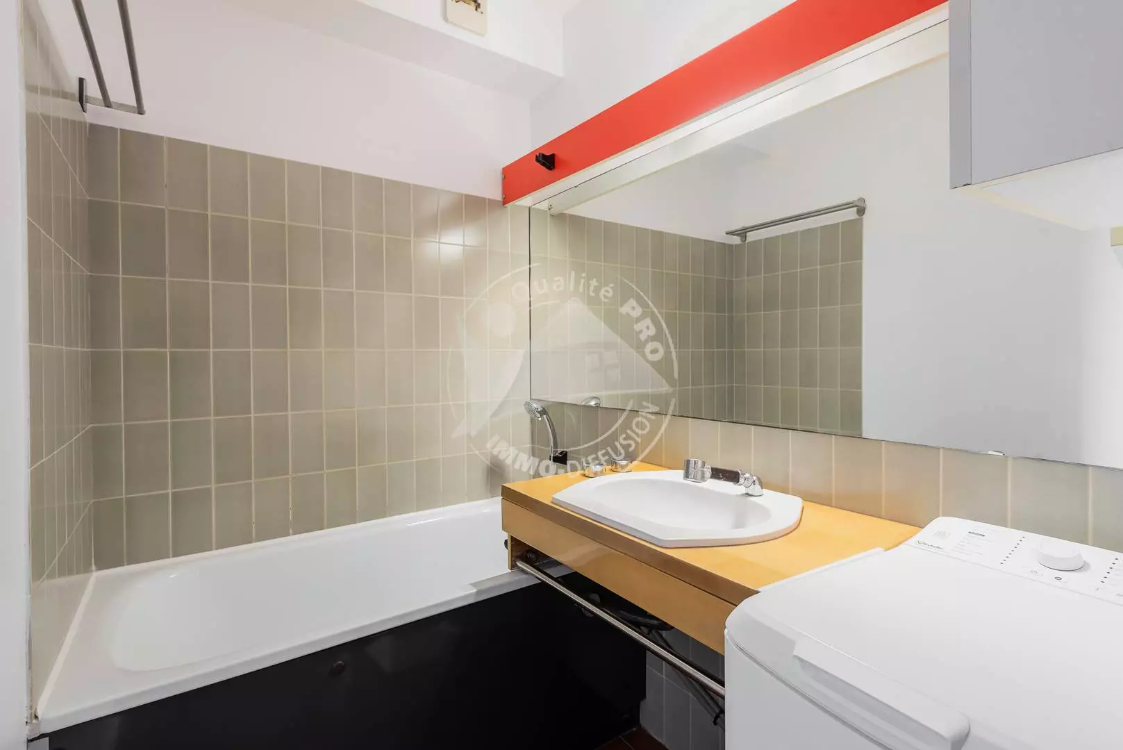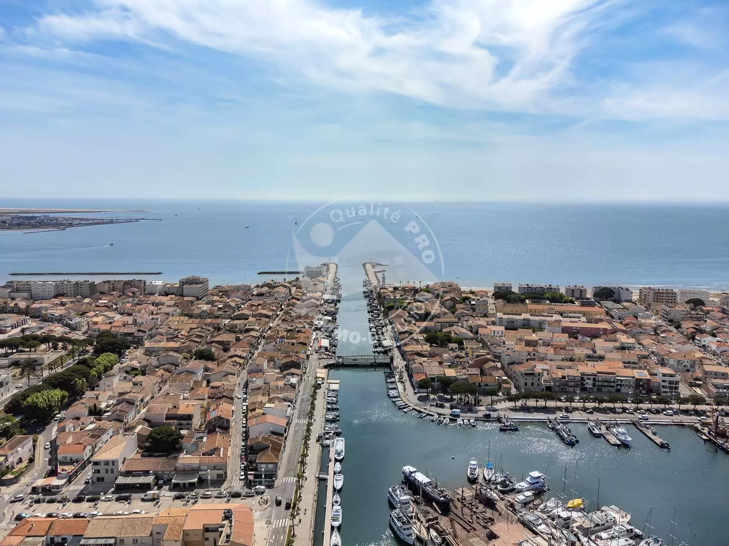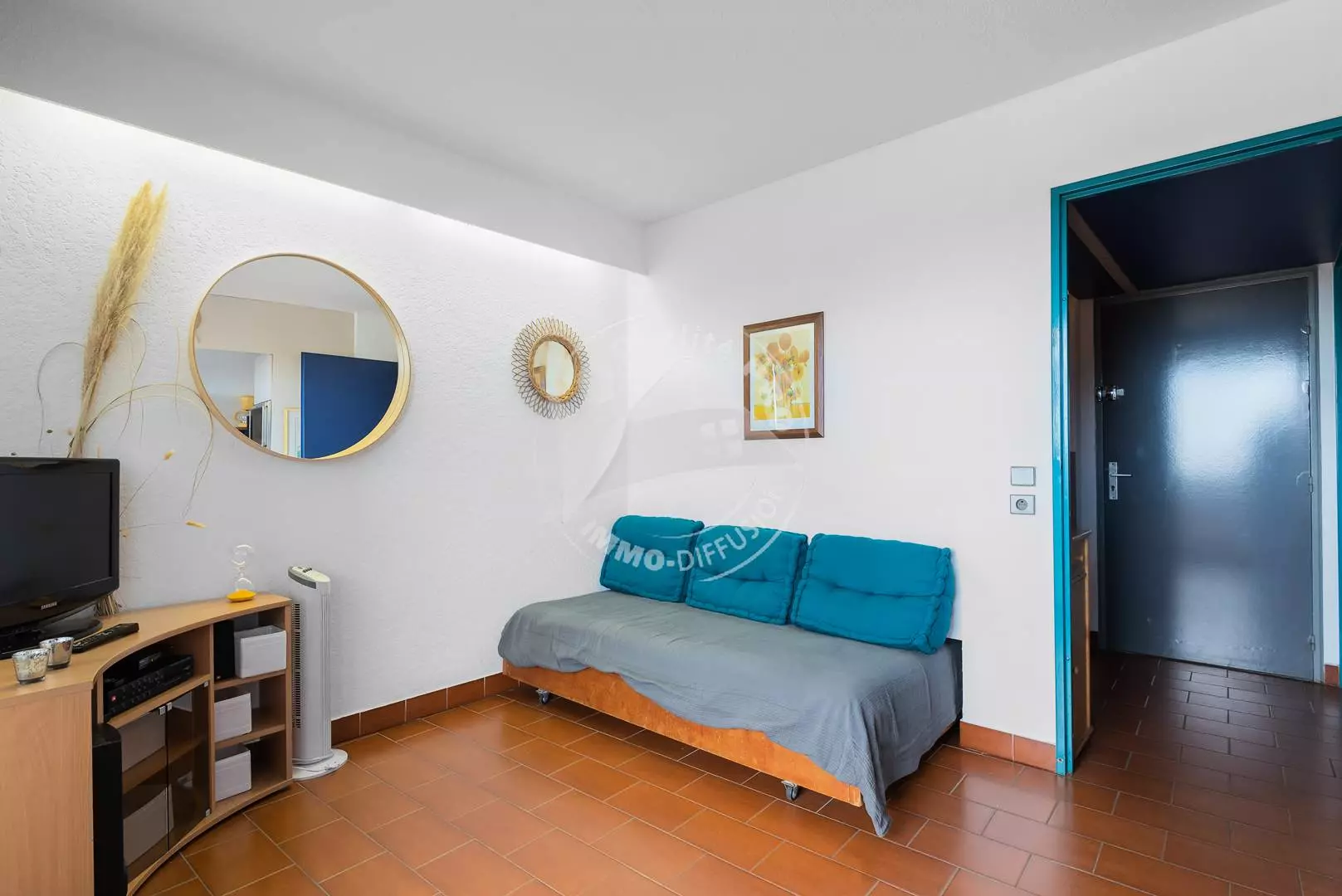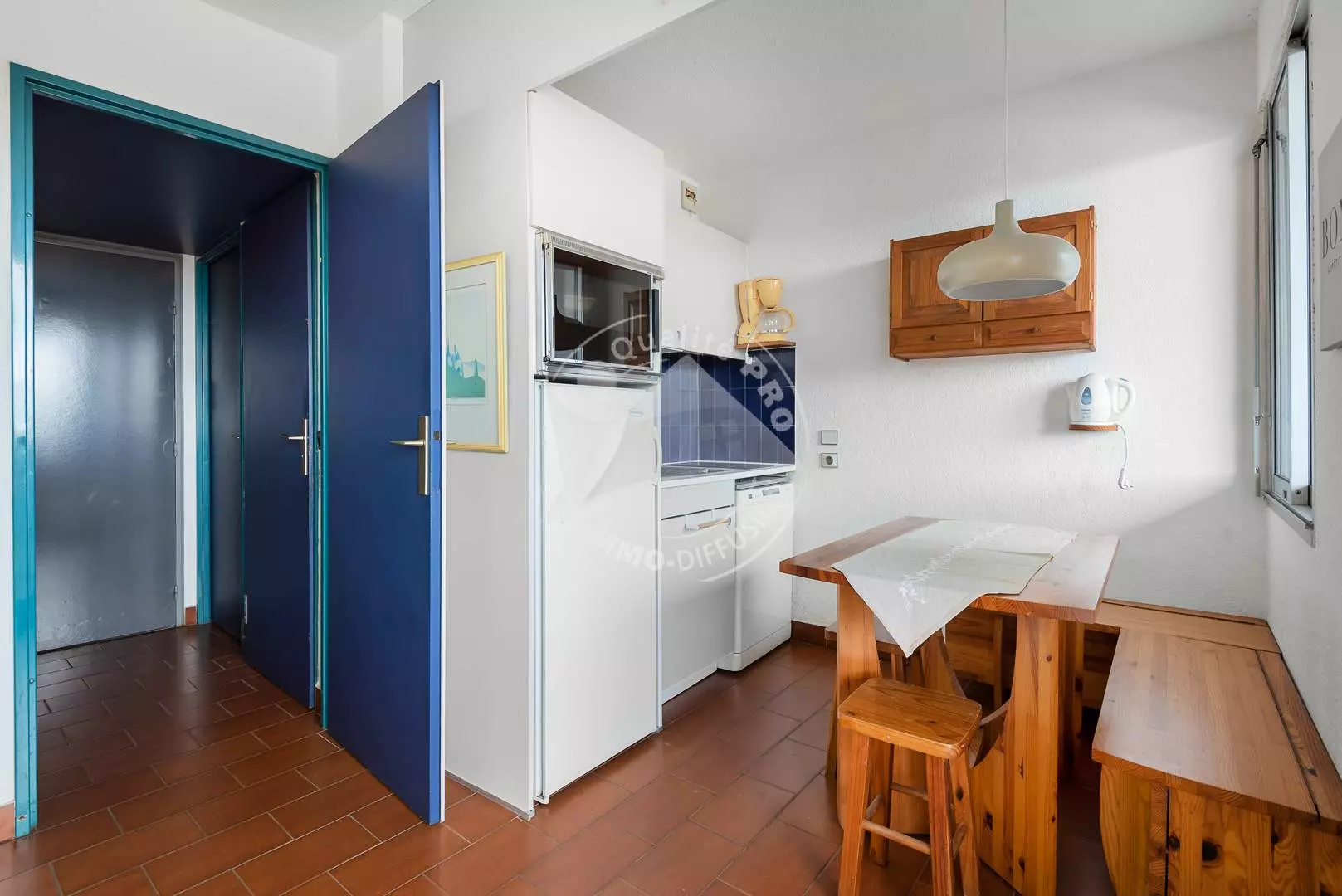 PORT CAMARGUE - SOUTH BEACH - Direct access to the beach. Luxury residence Studio Cabin of 23m² on the 1st floor. Composed of a bright living room with a built-in bed in 140 cm and a TV, a fully equipped kitchen, (oven, fridge/freezer, hob, dishwasher), a cabin with bunk bed for 2 people in 90 cm, a bathroom with washing machine and a separate toilet. Beautiful loggia of 11m² with a view of the sea. Secure shared parking. No road to cross to get to the beach. Close to shopping center, restaurants, nautical activities and public transport. Furnished and equipped for 4 people.
