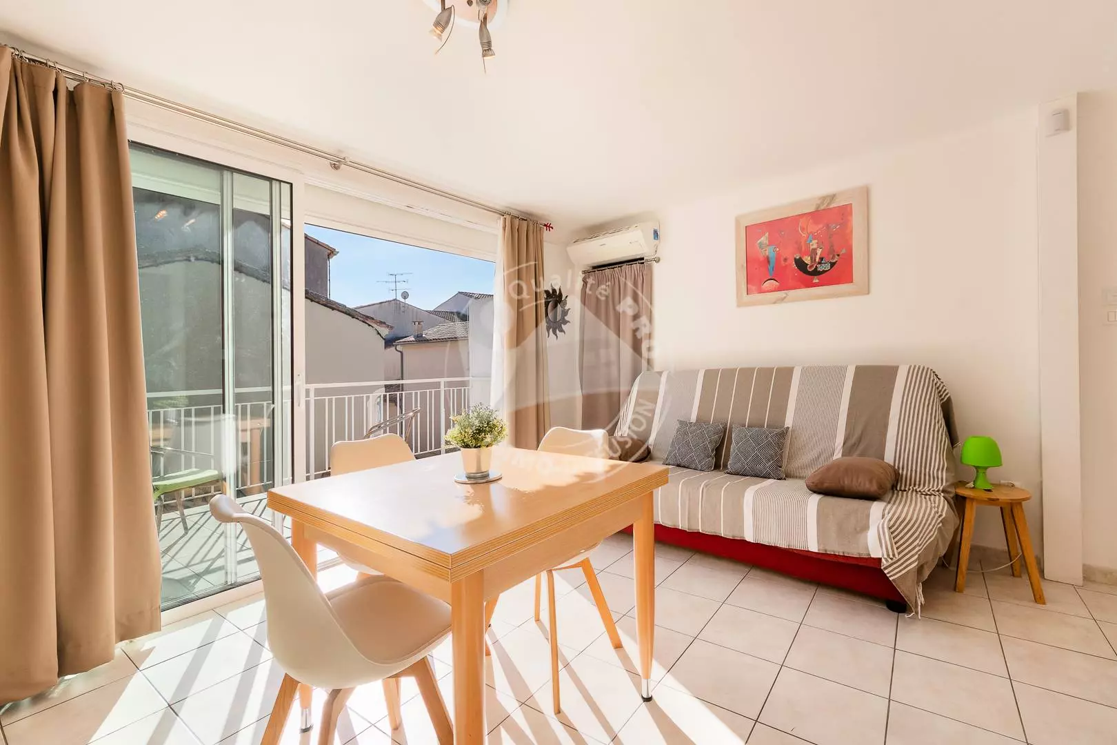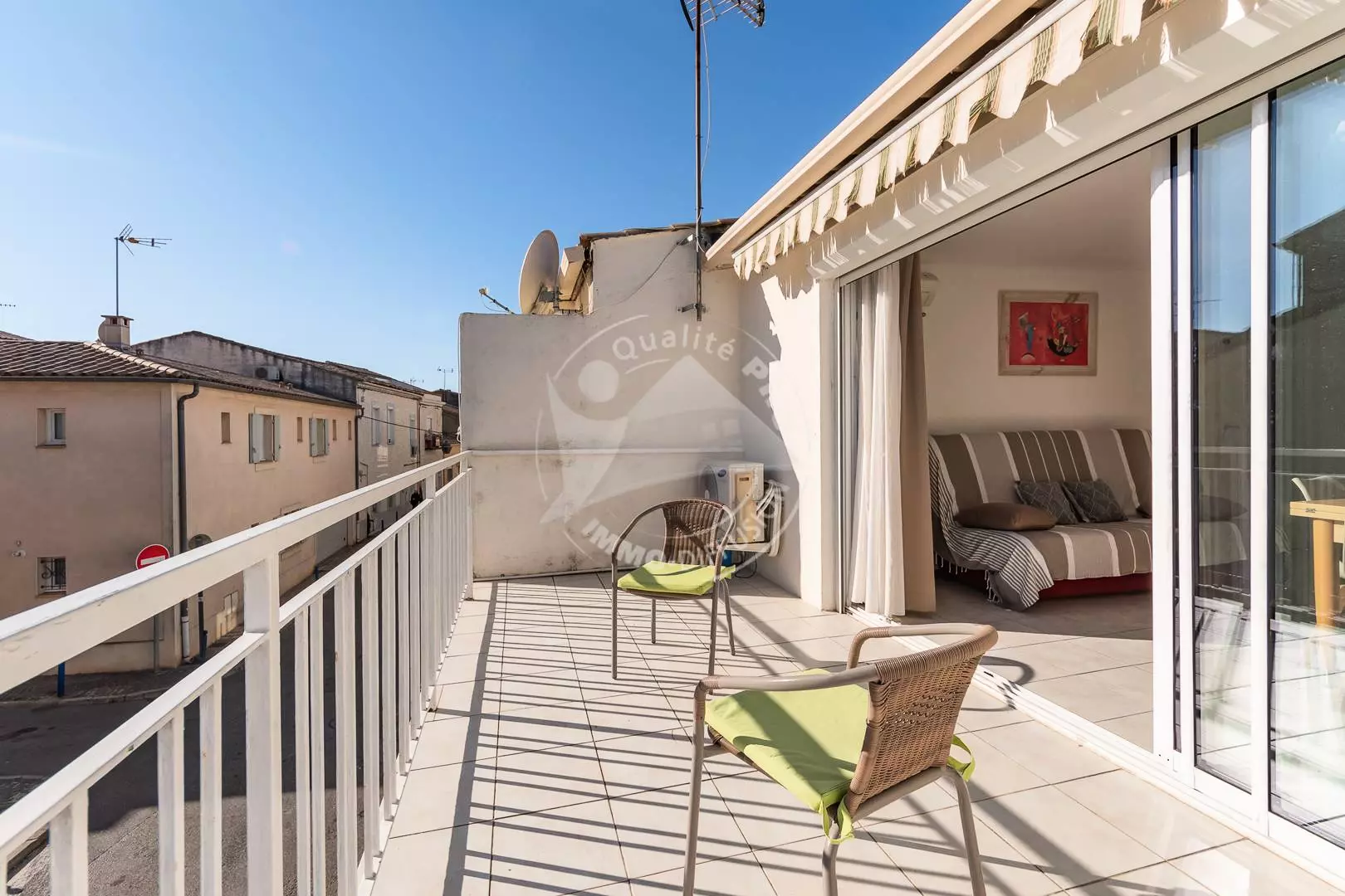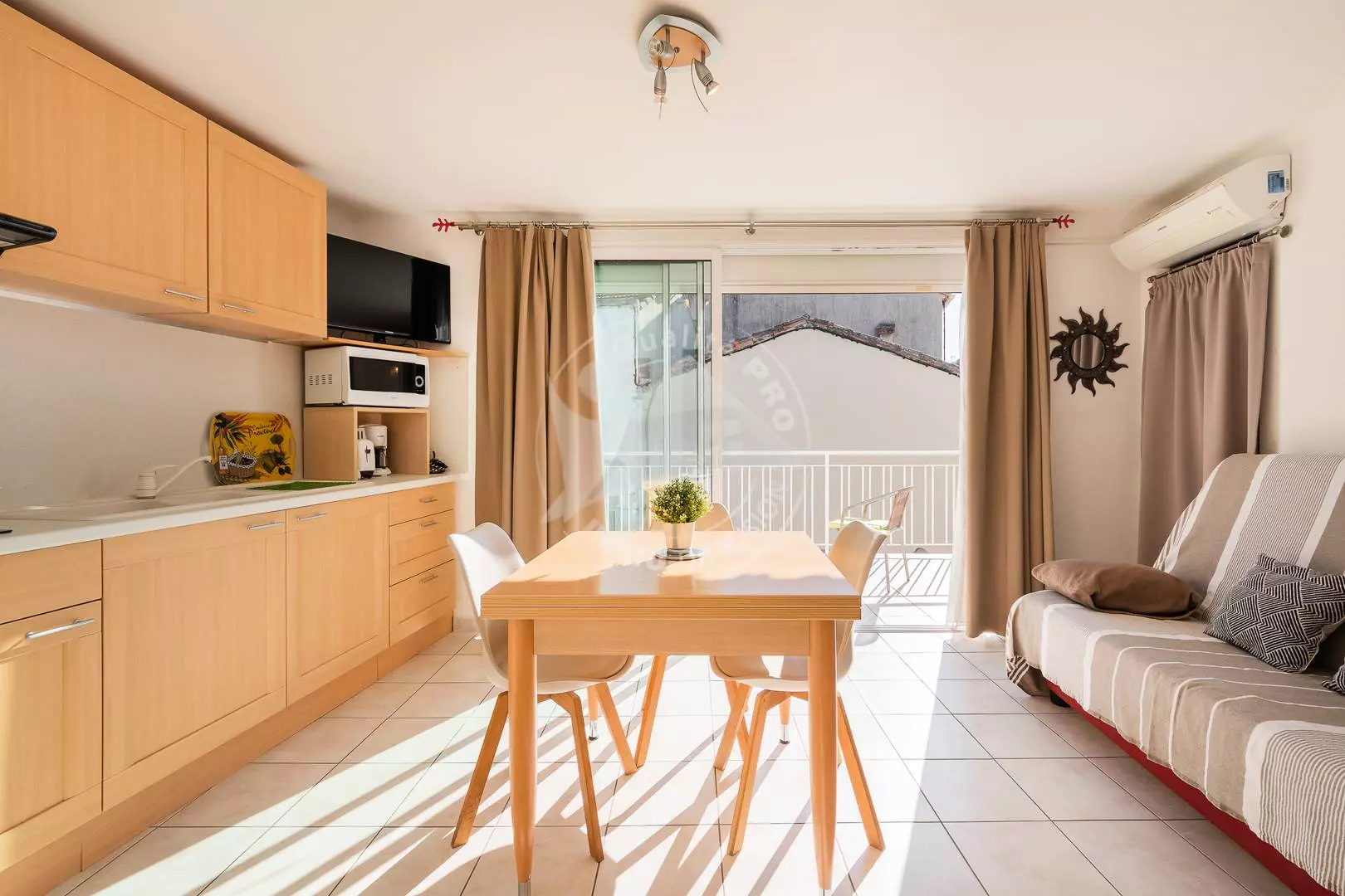 CITY CENTER - Left Bank - Beautiful studio in the heart of the city center for 2 people, with a 140 cm sofa bed, a television and air conditioning in the living room, a fully equipped kitchen (ceramic hob, refrigerator/freezer, microwave) A bathroom with toilet and a beautiful 12 m² terrace facing South-East. Near the Swing Bridge near the beach, the bus station and all amenities. 200m from the municipal parking lot of the arenas free all year round. Furnished and equipped for 2 people.