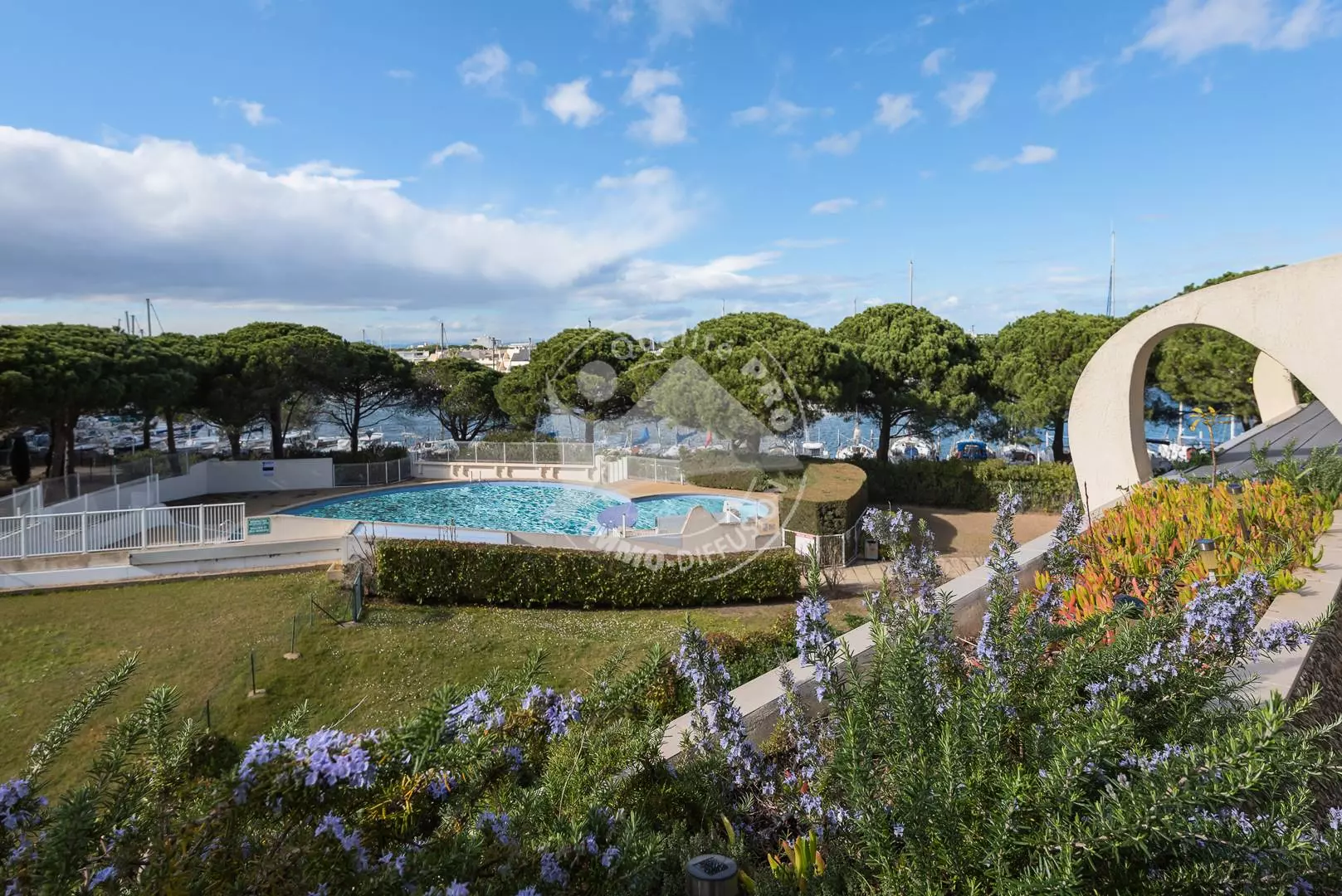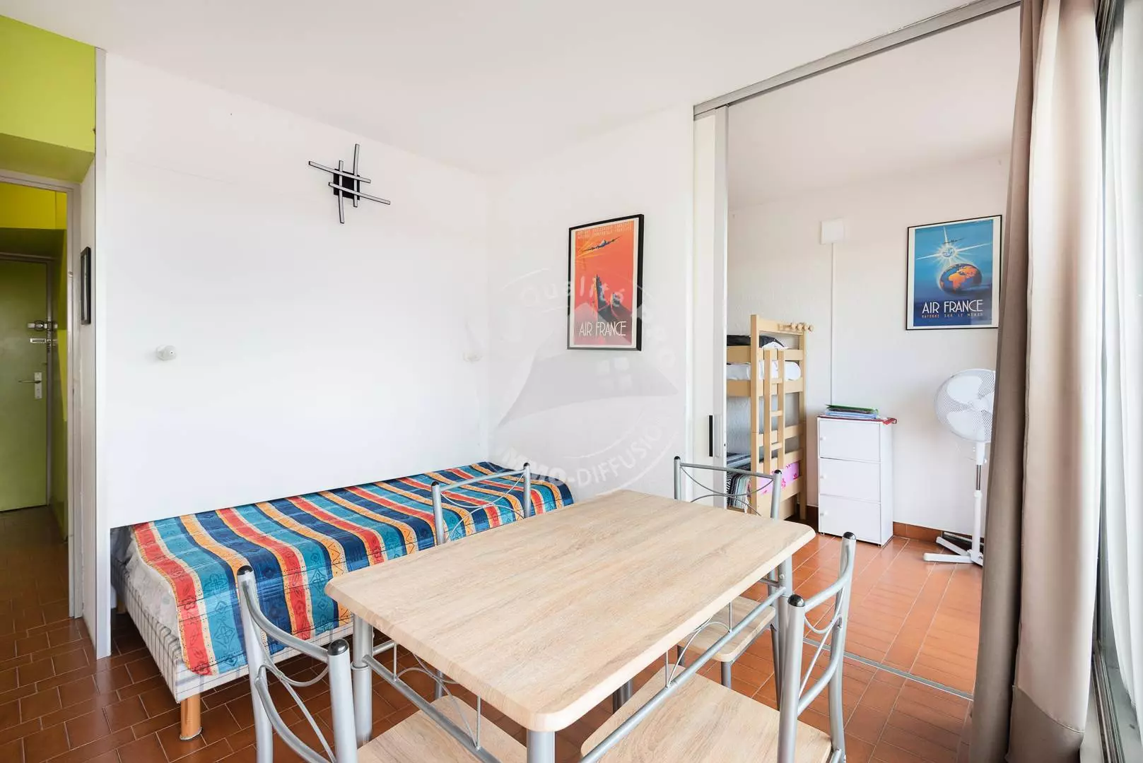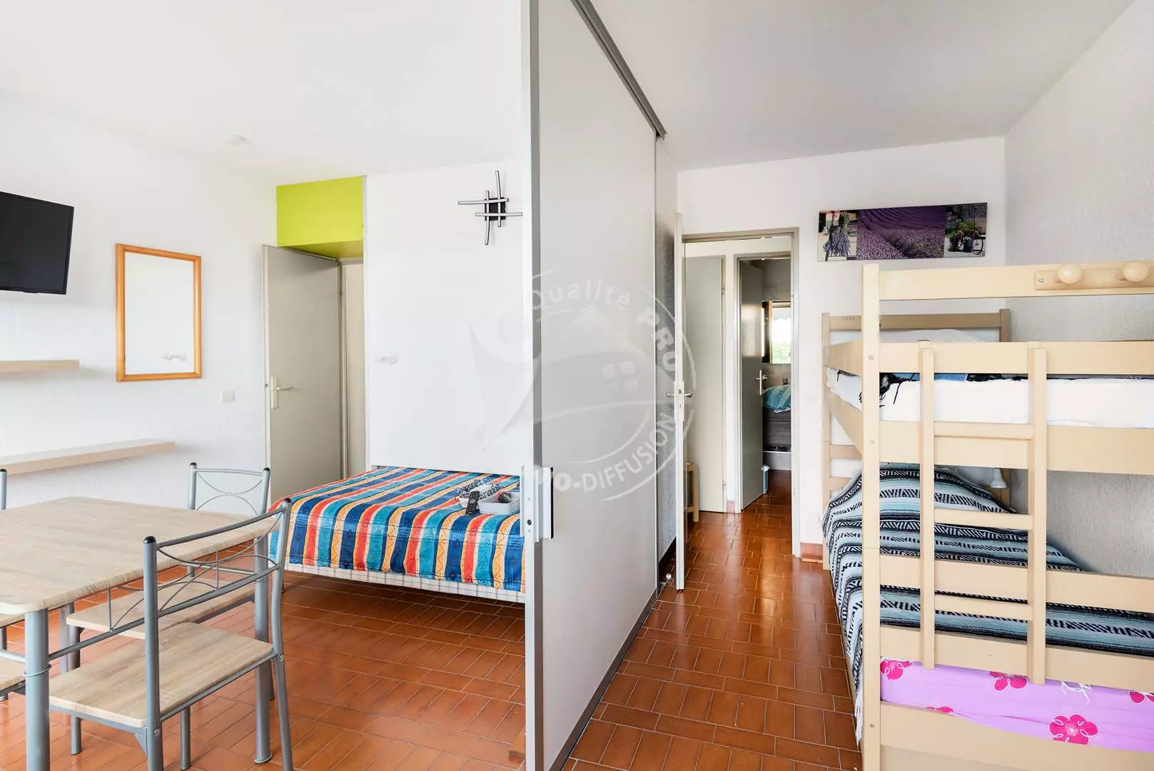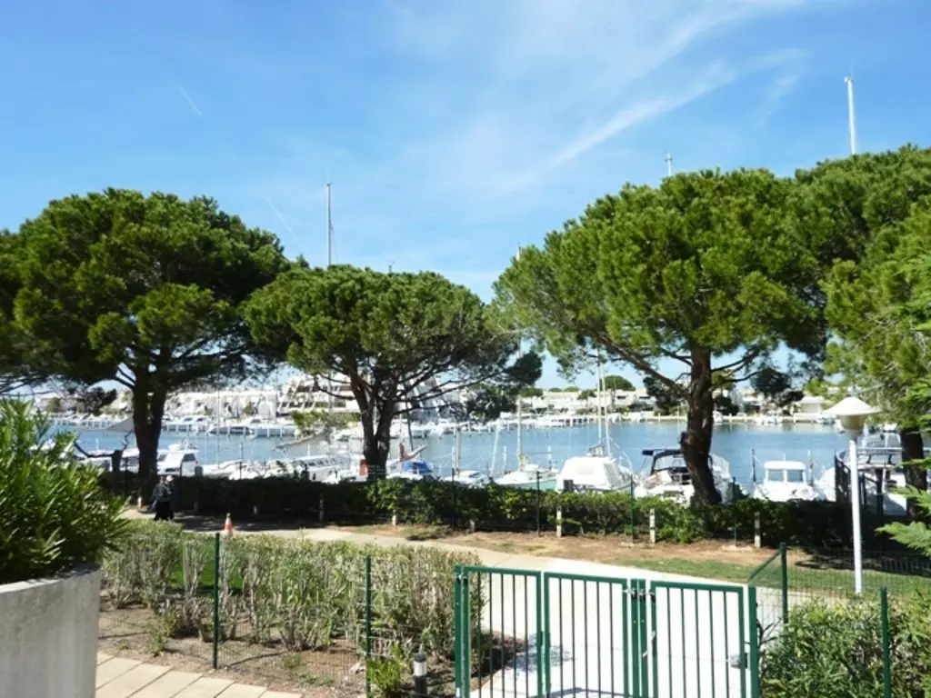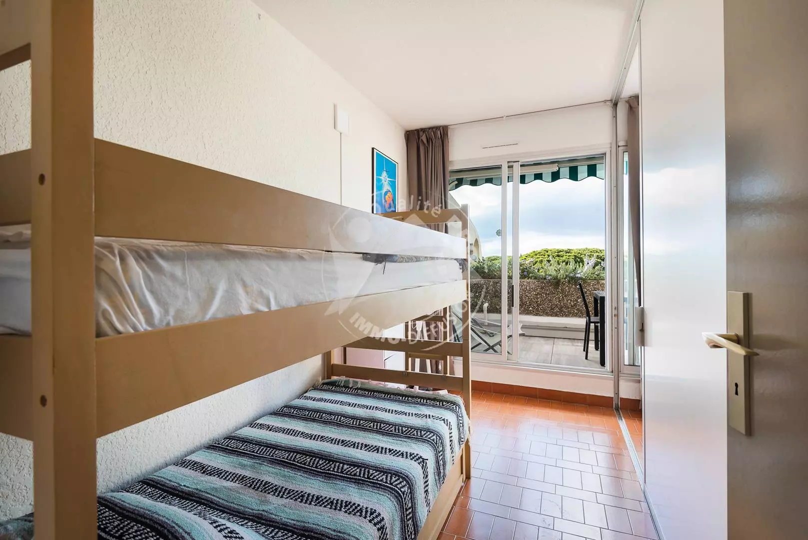 PORT CAMARGUE - South Beach - In a secure residence on the marina with parking, beautiful green spaces, and a swimming pool with a paddling pool (pool open from mid-June to mid-September approximately). 30m² one-bedroom apartment with a large 12m² terrace, offering a lovely unobstructed view of the port and the pool. Bright living room opening onto the terrace with a built-in 80cm double bed, air conditioning, and a TV. A fully equipped kitchen (dishwasher, fridge/freezer, oven, microwave), a bedroom with a bunk bed and a pull-out bed (sleeps 3). Shower room with washing machine and separate WC. Furnished and equipped for 4/5 people. 400m from the beach, shops, and water sports.