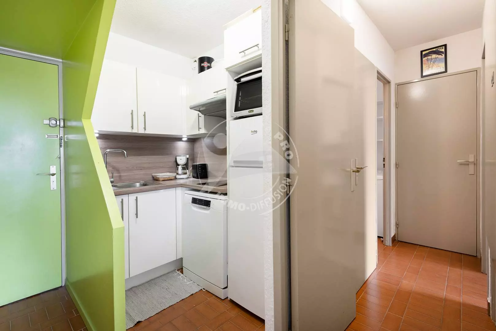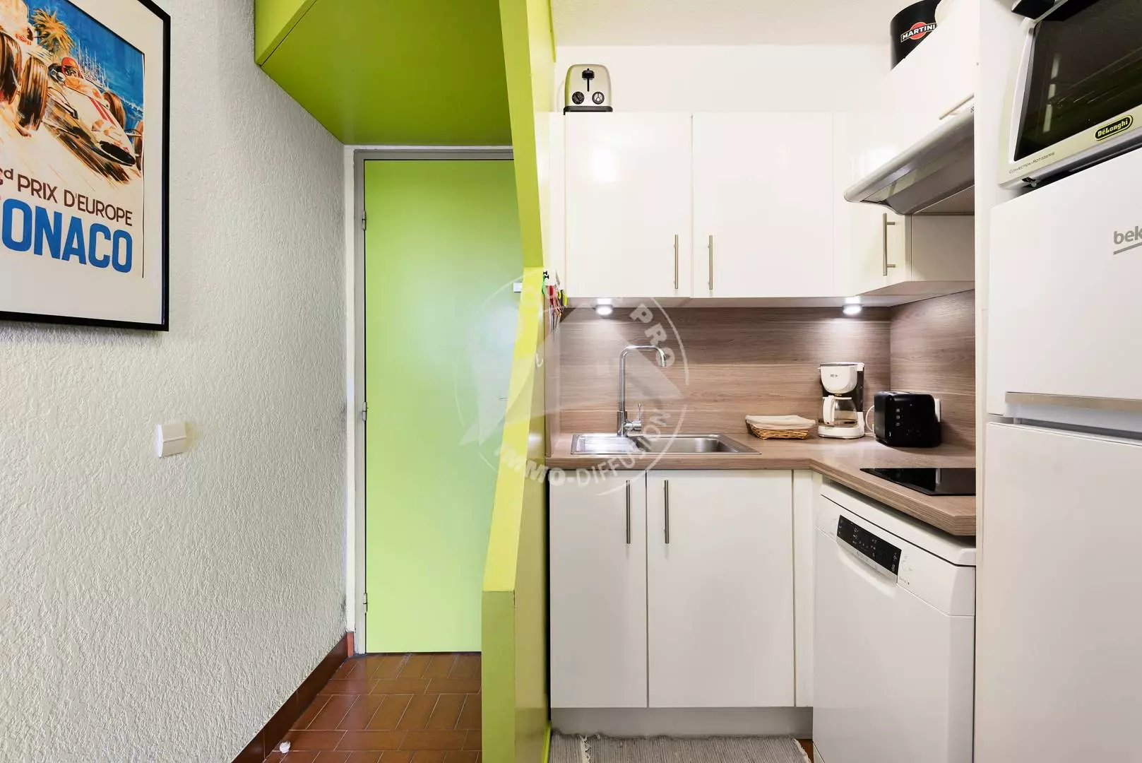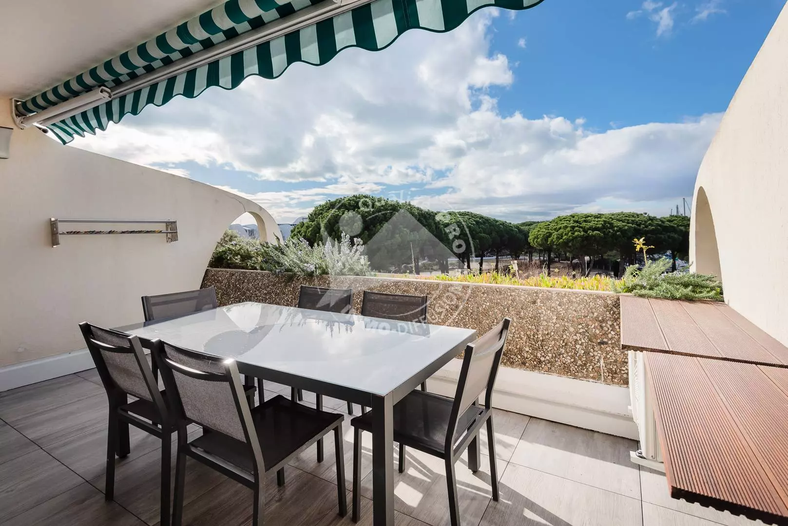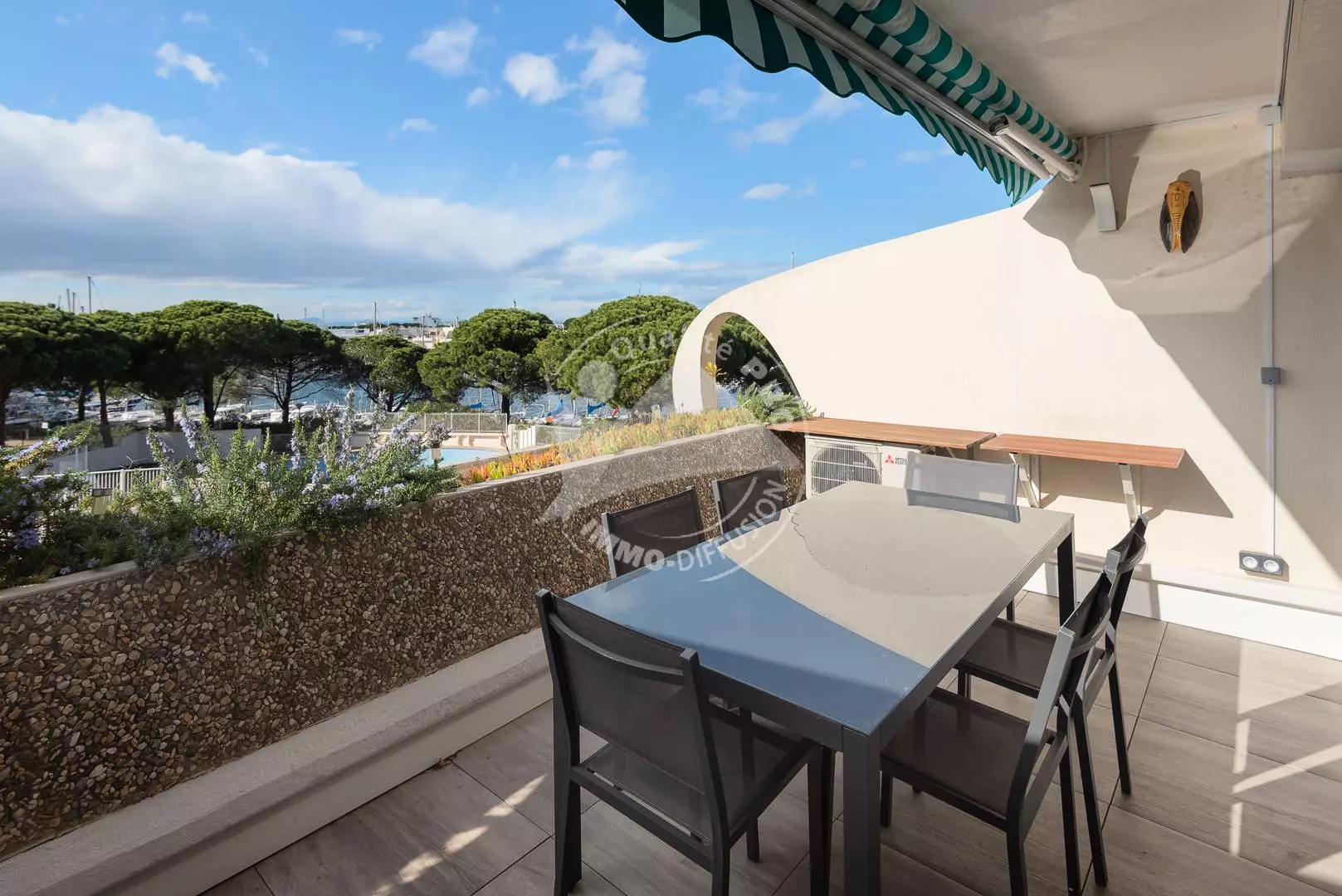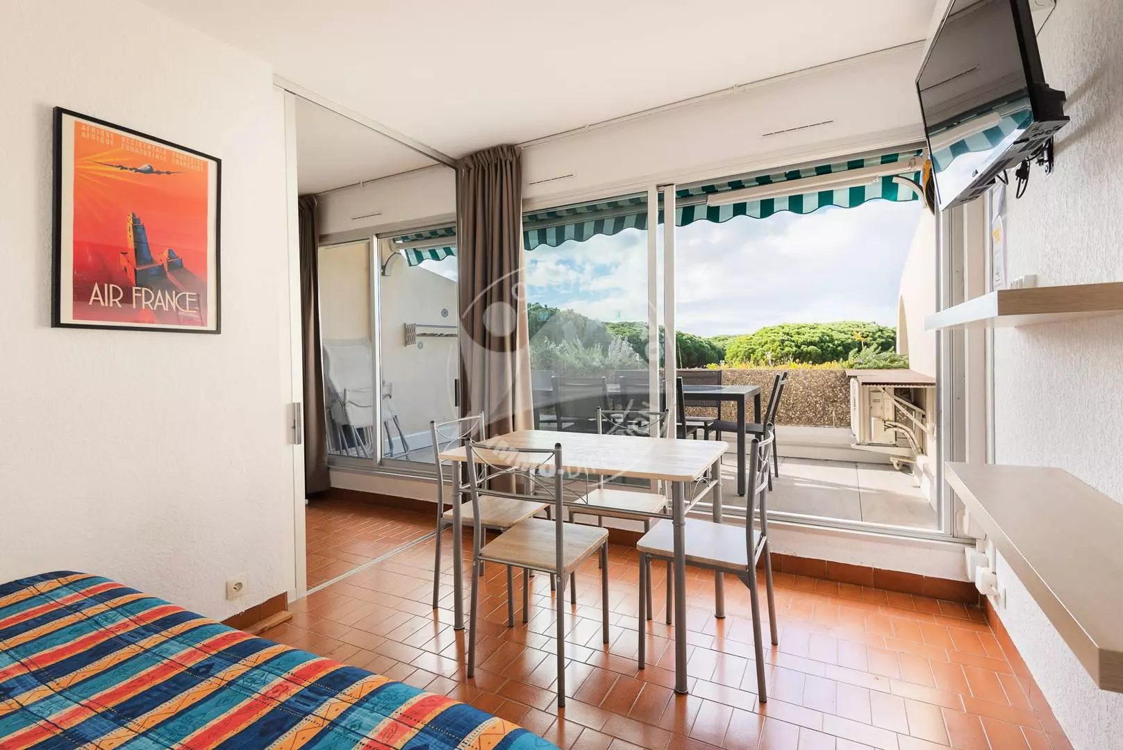 PORT CAMARGUE - South Beach - In a secure residence on the marina with parking, beautiful green spaces, and a swimming pool with a paddling pool (pool open from mid-June to mid-September approximately). 30m² one-bedroom apartment with a large 12m² terrace, offering a lovely unobstructed view of the port and the pool. Bright living room opening onto the terrace with a built-in 80cm double bed, air conditioning, and a TV. A fully equipped kitchen (dishwasher, fridge/freezer, oven, microwave), a bedroom with a bunk bed and a pull-out bed (sleeps 3). Shower room with washing machine and separate WC. Furnished and equipped for 4/5 people. 400m from the beach, shops, and water sports.