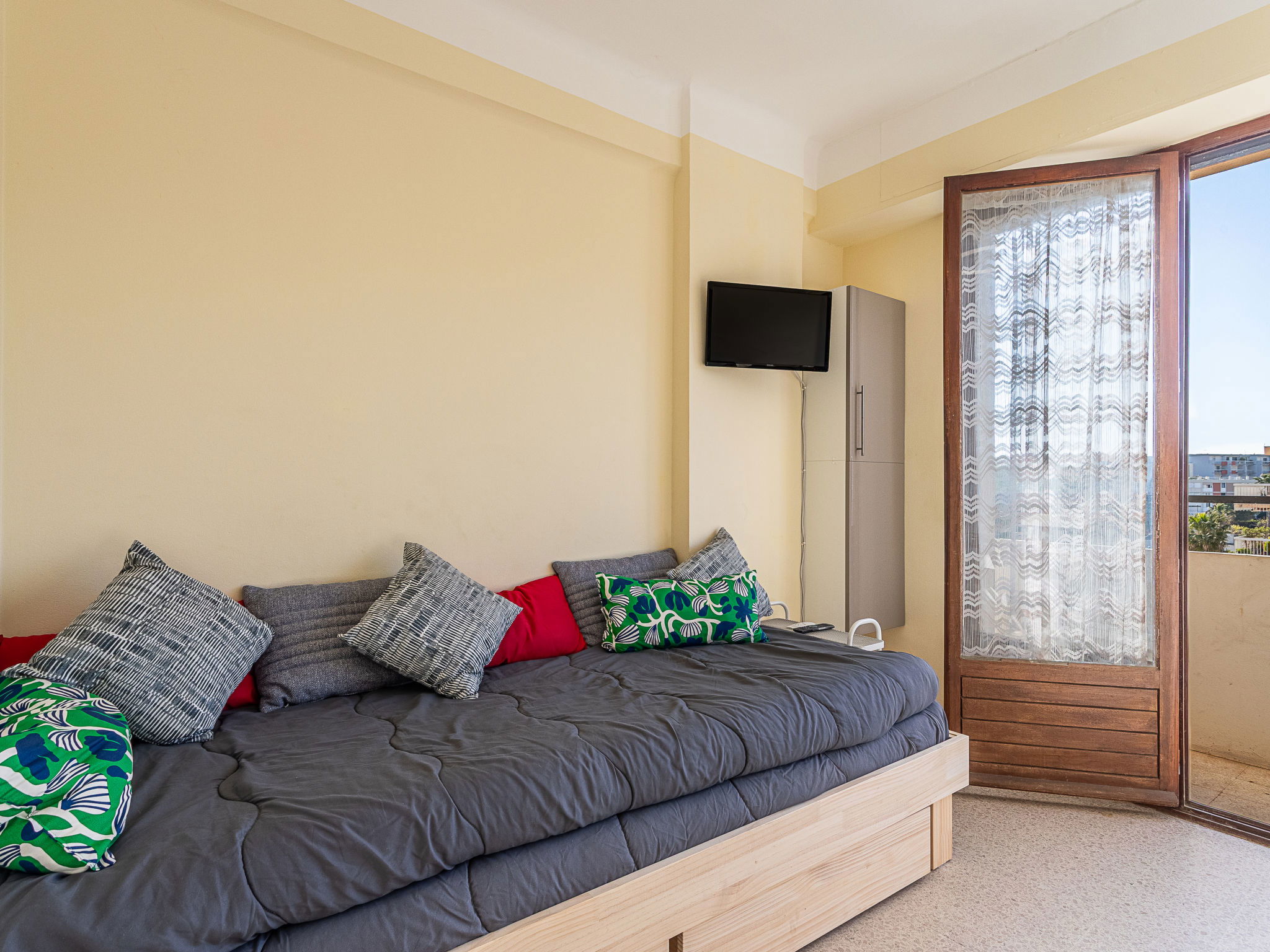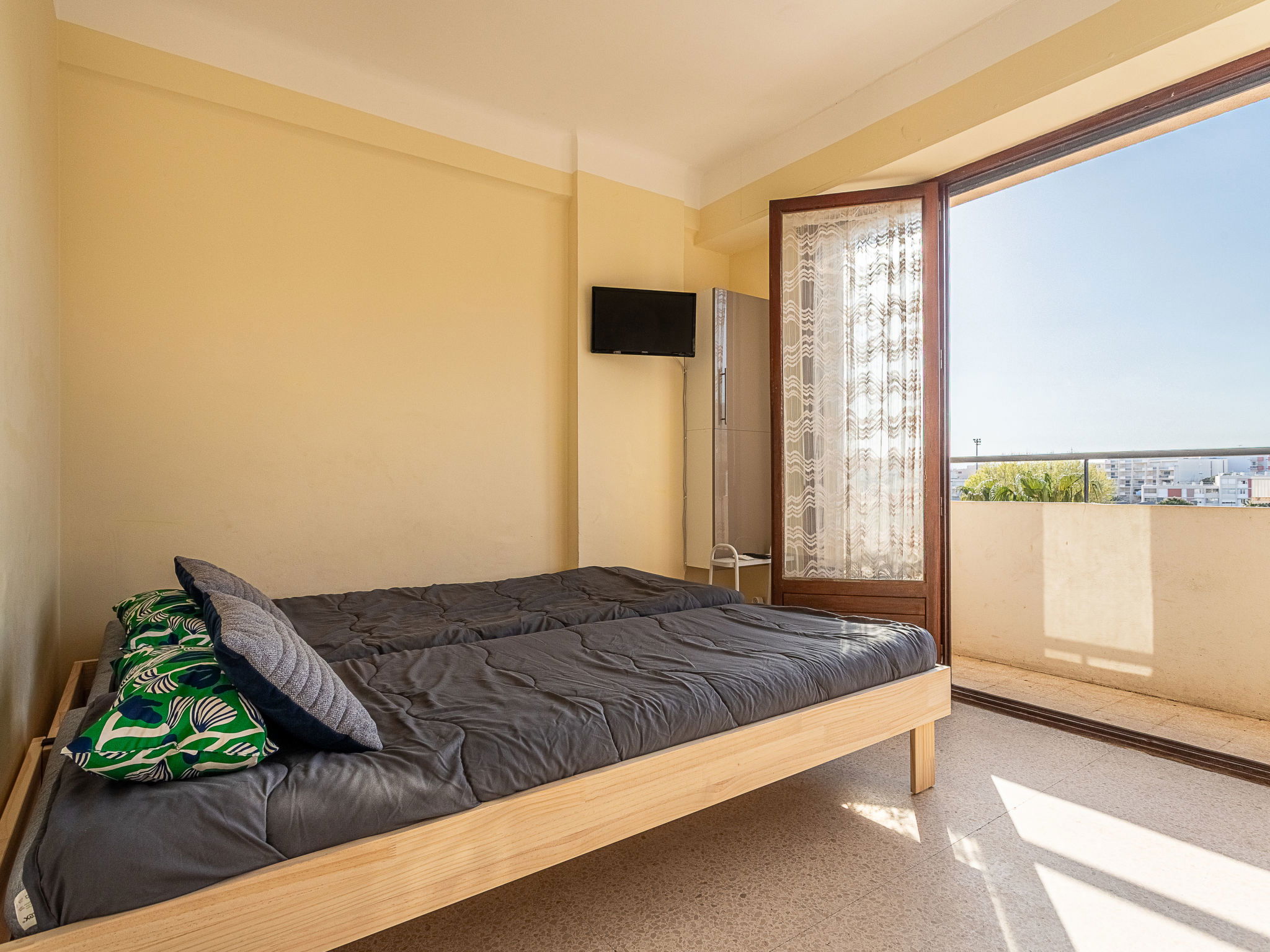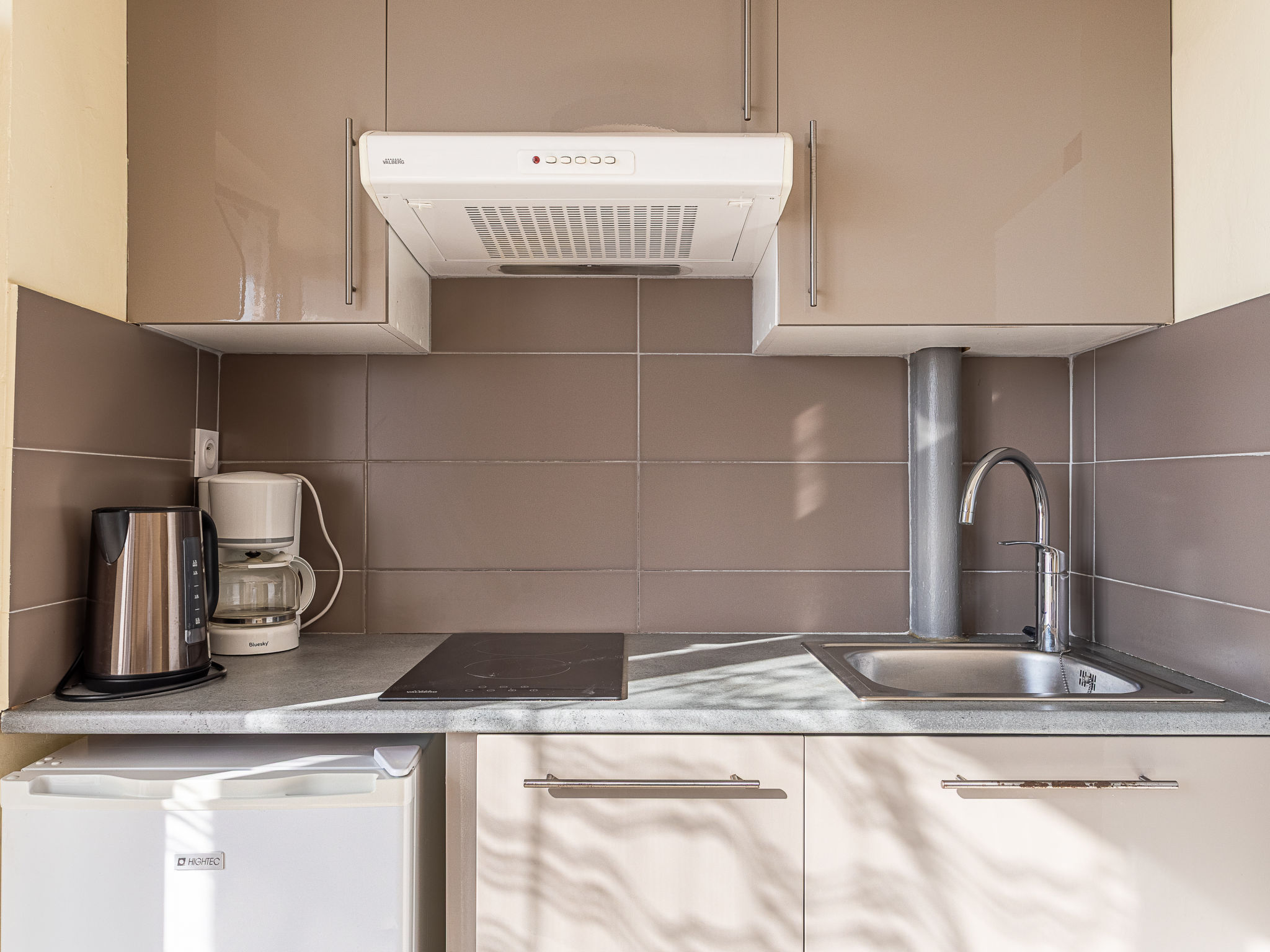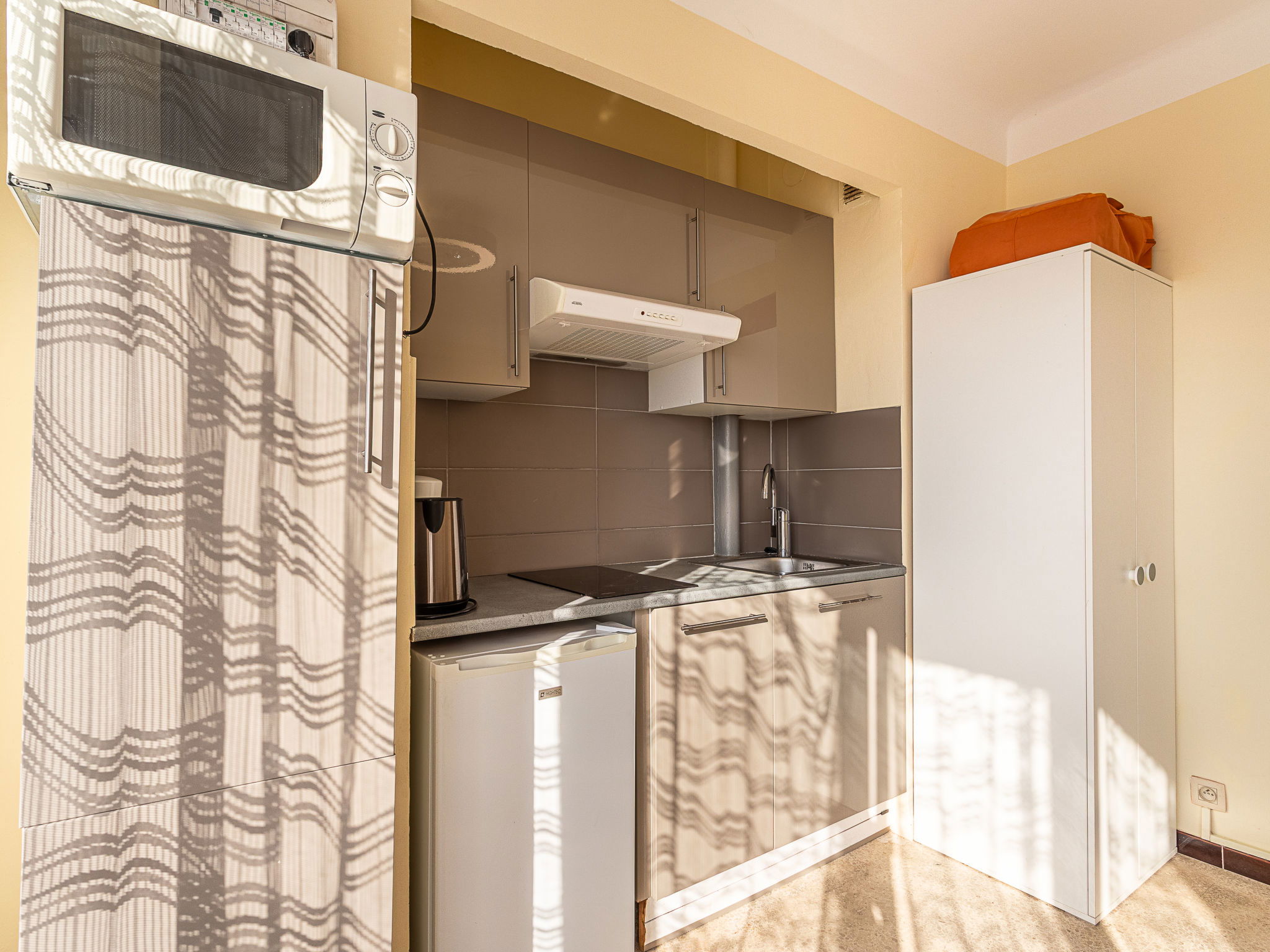 1-room studio 15 m2 on 3rd floor. Bright, simple furnishings: living/sleeping room with 1 double sofabed (2 x 80 cm, length 190 cm), dining table and TV (flat screen). Kitchenette (2 ceramic glass hob hotplates, toaster, kettle, microwave, electric coffee machine). Shower/WC. Electric heating. Balcony 6 m2. View of the resort. Facilities: iron, hair dryer. Internet (WiFi, extra). Please note: apartment street side. Non-smokers only, no parking. Maximum 1 pet/ dog allowed. Smoke alarm. 830700002755L