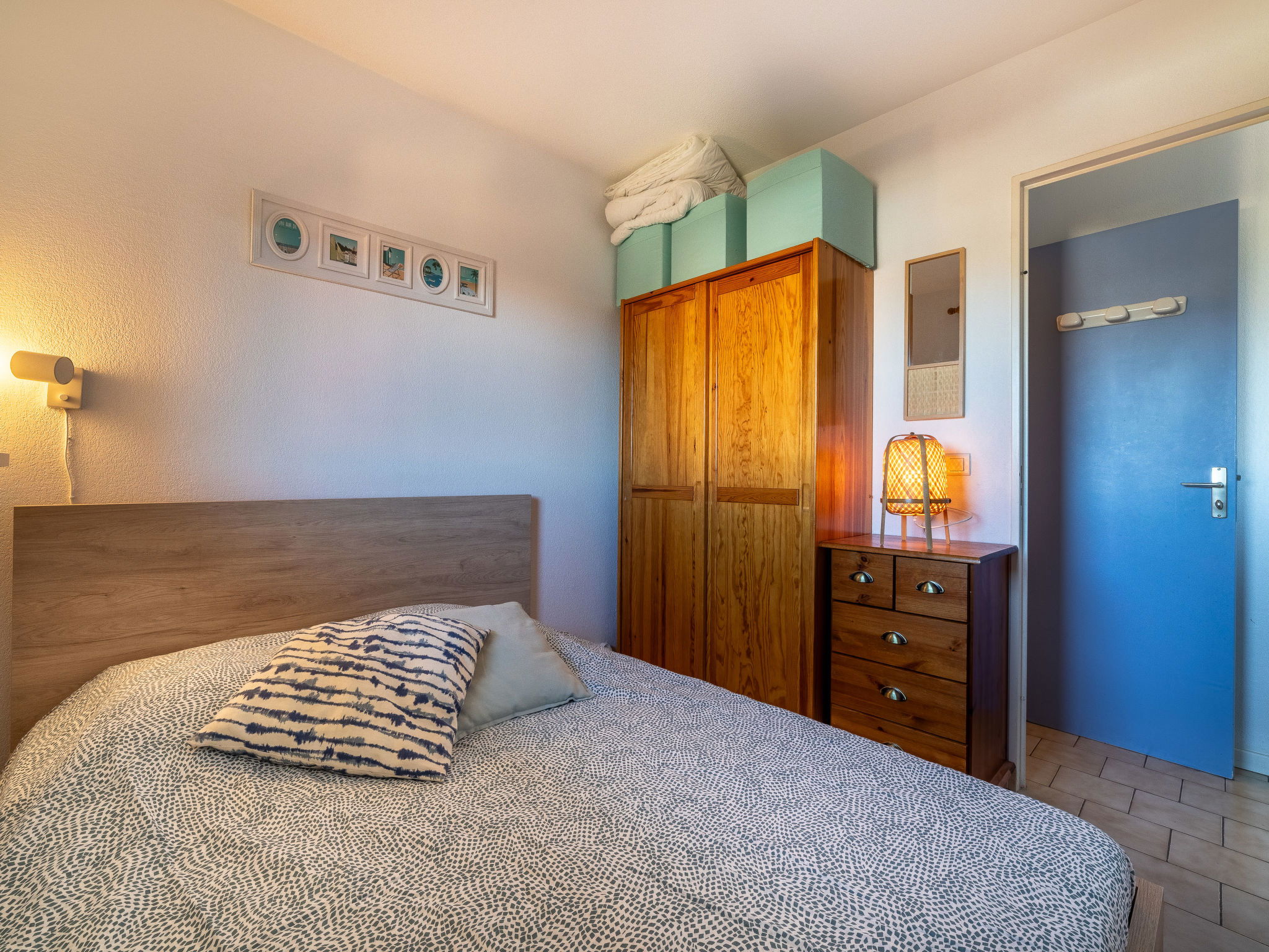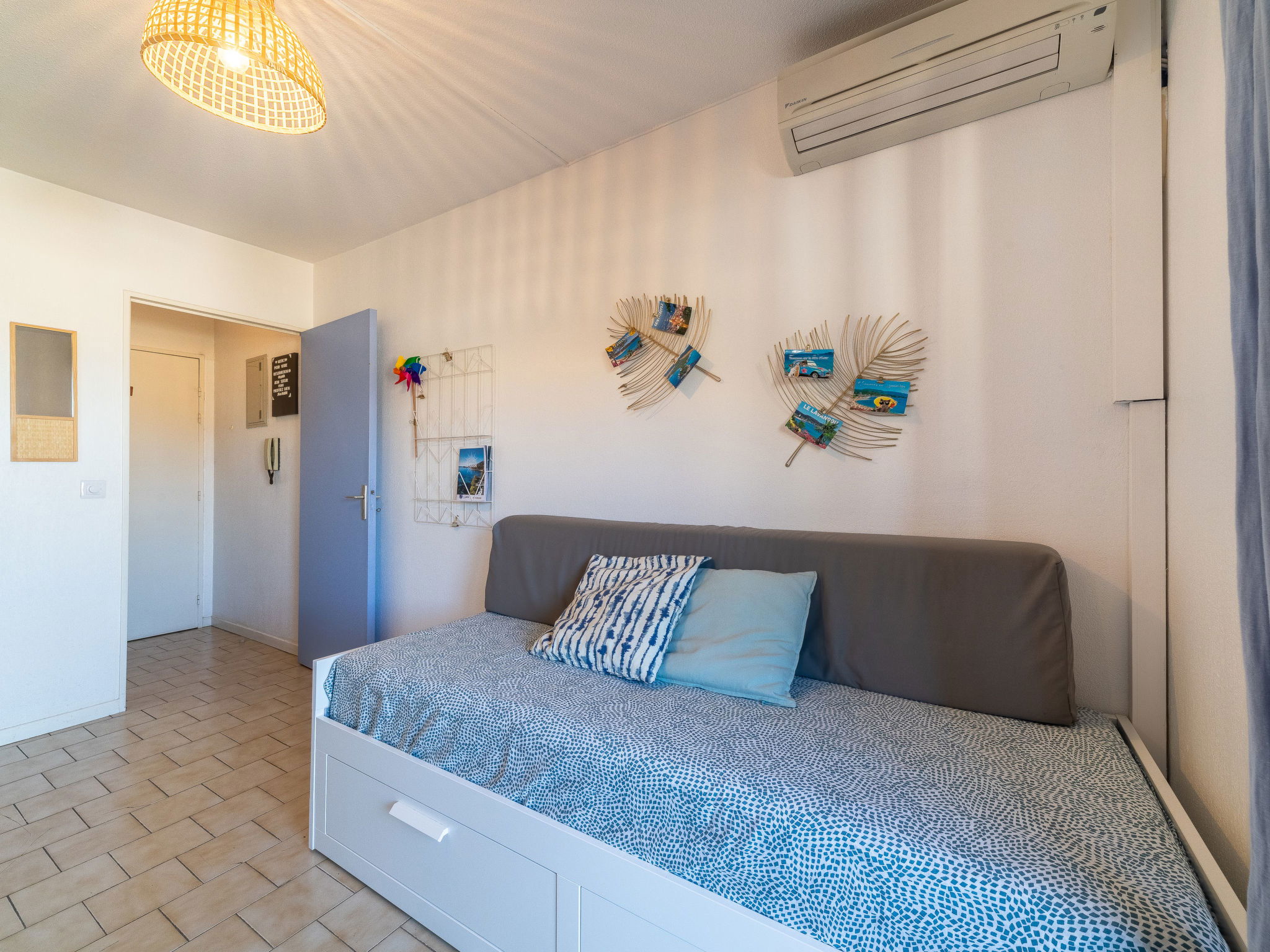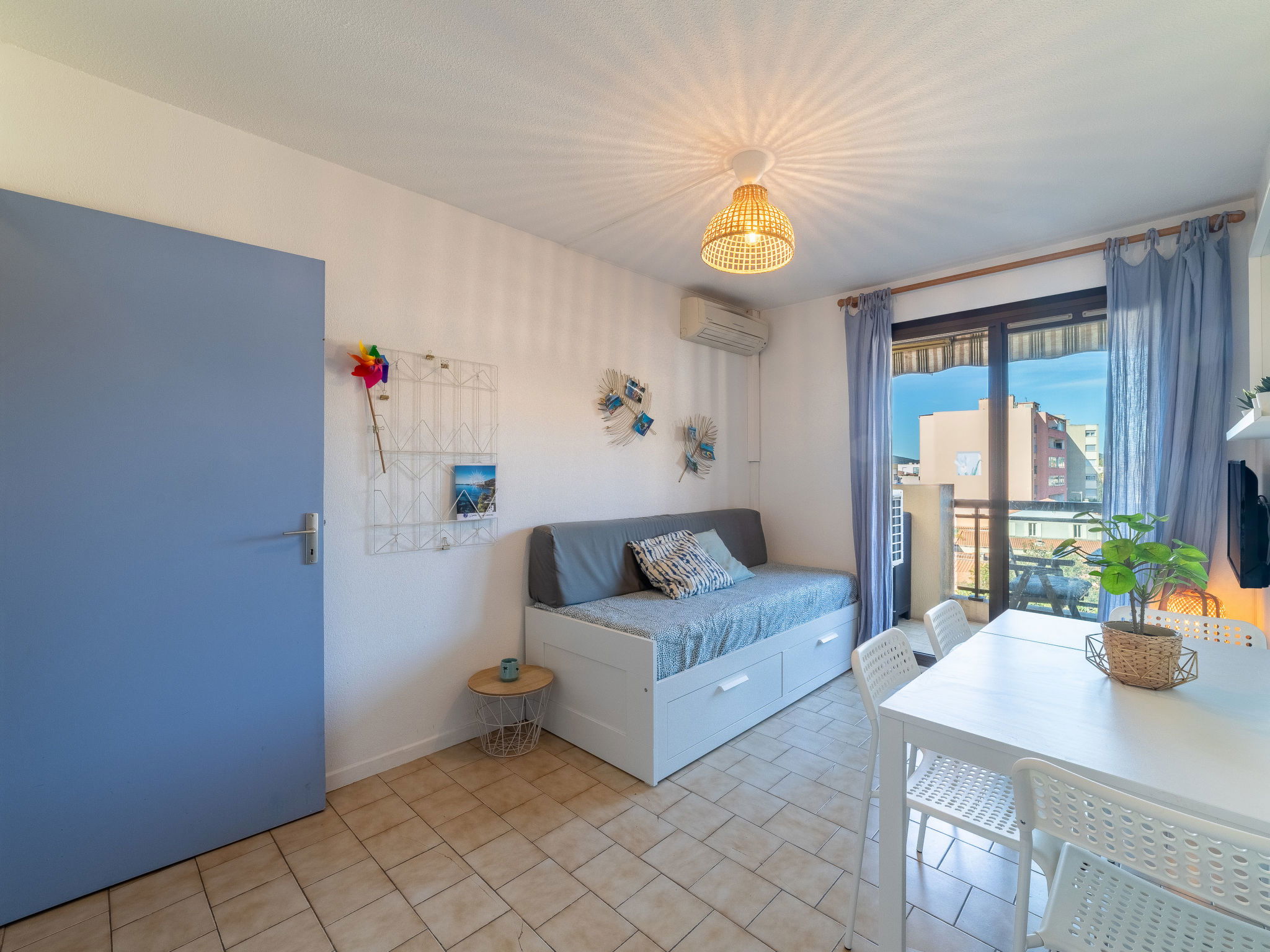 2-room apartment 23 m2 on 4th floor. Comfortable furnishings: living room with 1 pull-out bed (2 pers. 2 x 80 cm, length 190 cm), TV (flat screen), air conditioning. Exit to the terrace. 1 room with 1 french bed (1 x 140 cm, length 190 cm). Kitchenette (2 hot plates, toaster, kettle, electric coffee machine, Capsules for coffee machine (Nespresso) extra, combination microwave). Bathroom, sep. WC. Electric heating. Terrace 7 m2. Facilities: iron, hair dryer. Internet (WiFi, free). Parking space n 574 at 500 m. Please note: apartment street side. Non-smokers only. Maximum 1 pet/ dog allowed. Smoke alarm. 83070001350BQ