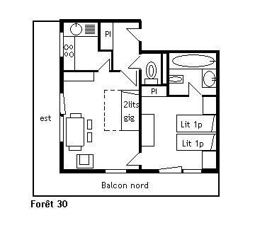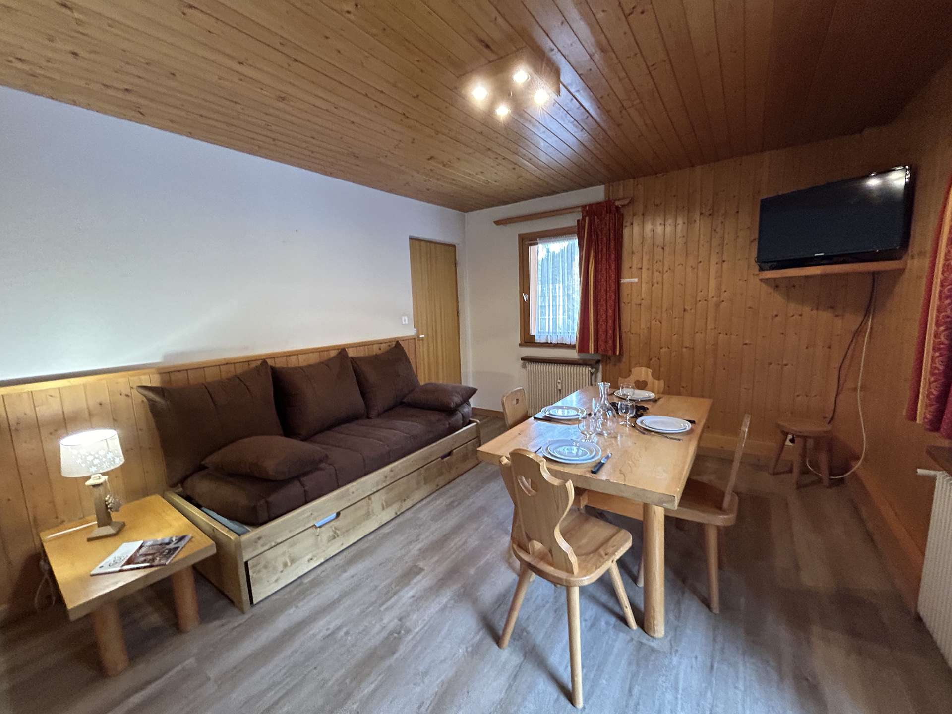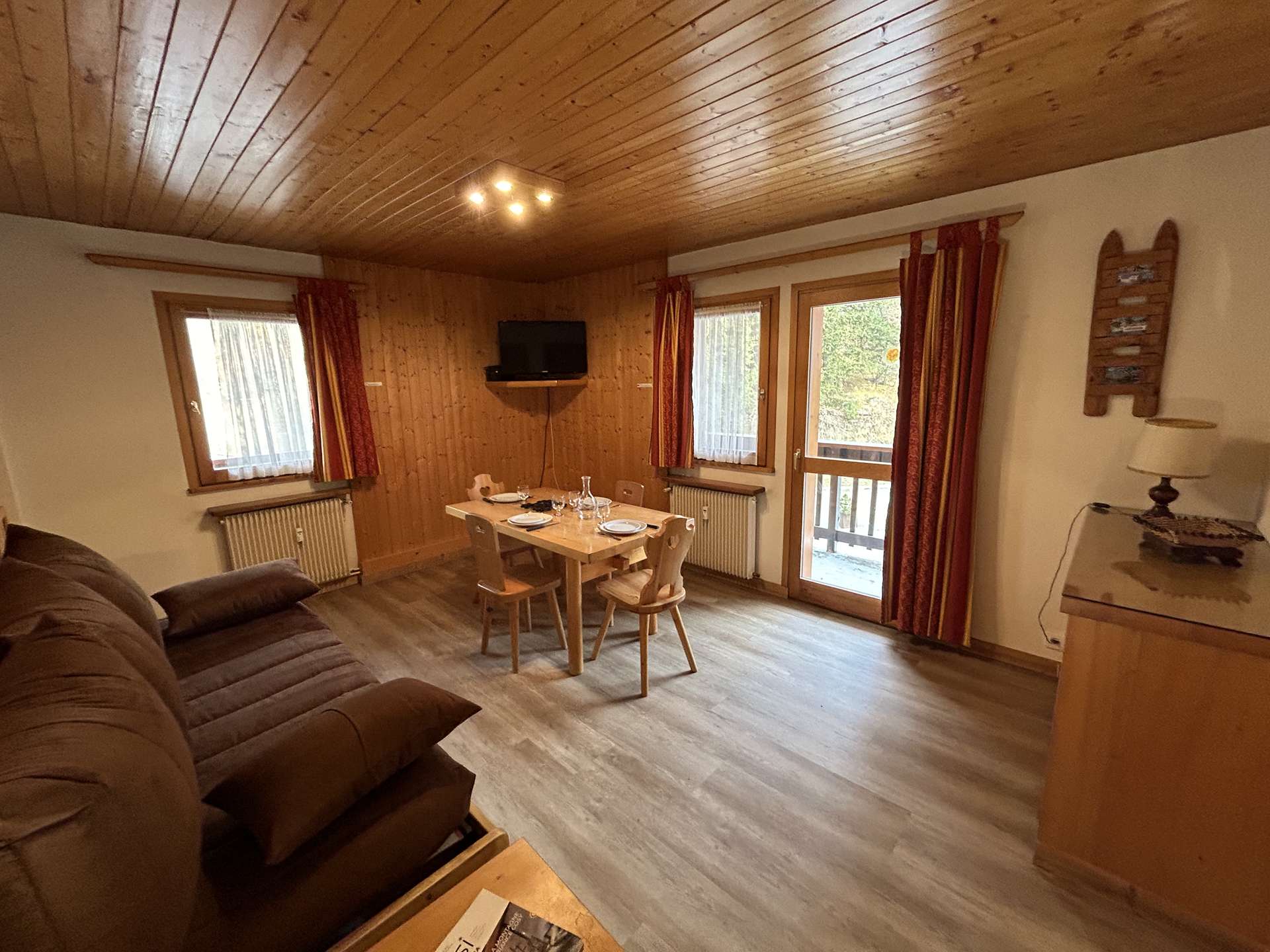 This rental in the mountains, located on the third floor by elevator, includes an equipped kitchen with washing machine, a television living room (north and east balcony) with a set of two pull-out beds, a bedroom with 2 single beds, a bathroom and a separate toilet, 1 ski locker (high ground floor)