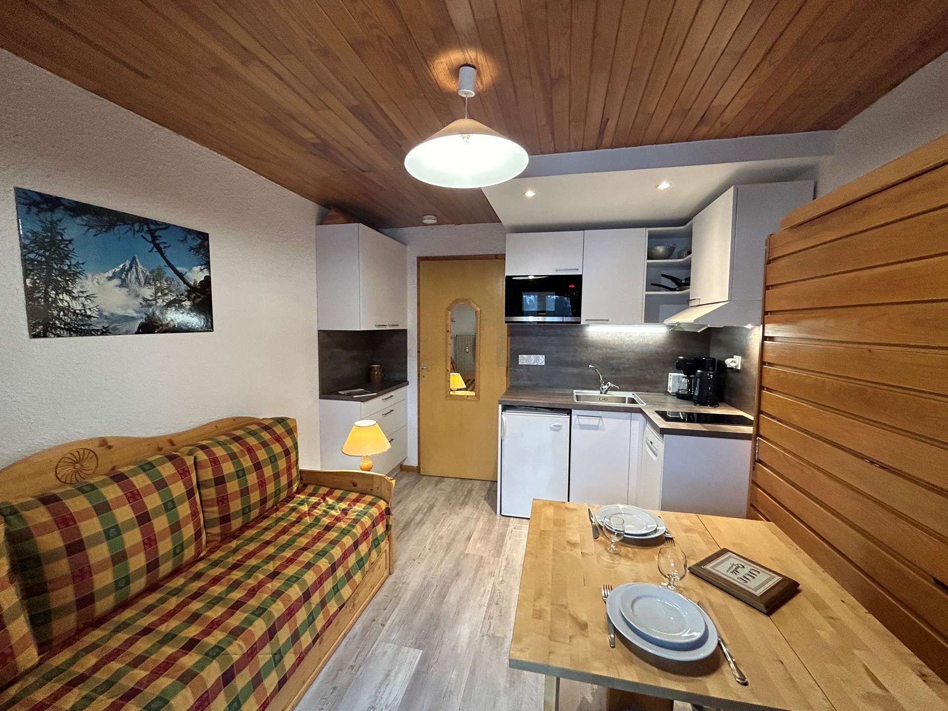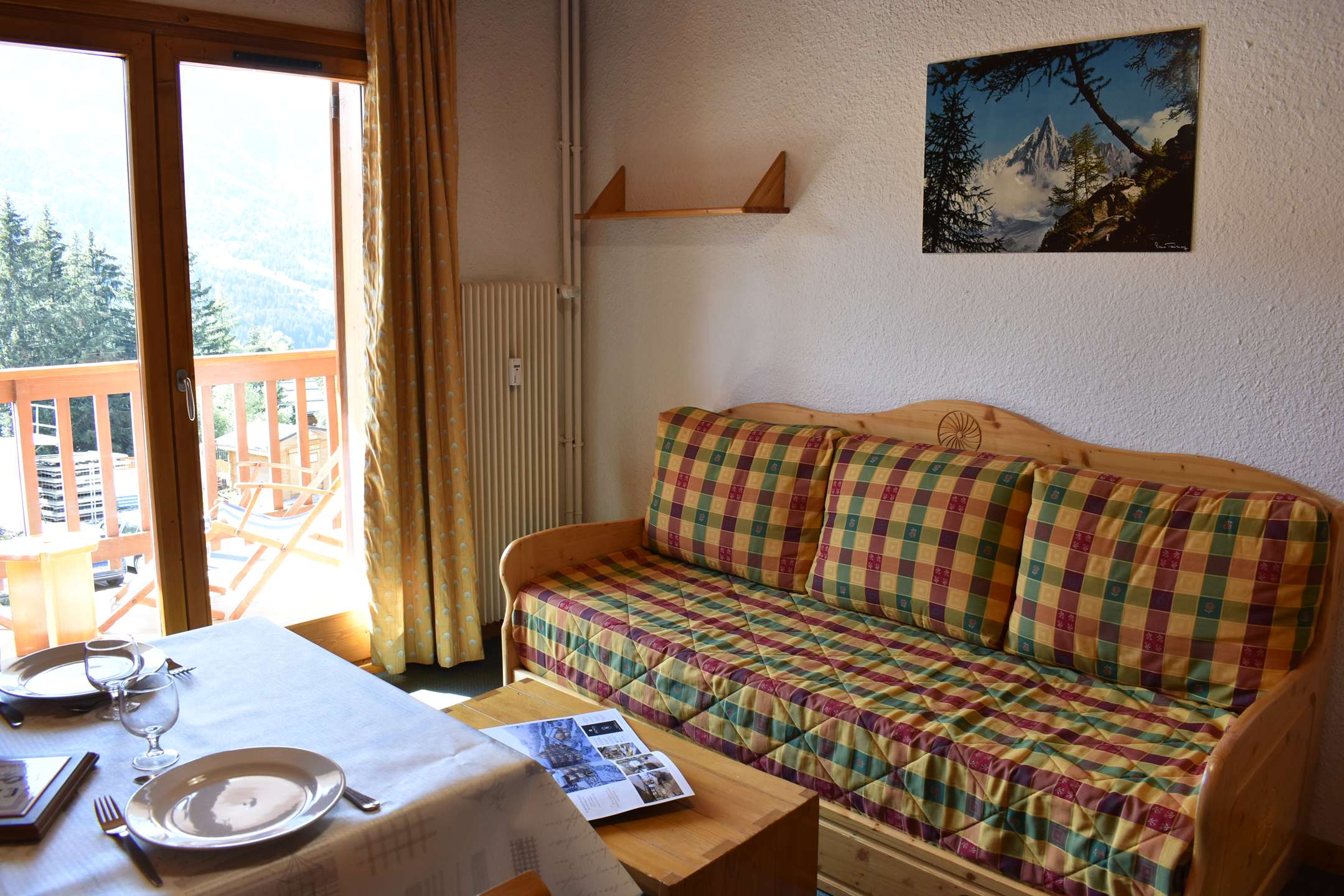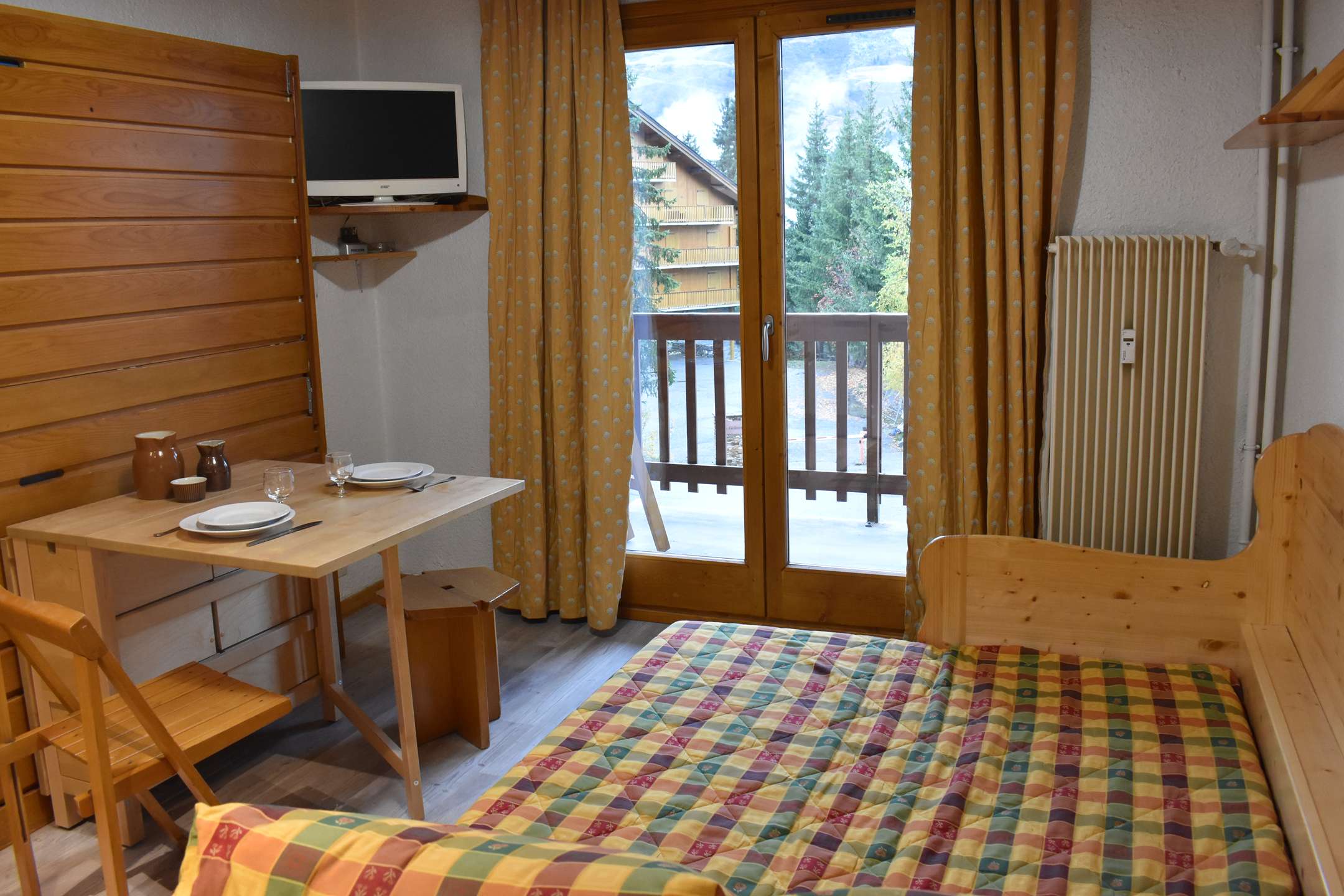 This studio apartment in the mountains located on the 1st floor includes a living room with a 140 cm pull-out sofa bed, a television and a west-facing balcony offering a lovely view of the mountains, a kitchen, 1 bathroom with WC. A ski locker is available at the entrance level.